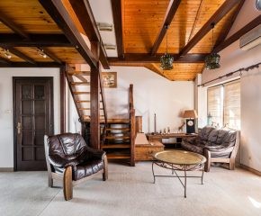 PODDASZE – kuchnia, przestronny salon z antresolą i wyjściem na balkon, sypialnia z przeszkloną ścianą, łazienka z WC