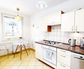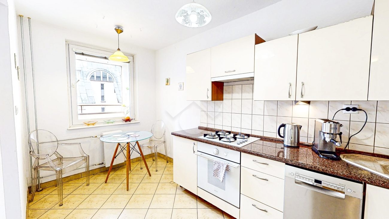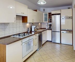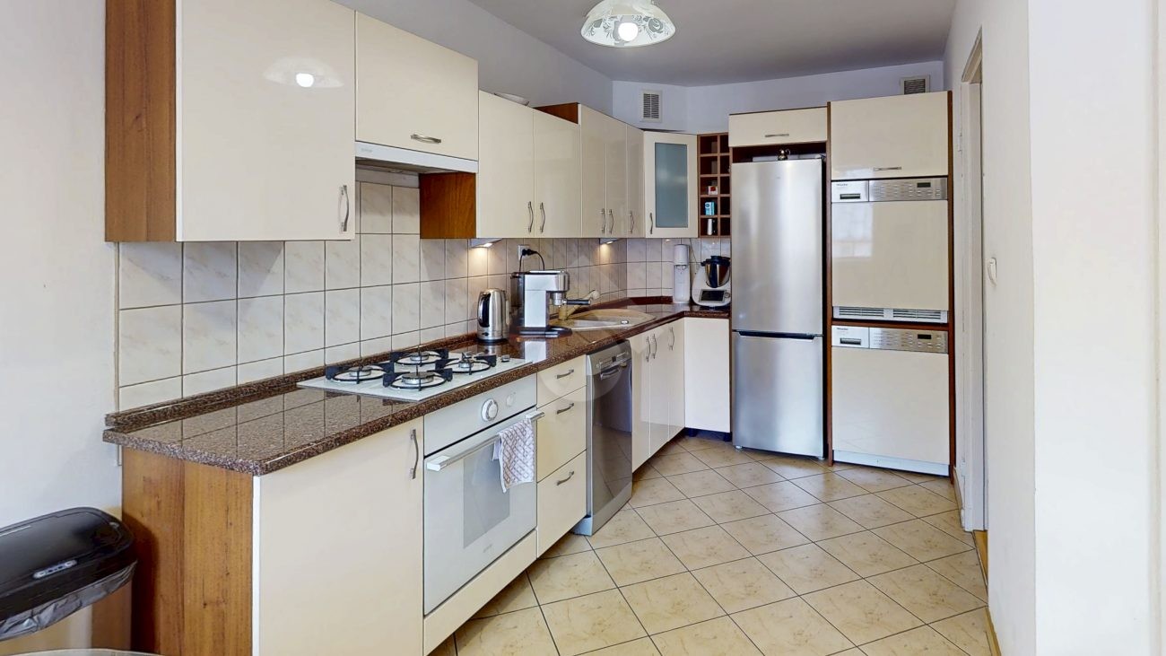 W pełni umeblowana kuchnia zawiera sprzęt najwyższej klasy – Miele (pralka oraz suszarka), płytę indukcyjną z piekarnikiem (Nardi) oraz okapem (Gorenje), zmywarkę (Bosh) i lodówkę.