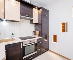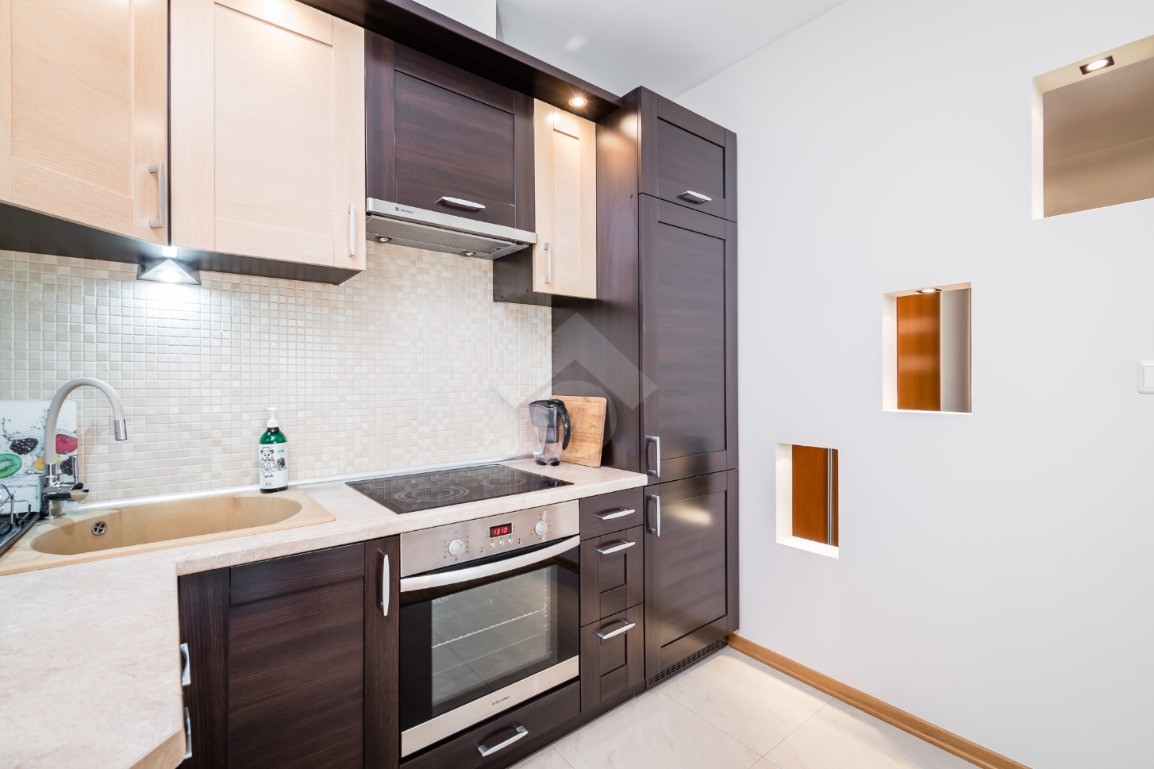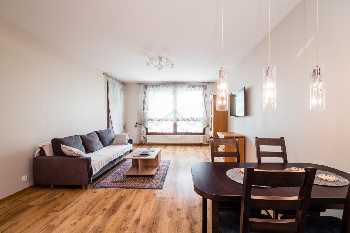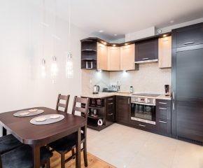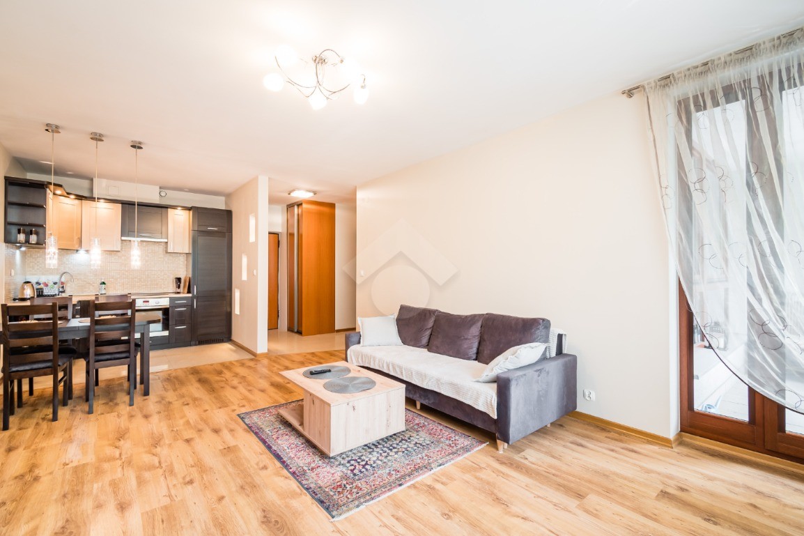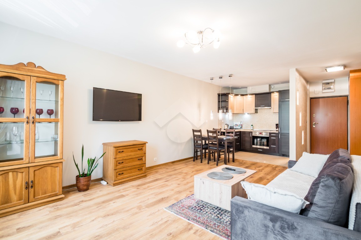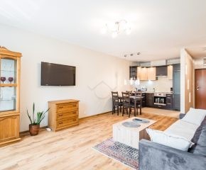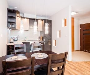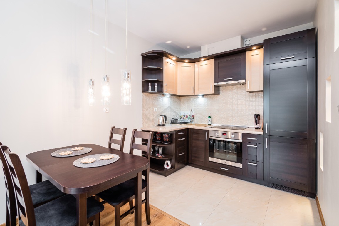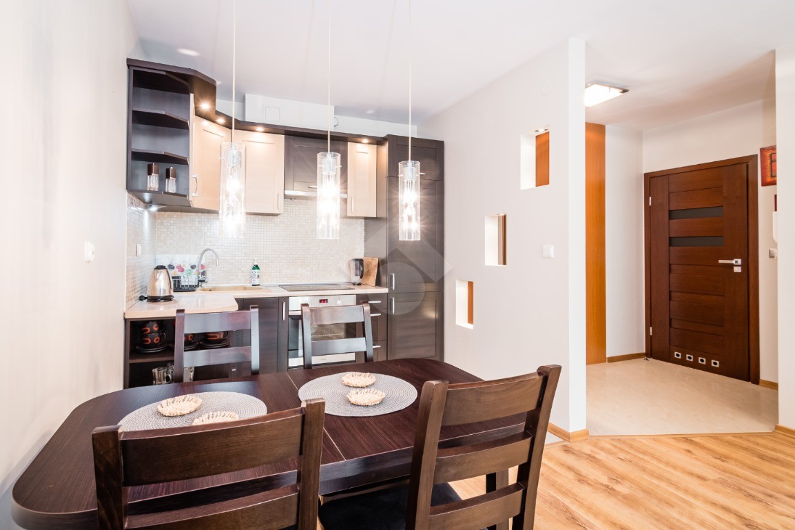 W przedpokoju znajduje się zabudowana szafa. Pokój dzienny wyposażony został w sofę, stolik, komodę oraz TV. W części kuchenno-jadalnianej znajdziemy zabudowę kuchenną na wymiar wraz ze sprzetami AGD, w tym lodówkę, piekarnik, plytę indukcyjną, a także stół z czterema krzesłami. Sypialnia jest wyposażona w duże komfortowe łóżko, biurko oraz zabudowaną szafę z lustrem.