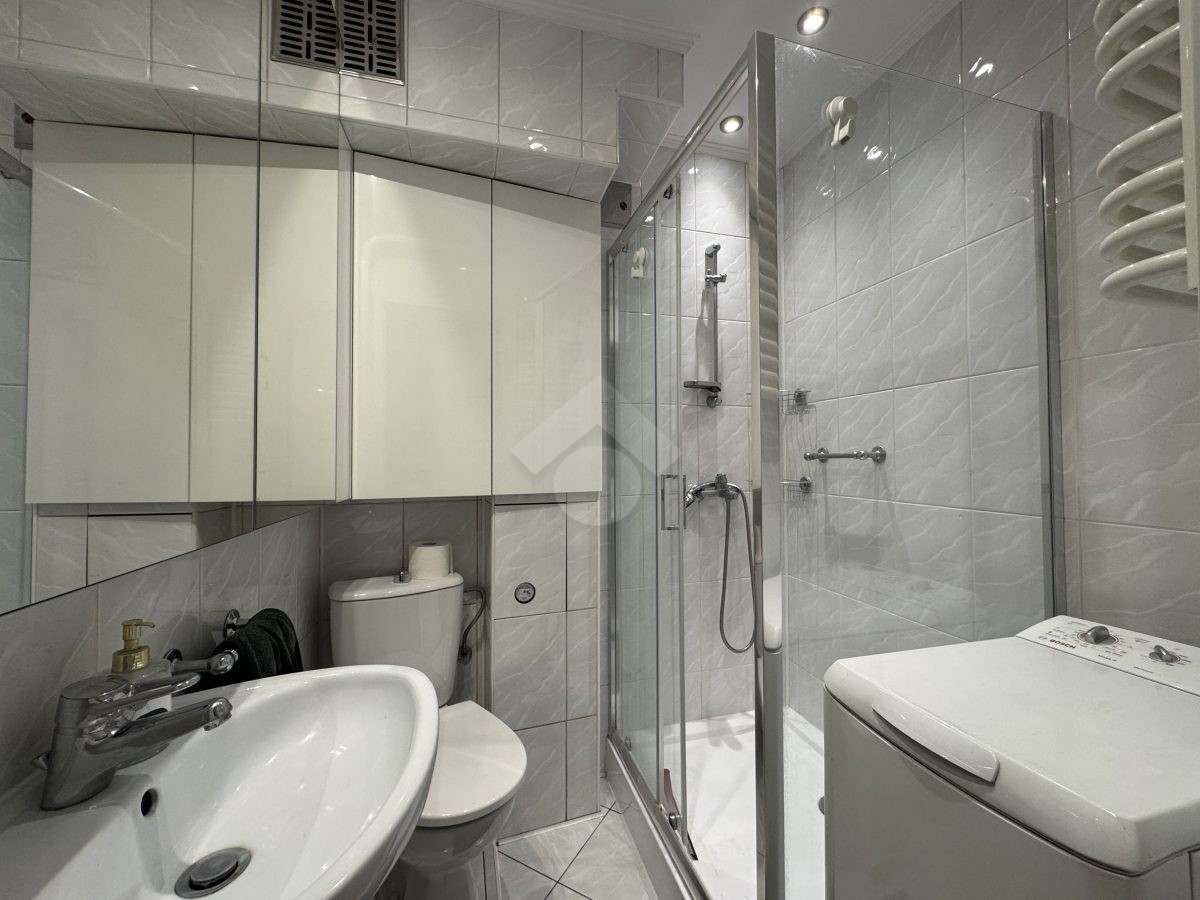 W łazience znajdują się: prysznic, umywalka, WC oraz pralka.