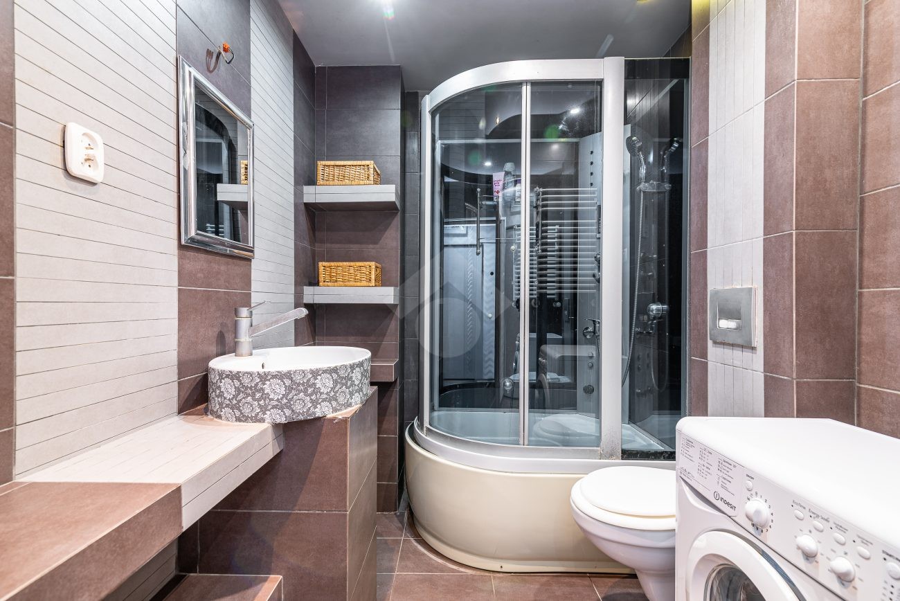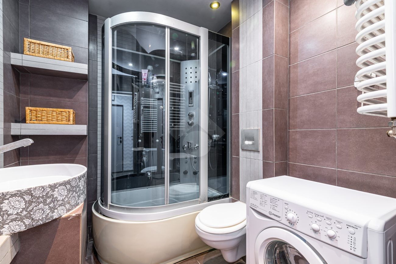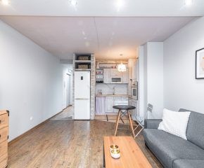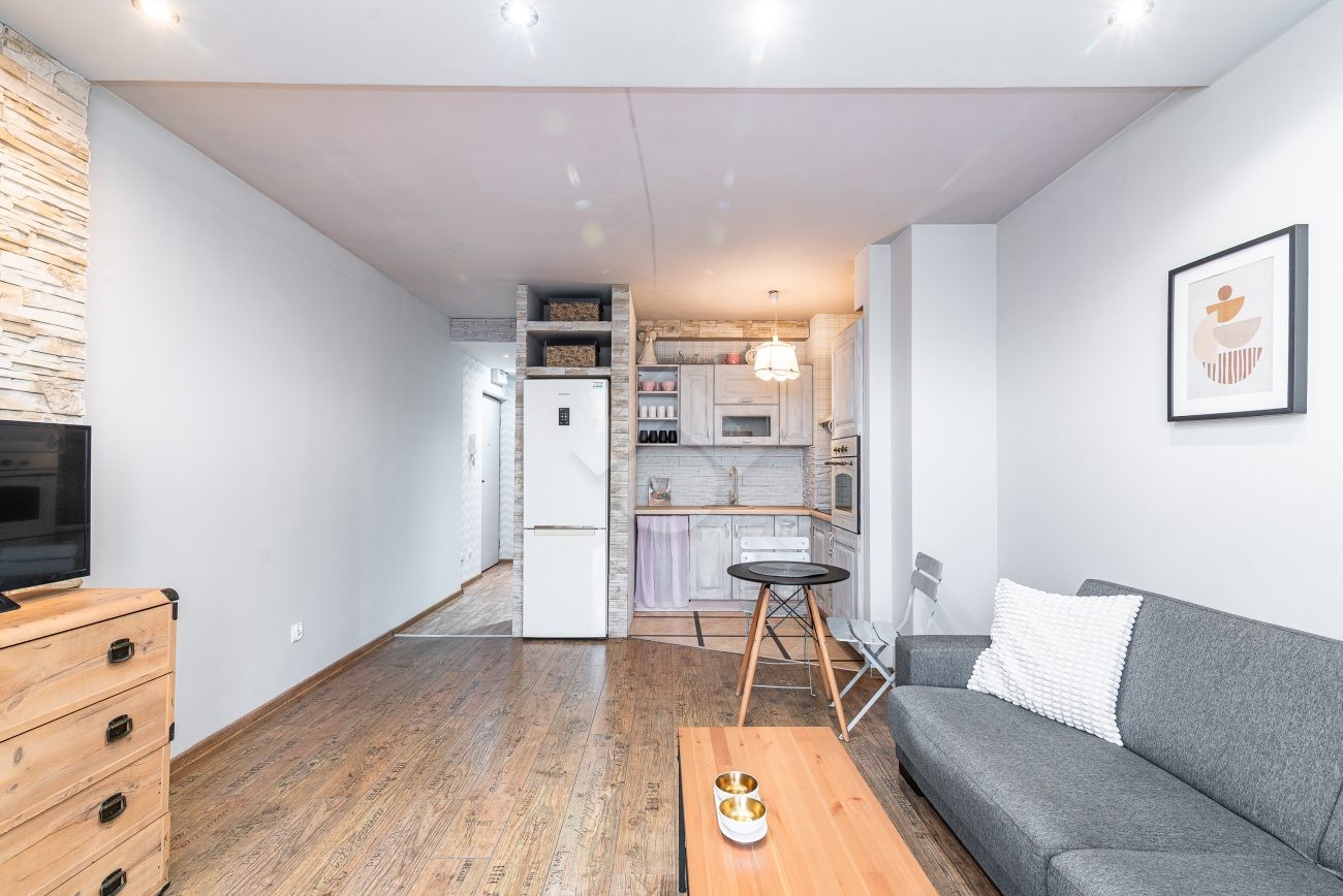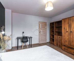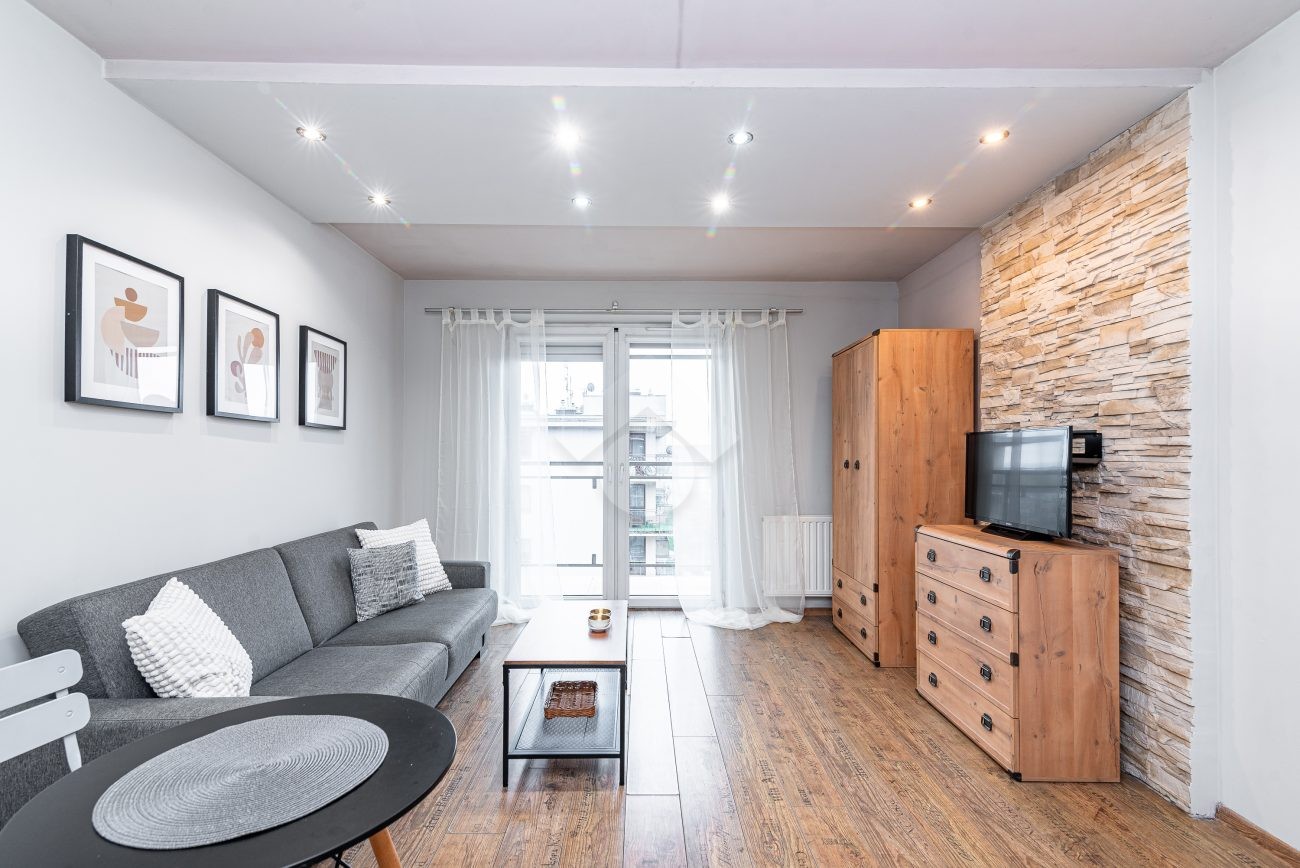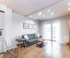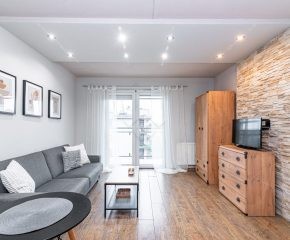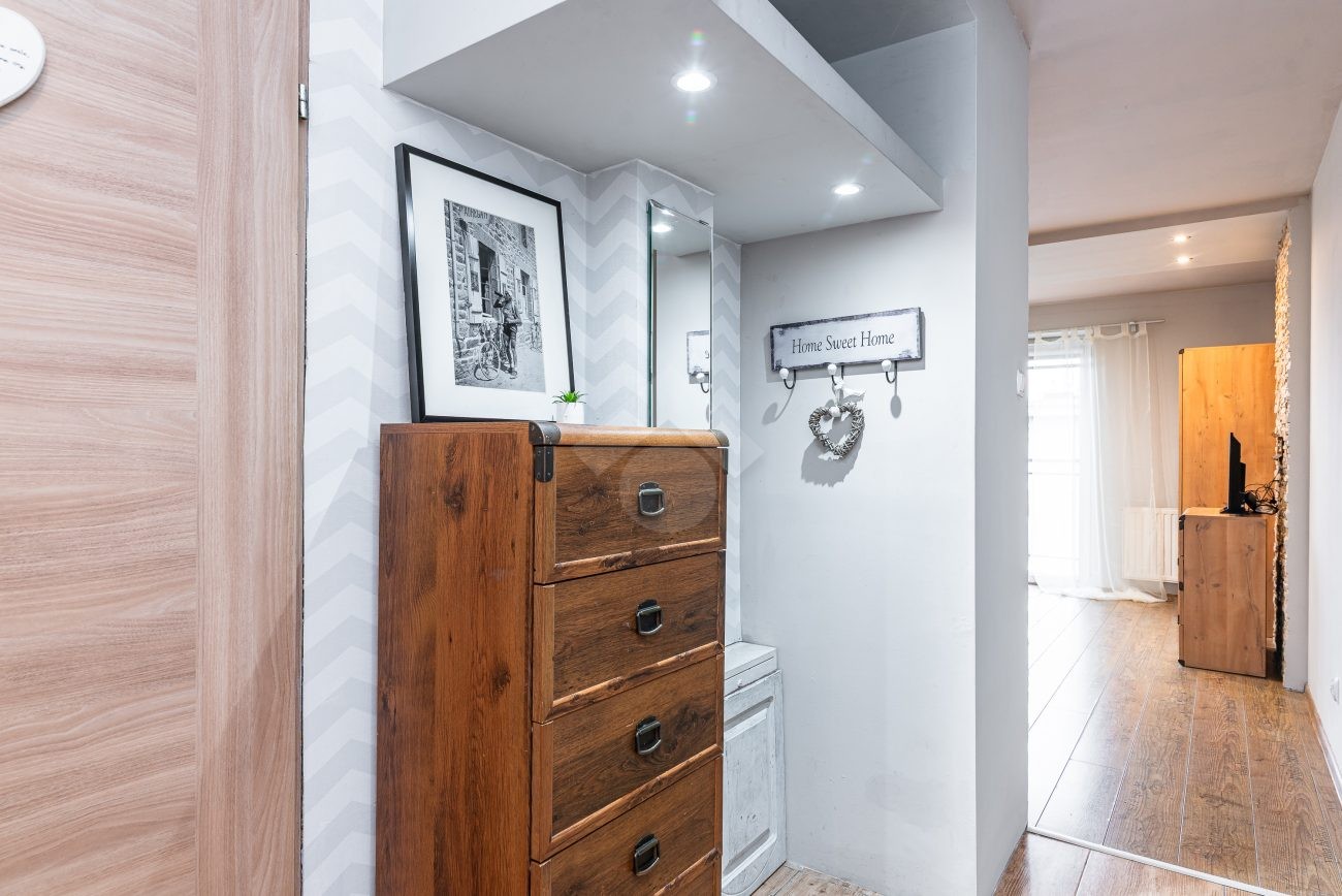 Stan nieruchomości: DOBRY. W salonie z  aneksem kuchennym znajduje się rozkładana sofa, stół, szafa, piekarnik, płyta indukcyjna oraz lodówko-zamrażarka. W łazience kabina prysznicowa, umywalka oraz pralka. Sypialnia wyposażona w łóżko dwuosobowe oraz pojemną szafę.