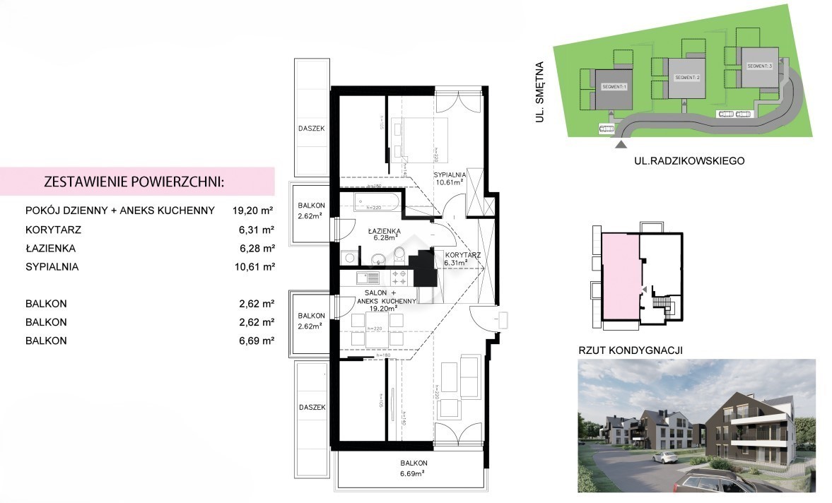 Nieruchomość: Proponujemy Państwu do kupna dwupokojowe mieszkanie o powierzchni 42,40m² znajdujące się na drugim piętrze w dwupiętrowym budynku z 2025 roku. Nieruchomość składa się z salonu z aneksem kuchennym (19,20m²), sypialni (pow. 10,61 m²), łazienki z WC (pow. 6,28m²) oraz przedpokoju (pow. 6,31m²). Do mieszkania przynależą trzy osobne balkony – dwa o pow. 2,62m² oraz 6,69m²