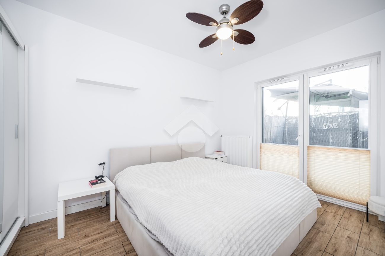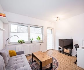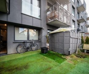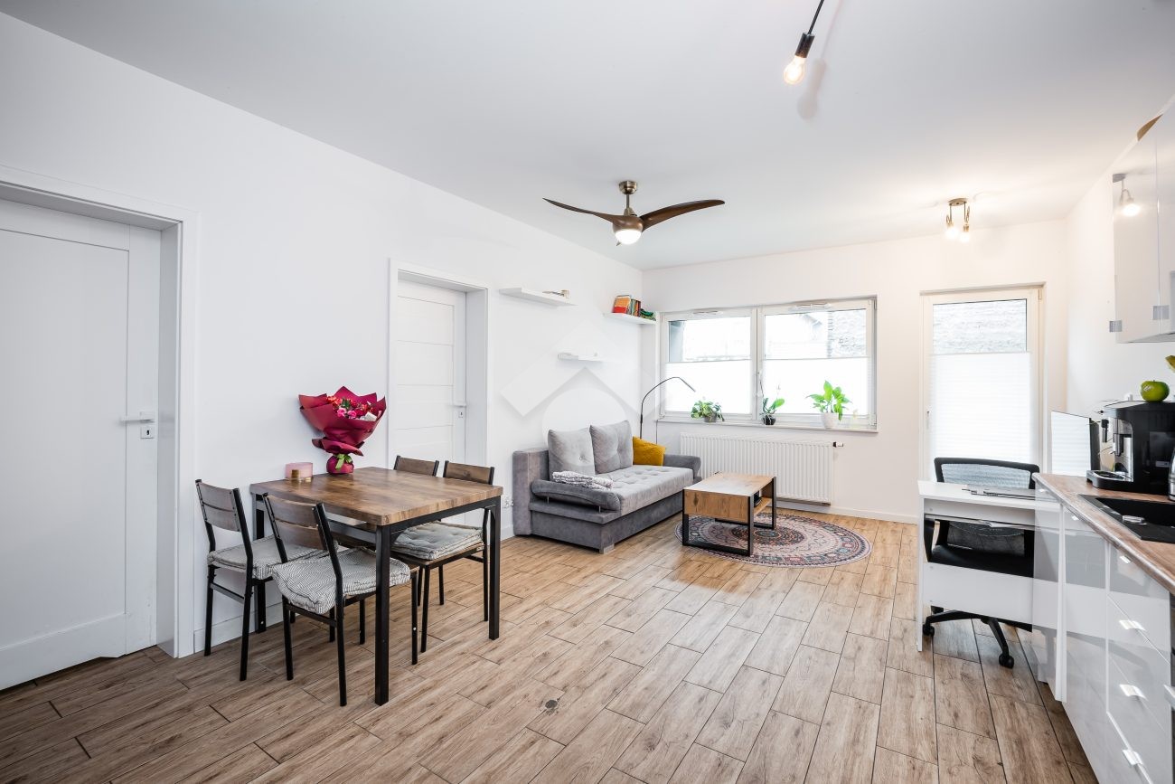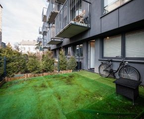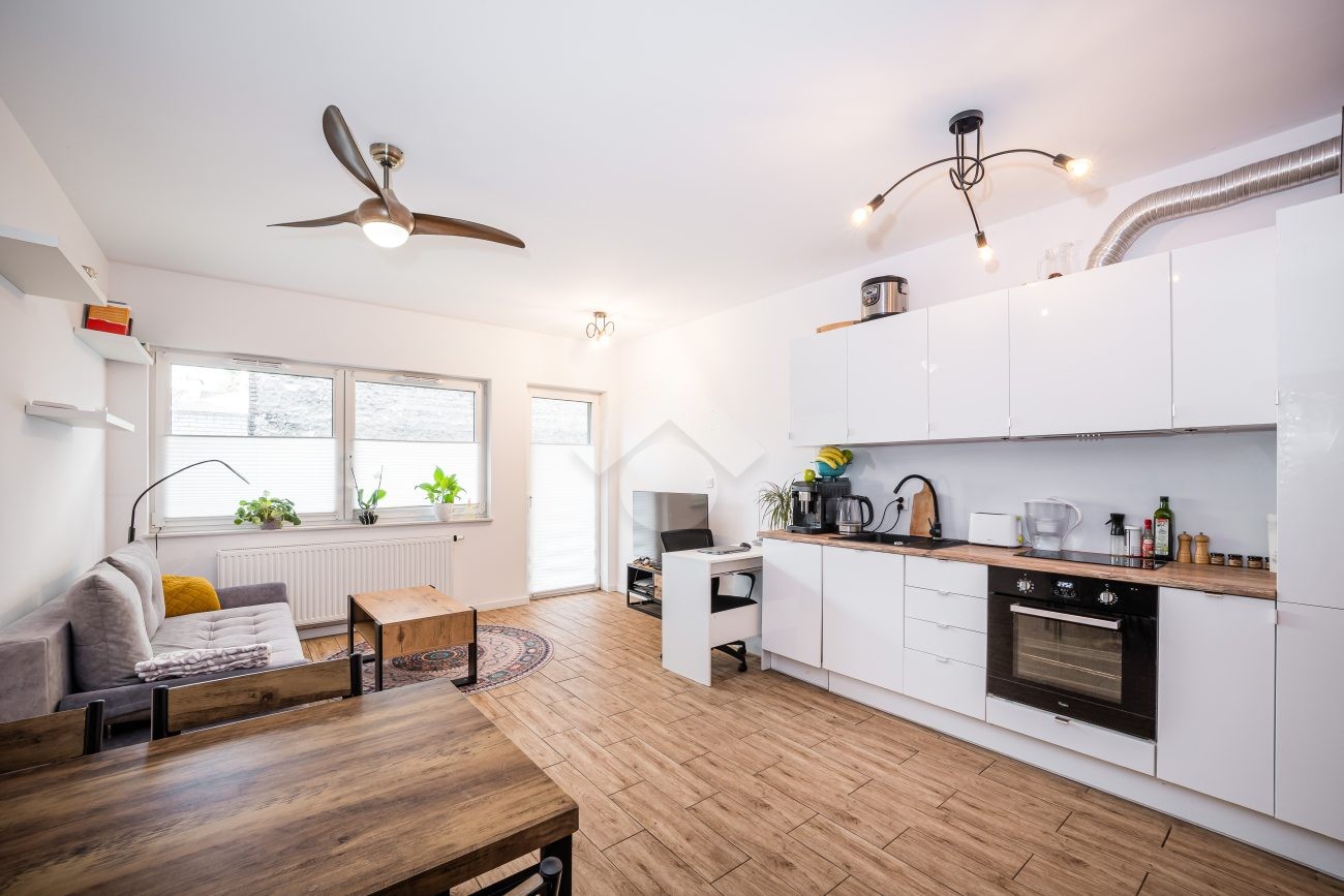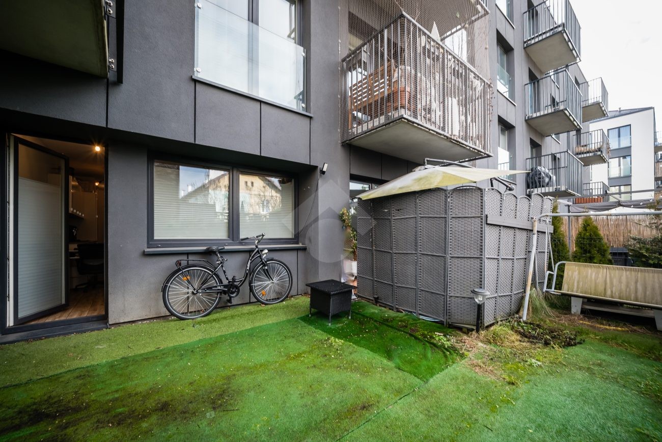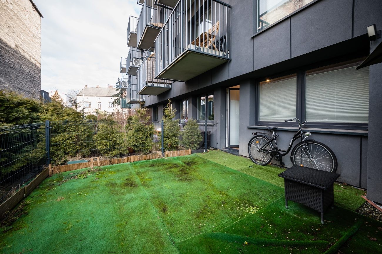 Stan mieszkania: bardzo dobry, gotowy do zamieszkania. Na podłodze płytki, w łazience położona glazura. W salonie znajduje się kanapa, sześcioosobowy stół jadalniany, przestrzeń do pracy przy biurku oraz telewizor. Wyjście do przynależnego ogrodu, w którym za parawanami znajduje się prywatne jacuzzi. Aneks kuchenny w zabudowie, w pełni wyposażony: płyta indukcyjna z piekarnikiem i okapem oraz lodówka. Łazienka z prysznicem i pralką. Dwa osobne pokoje, z czego jeden może pełnić funkcję biura lub dużej garderoby. Ogrzewanie i ciepła woda z sieci miejskiej.