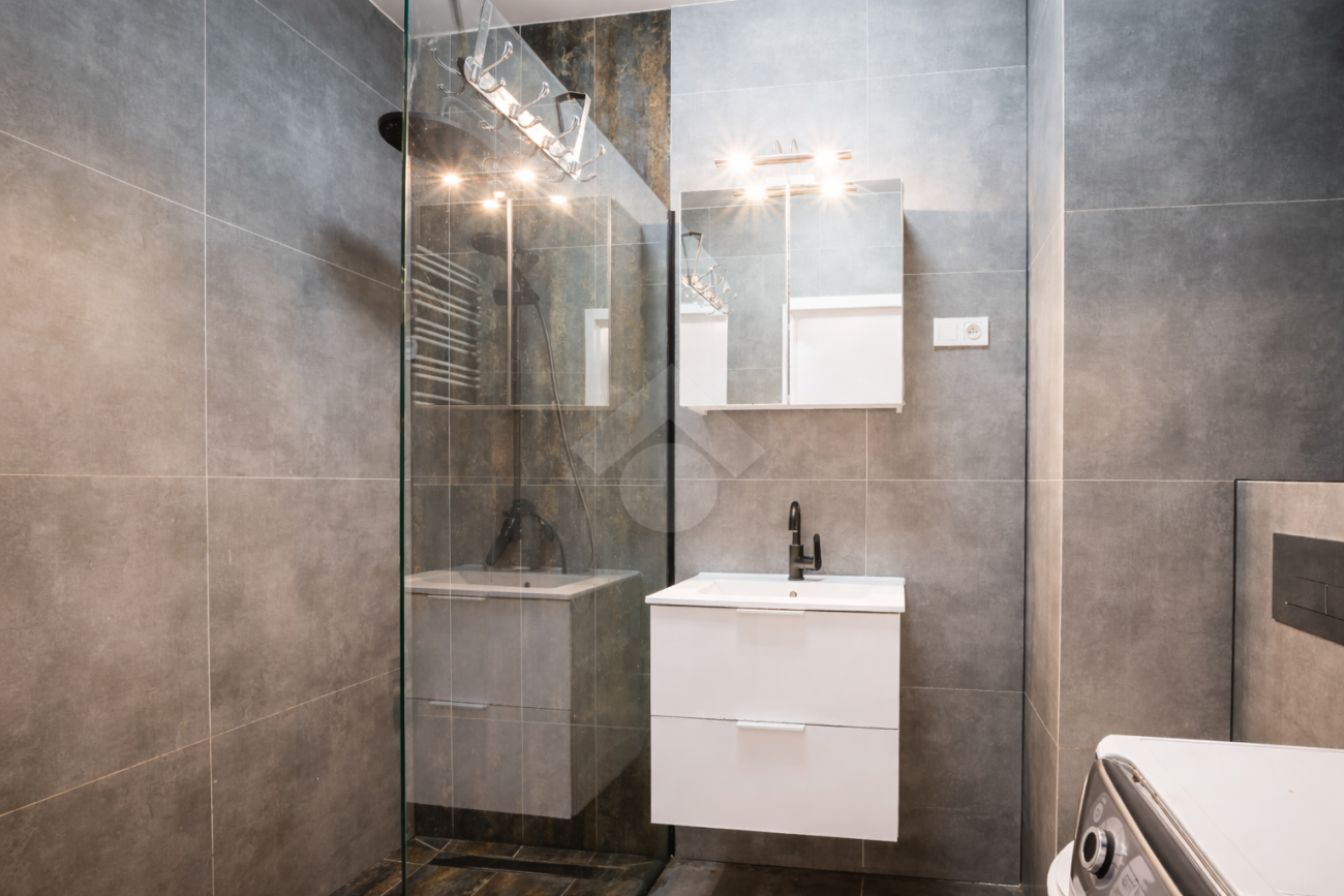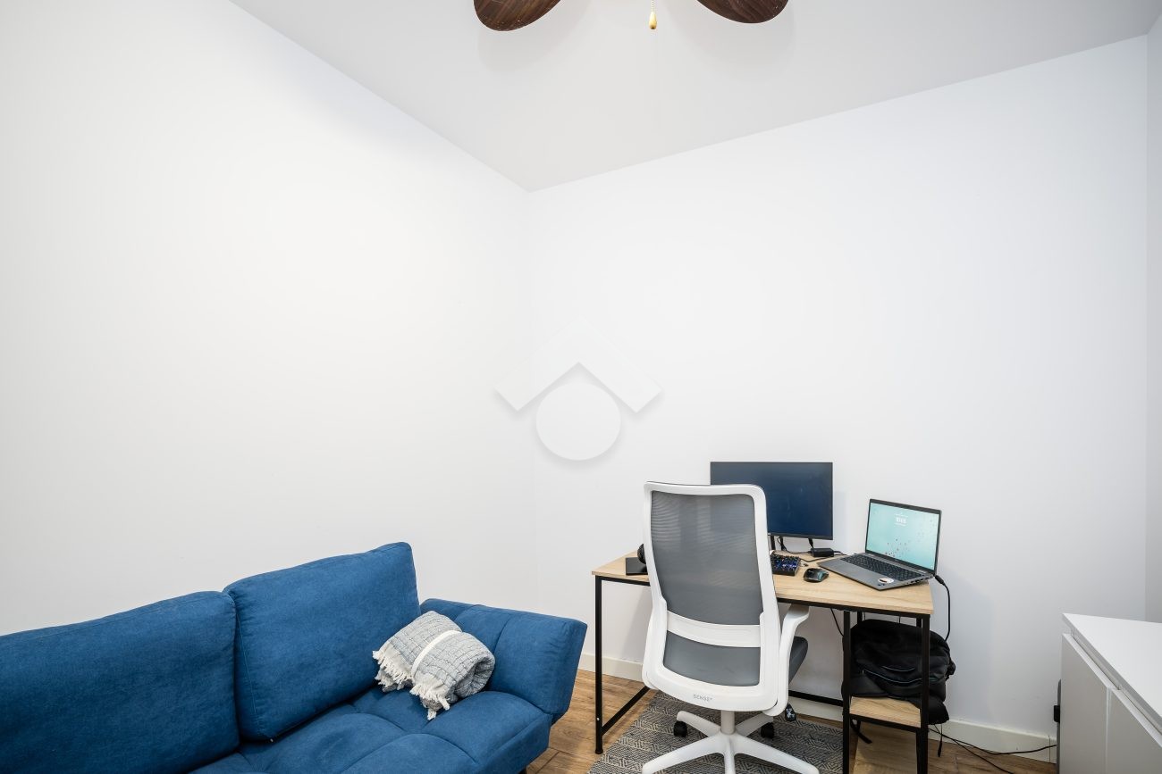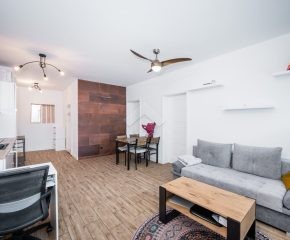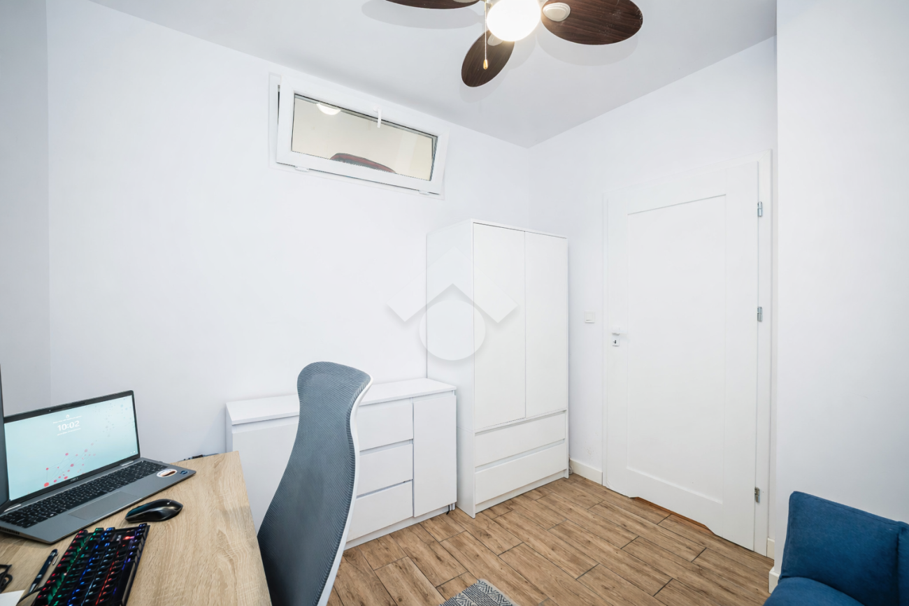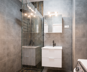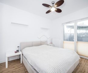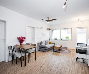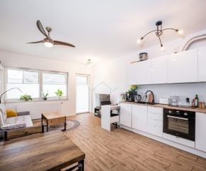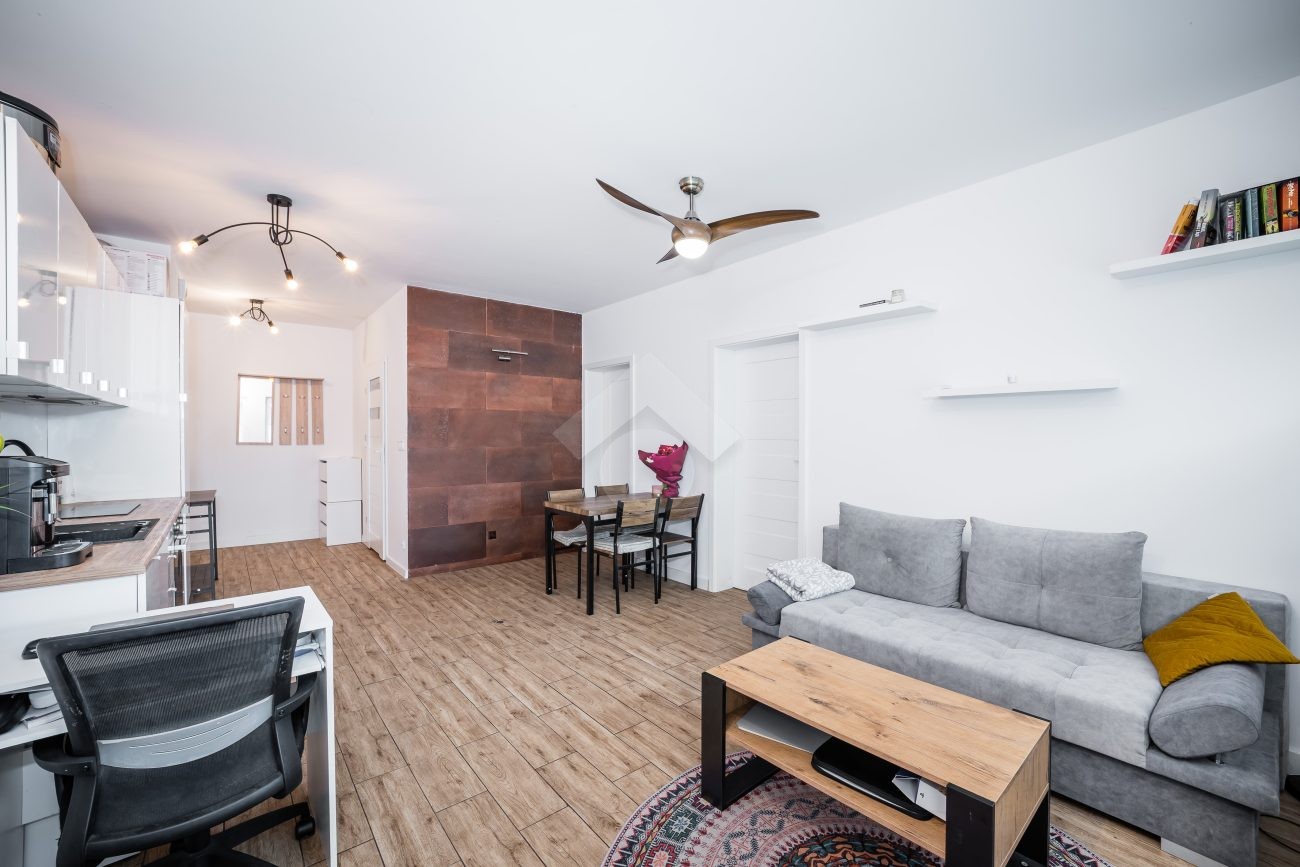 Stan mieszkania: bardzo dobry, gotowy do zamieszkania. Na podłodze płytki, w łazience położona glazura. W salonie znajduje się kanapa, sześcioosobowy stół jadalniany, przestrzeń do pracy przy biurku oraz telewizor. Wyjście do przynależnego ogrodu, w którym za parawanami znajduje się prywatne jacuzzi. Aneks kuchenny w zabudowie, w pełni wyposażony: płyta indukcyjna z piekarnikiem i okapem oraz lodówka. Łazienka z prysznicem i pralką. Dwa osobne pokoje, z czego jeden może pełnić funkcję biura lub dużej garderoby. Ogrzewanie i ciepła woda z sieci miejskiej.