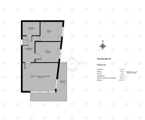 Property: Bright apartment with a total area of 56 m², consisting of two bedrooms, a spacious living room with an open-plan kitchen, a bathroom, a hallway, and a balcony. Additional parking is available behind the building. The apartment also includes a large basement storage unit.