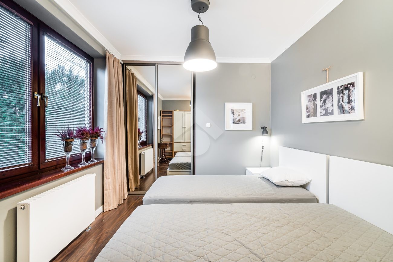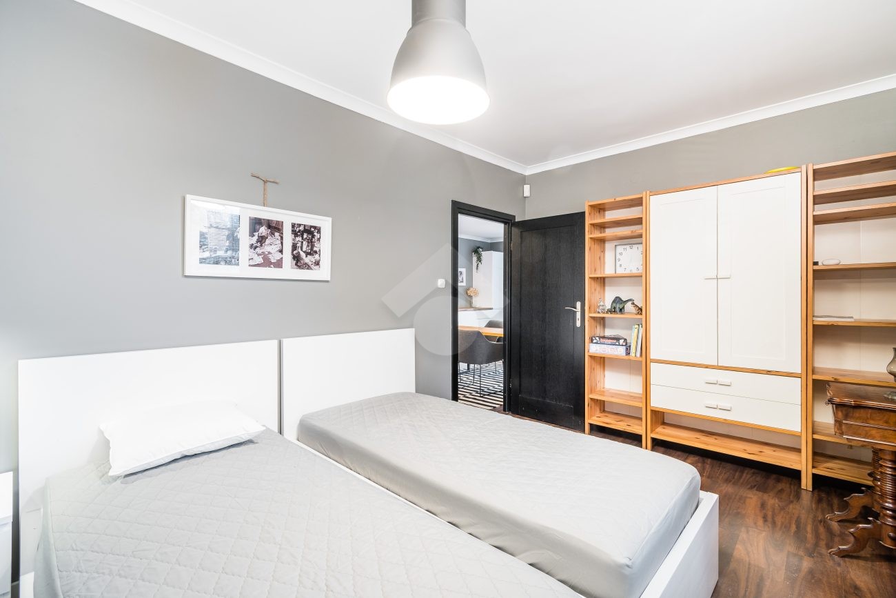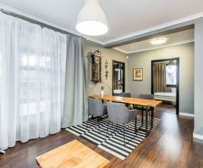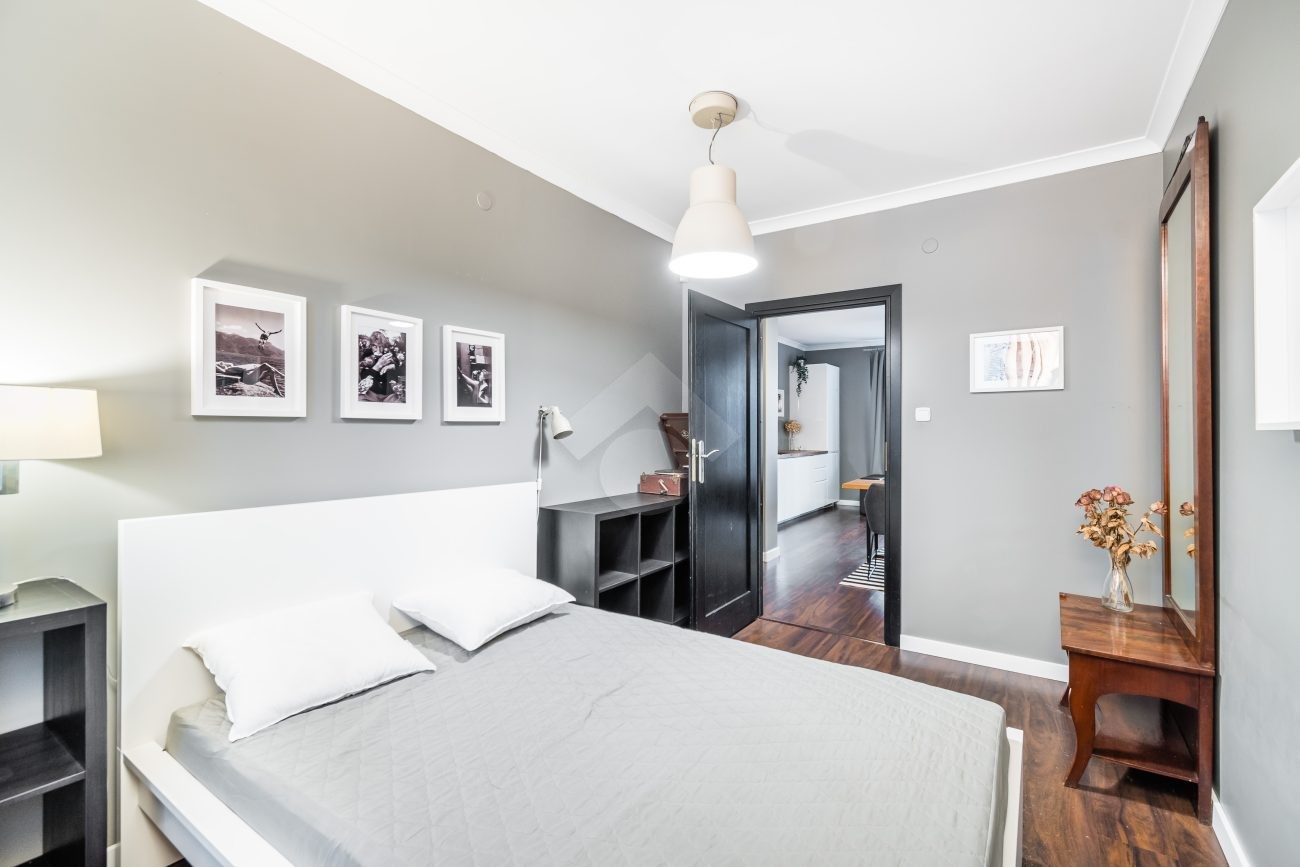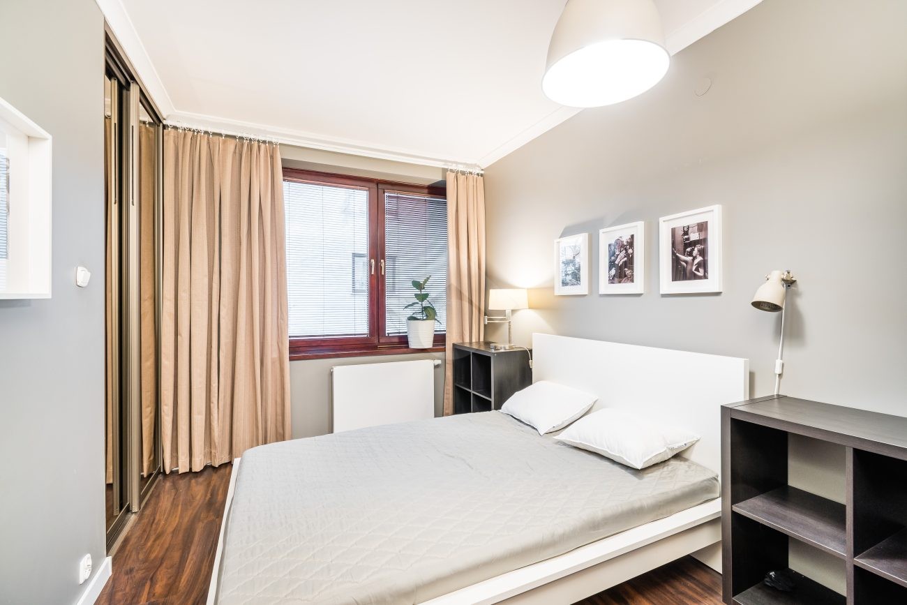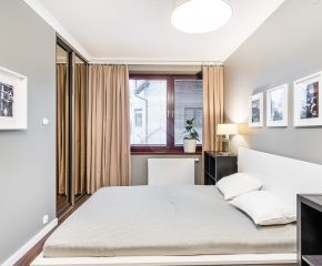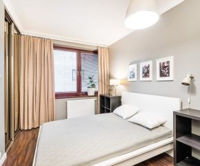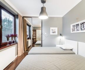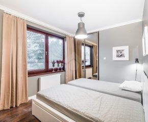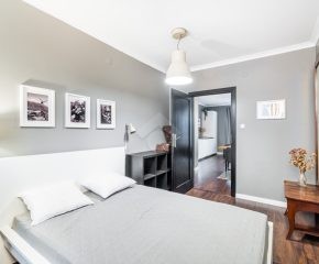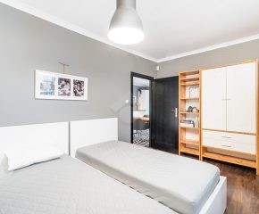 W pierwszej sypialni znajduje się podwójne łóżko, zabudowana szafa z lustrem oraz regał i stolik – dodatkowo garderoba. W drugiej sypilani znajdziemy duże łózko oraz regał oraz dodatkowo przynależną garderobę. W łazience do dyspozycji duża wanna, umywalka oraz WC. W części dziennej znajduje się zabudowa kuchenna na wymiar wraz ze sprzętami AGD, duży stół w cześci jadalni oraz sofa i stolik.