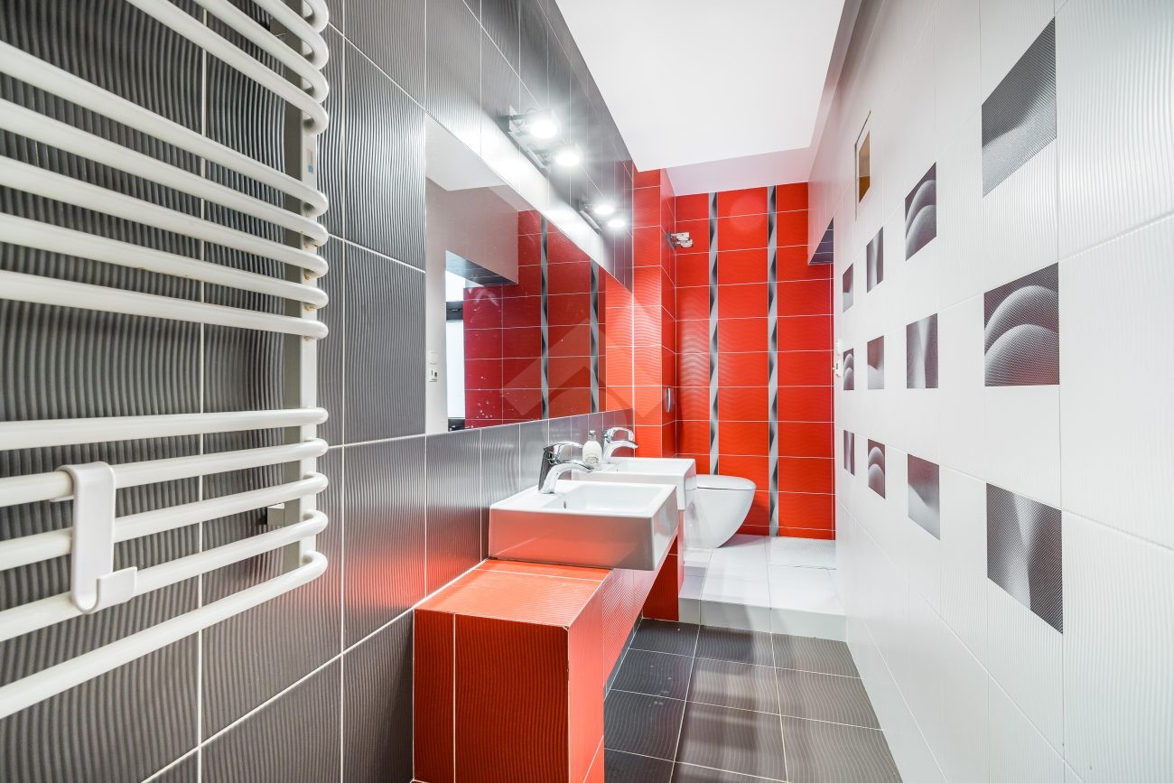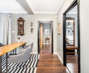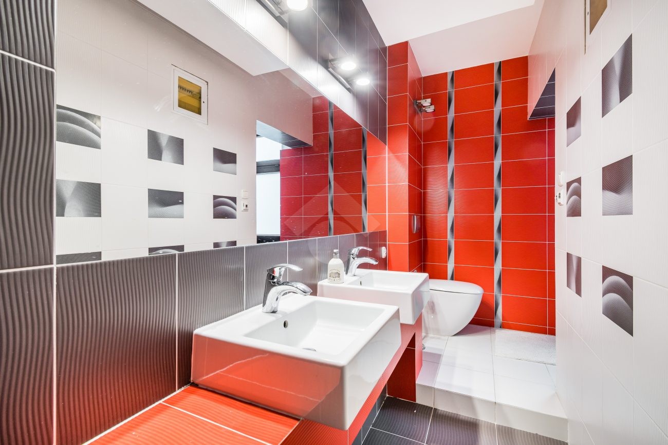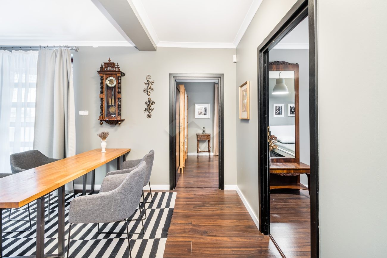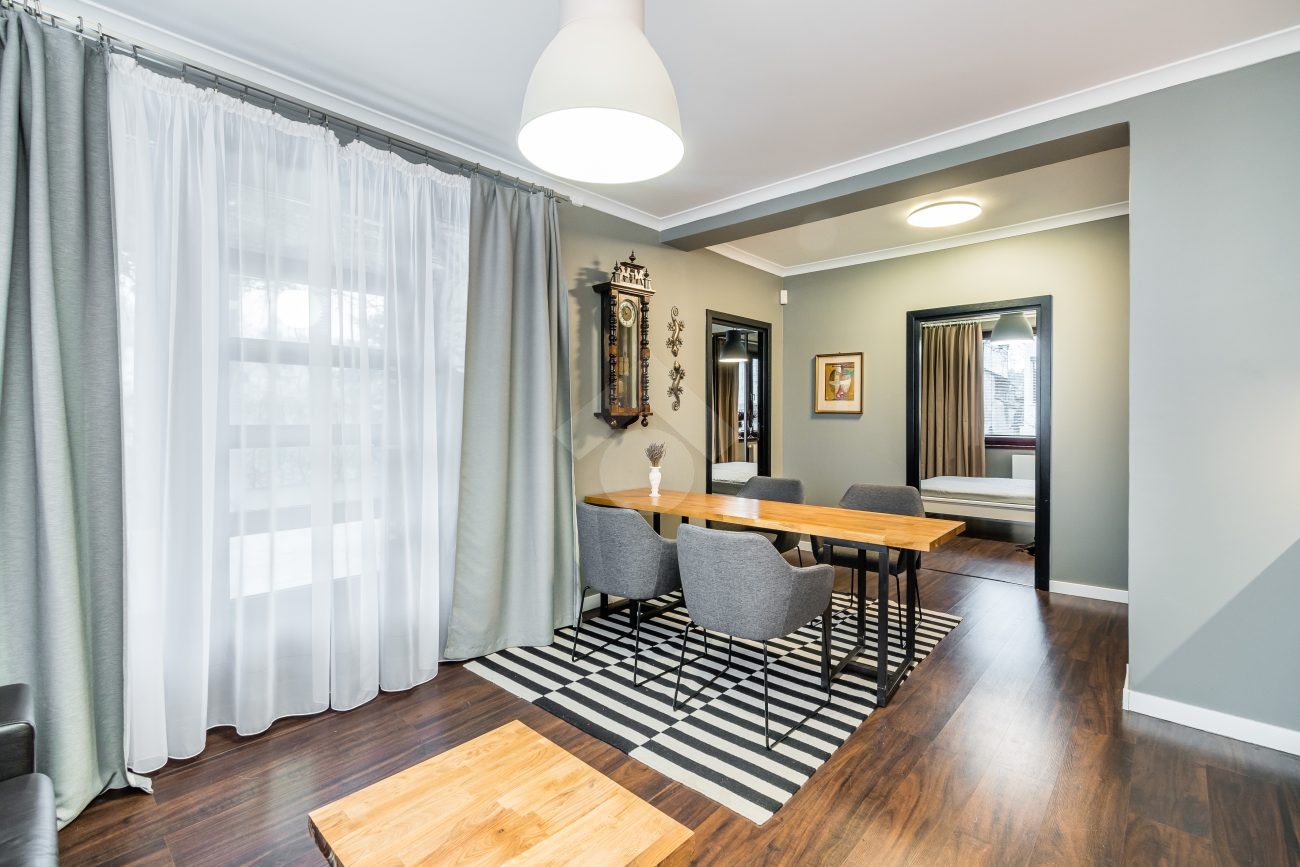 W pierwszej sypialni znajduje się podwójne łóżko, zabudowana szafa z lustrem oraz regał i stolik – dodatkowo garderoba. W drugiej sypilani znajdziemy duże łózko oraz regał oraz dodatkowo przynależną garderobę. W łazience do dyspozycji duża wanna, umywalka oraz WC. W części dziennej znajduje się zabudowa kuchenna na wymiar wraz ze sprzętami AGD, duży stół w cześci jadalni oraz sofa i stolik.