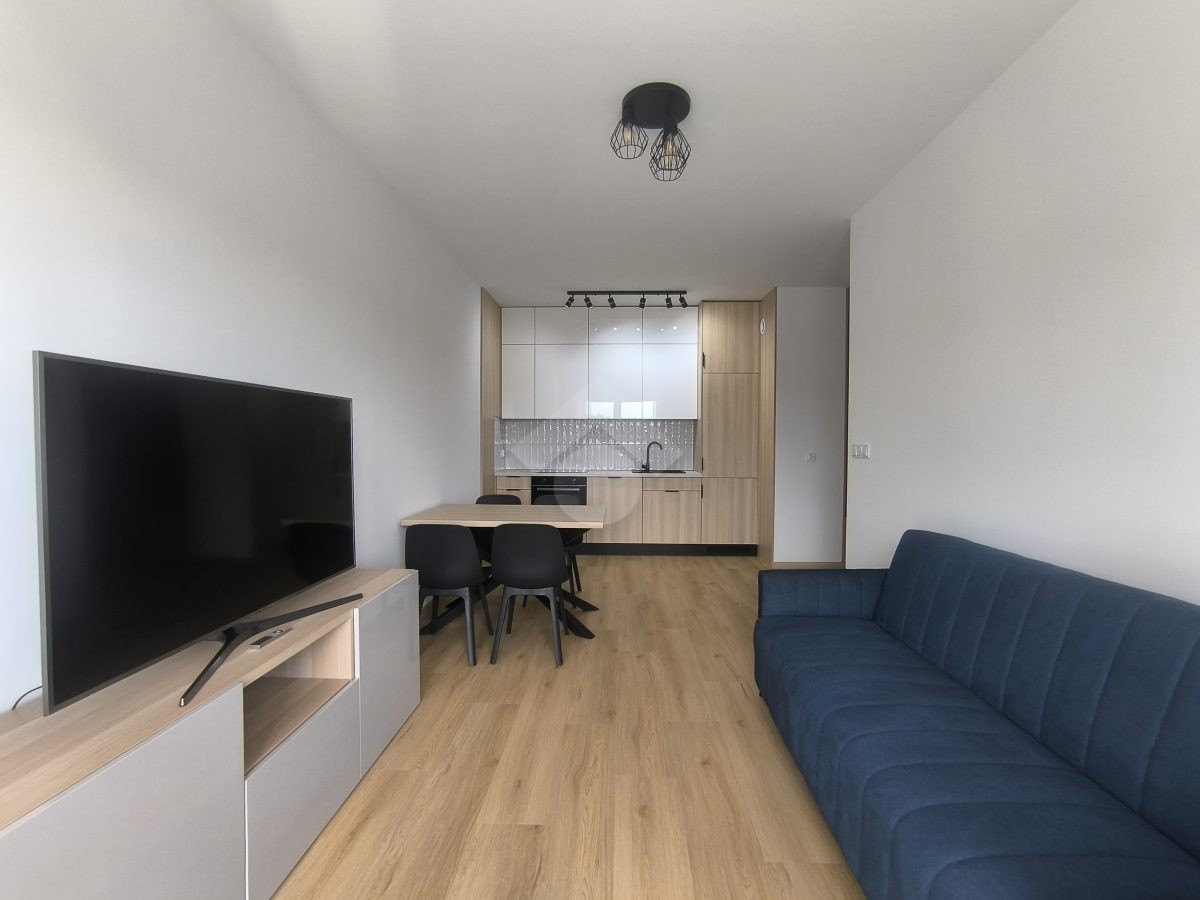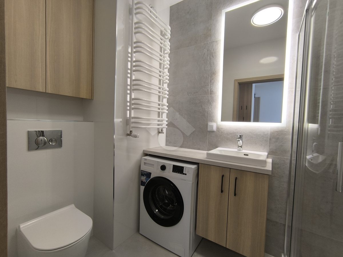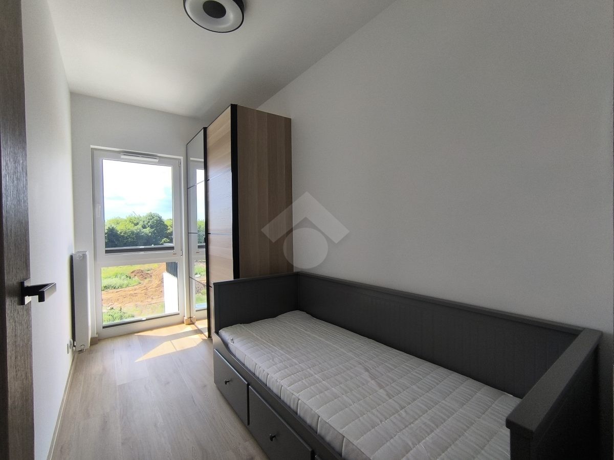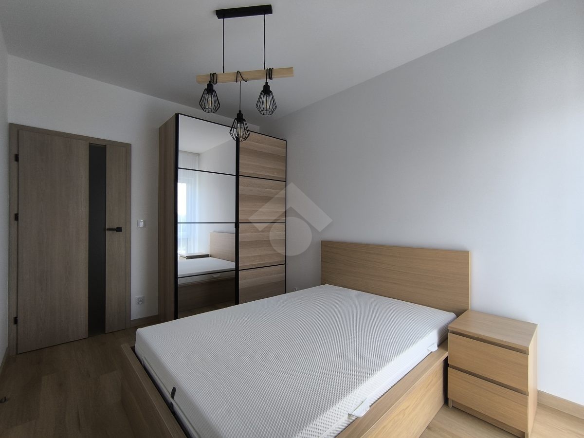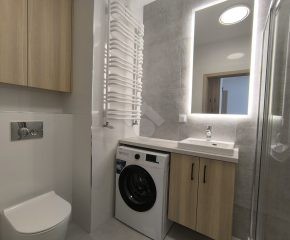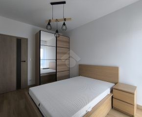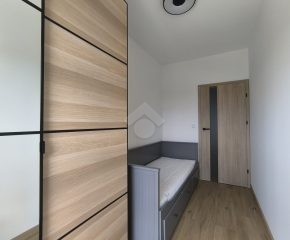 Stan nieruchomości: WYSOKI STANDARD. Mieszkanie jest w pełni umeblowane. W Salonie z aneksem: meble w zabudowie, lodówko-zamrażarka, piekarnik, płyta indukcyjna, zmywarka, stół z krzesłami, narożnik rozkładany, szafka RTV oraz telewizor. Sypialnia nr 1: łóżko dwuosobowe, szafka nocna oraz szafa w zabudowie. Sypialnia nr 2: łóżko oraz szafa w zabudowie. Łazienka z WC: prysznic z deszczownicą, pralka oraz umywalka. Dodatkowo w mieszkaniu została zamontowana klimatyzacja – jednostka znajduje się w salonie.