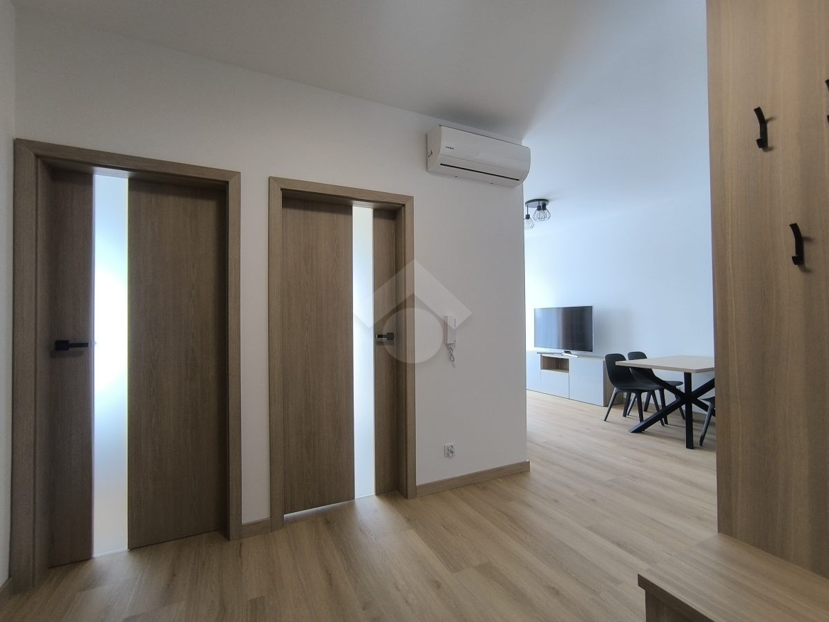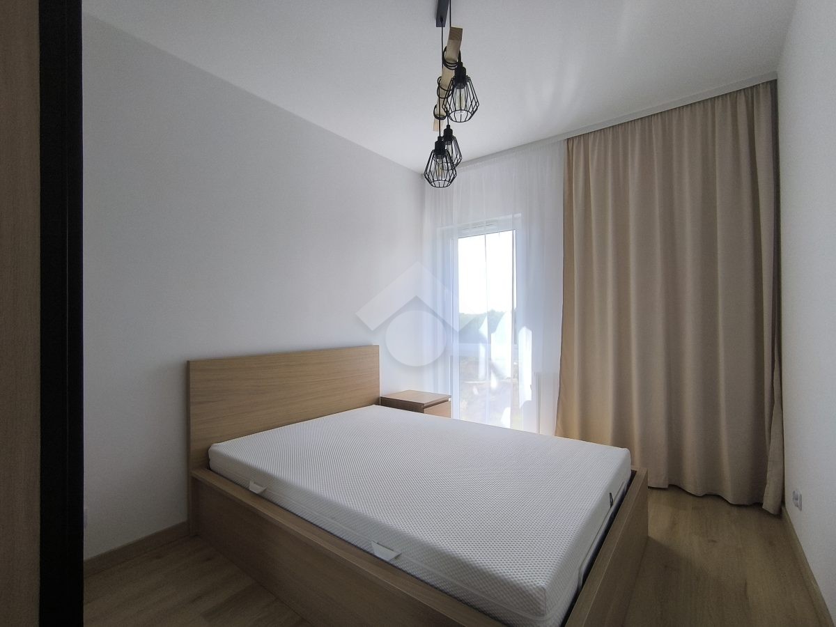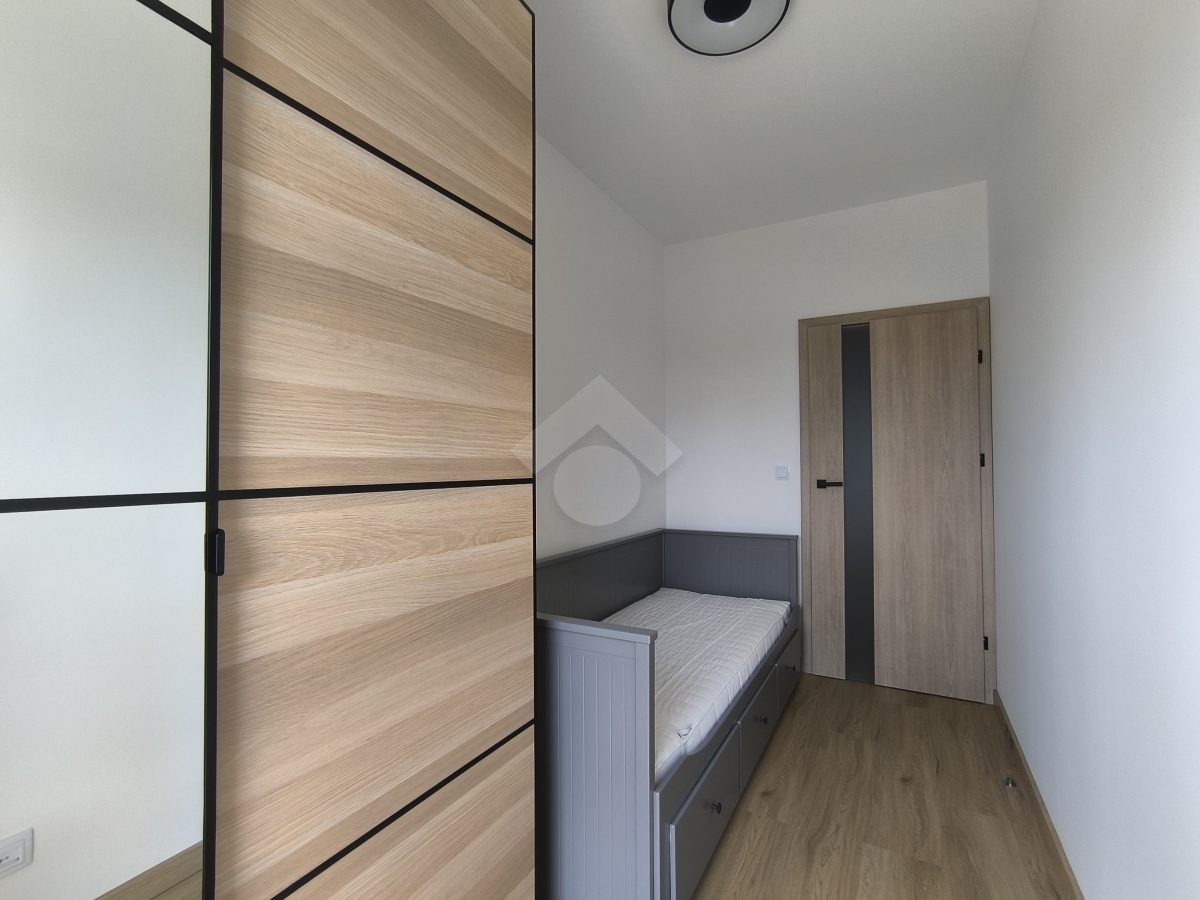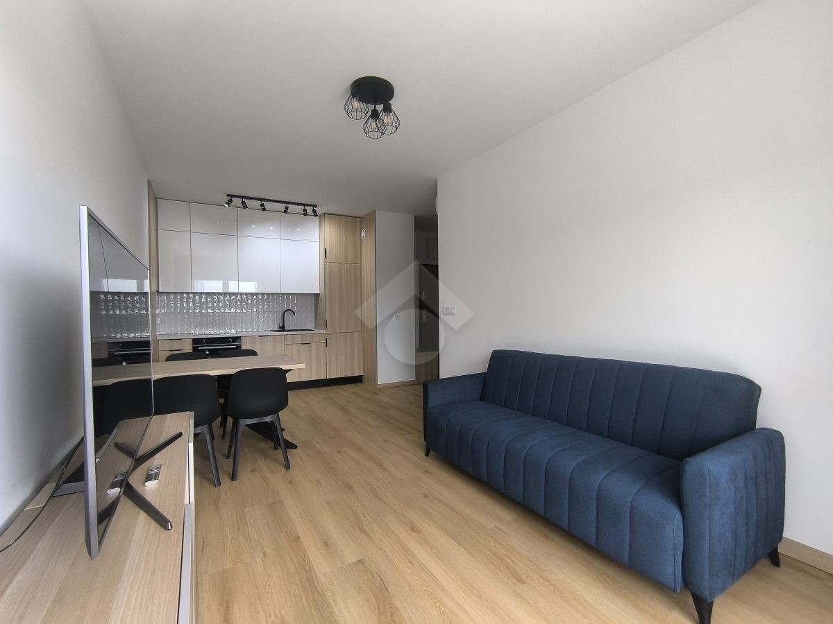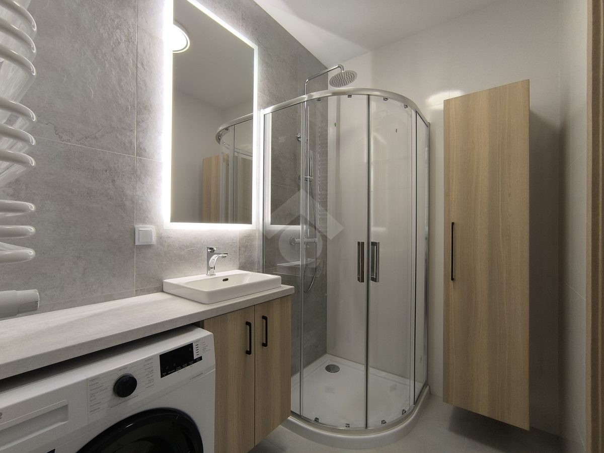Stan nieruchomości: WYSOKI STANDARD. Mieszkanie jest w pełni umeblowane. W Salonie z aneksem: meble w zabudowie, lodówko-zamrażarka, piekarnik, płyta indukcyjna, zmywarka, stół z krzesłami, narożnik rozkładany, szafka RTV oraz telewizor. Sypialnia nr 1: łóżko dwuosobowe, szafka nocna oraz szafa w zabudowie. Sypialnia nr 2: łóżko oraz szafa w zabudowie. Łazienka z WC: prysznic z deszczownicą, pralka oraz umywalka. Dodatkowo w mieszkaniu została zamontowana klimatyzacja – jednostka znajduje się w salonie.
