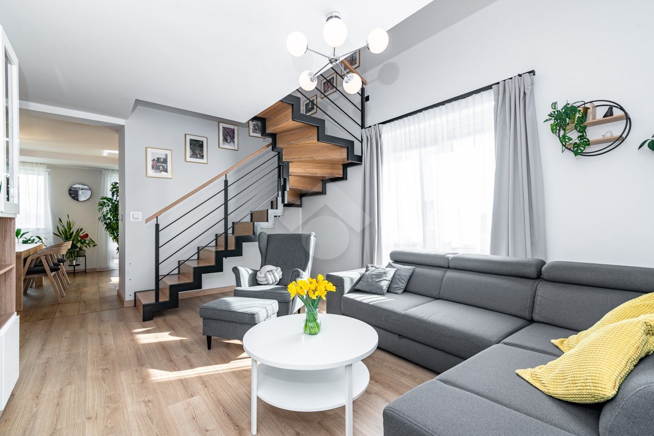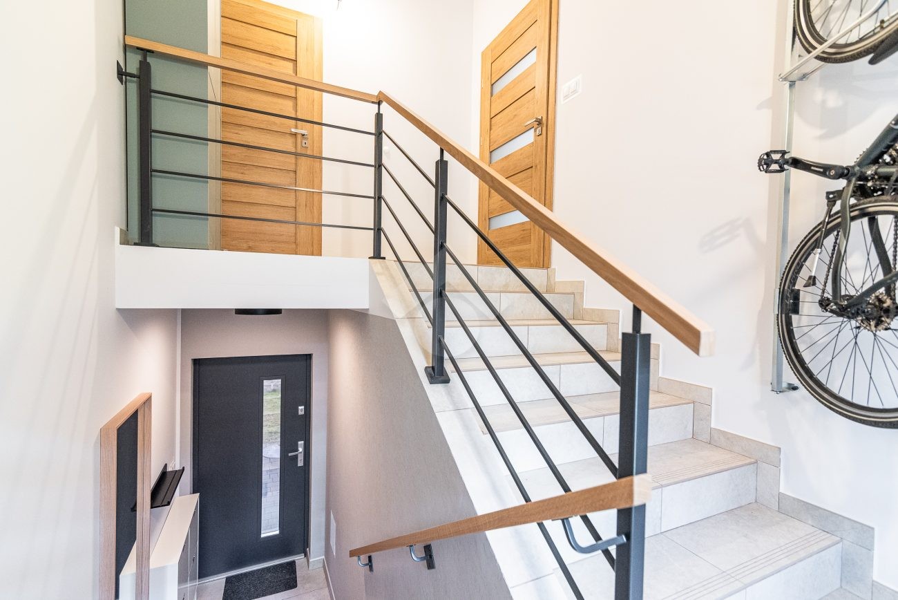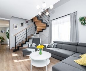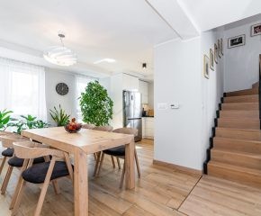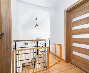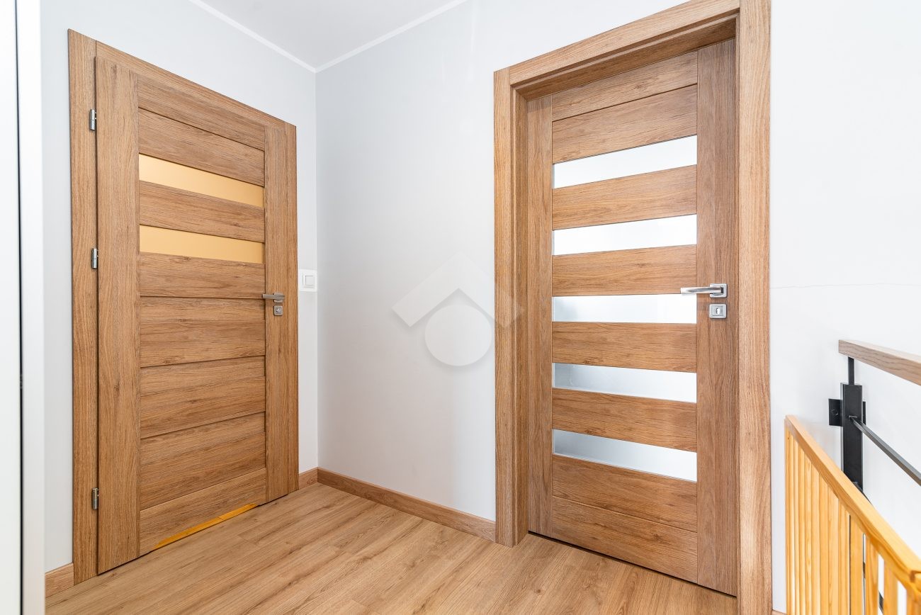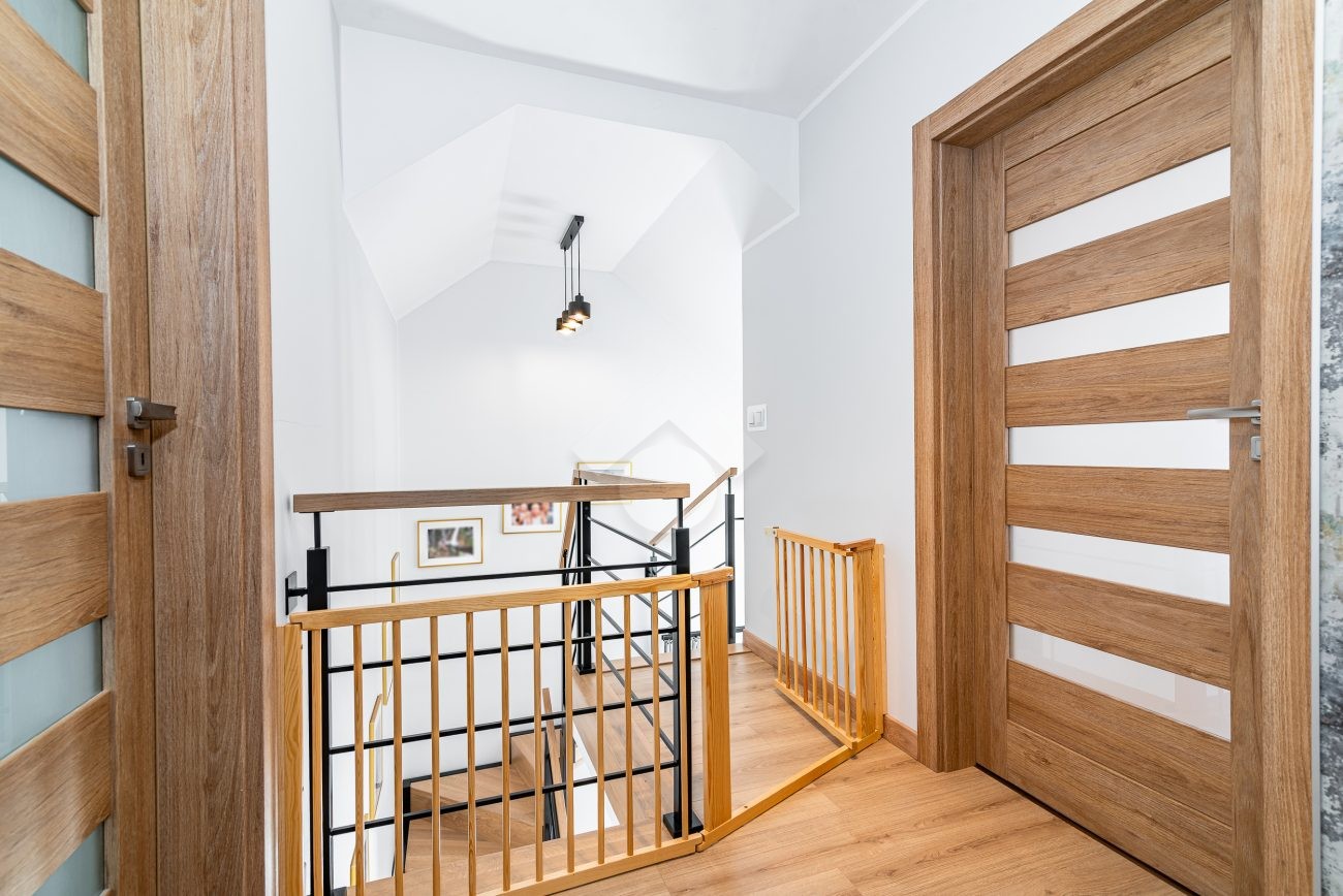 Nieruchomość została wykończona z wysokiej jakości materiałów, z dużą dbałością o detale. Zabudowy meblowe wykonane na wymiar sprawiają, że wnętrza są funkcjonalne i spójne stylistycznie. Dębowe schody dodają wnętrzu ciepła i charakteru. W sypialniach na drugim piętrze zostały ukryte dwa pojemne schowki. Okna trzyszybowe zapewniają bardzo dobrą izolację i komfort na co dzień.