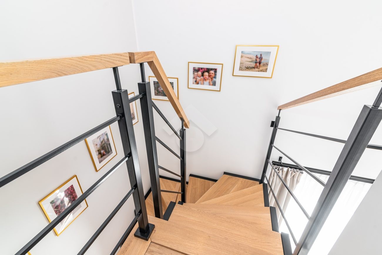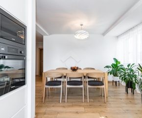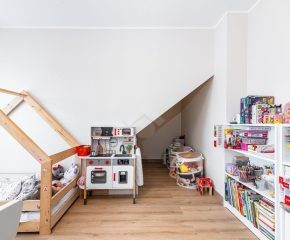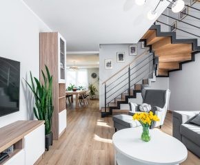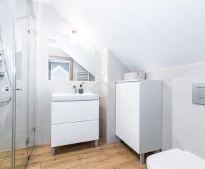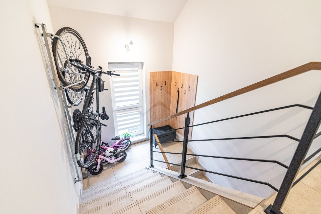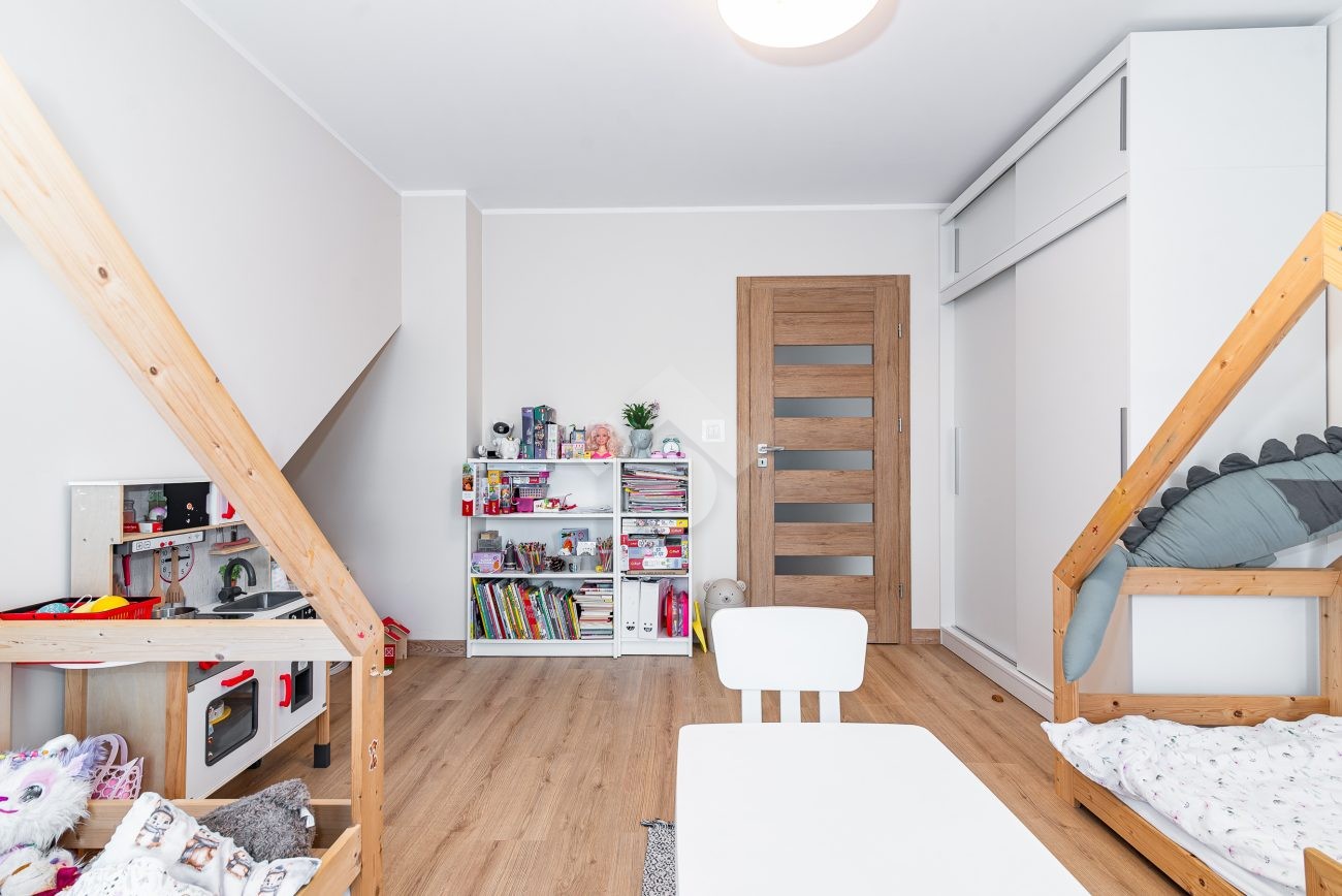 Nieruchomość została wykończona z wysokiej jakości materiałów, z dużą dbałością o detale. Zabudowy meblowe wykonane na wymiar sprawiają, że wnętrza są funkcjonalne i spójne stylistycznie. Dębowe schody dodają wnętrzu ciepła i charakteru. W sypialniach na drugim piętrze zostały ukryte dwa pojemne schowki. Okna trzyszybowe zapewniają bardzo dobrą izolację i komfort na co dzień.