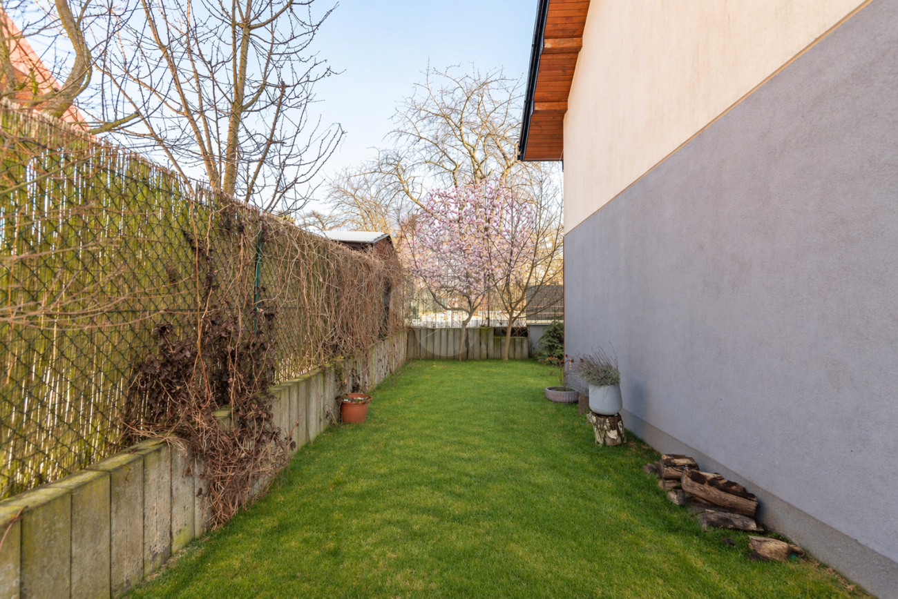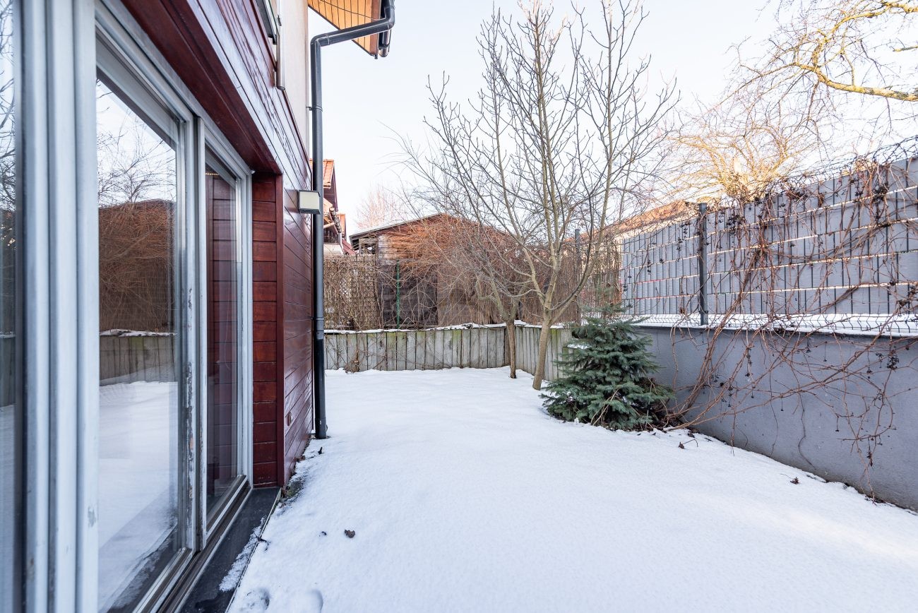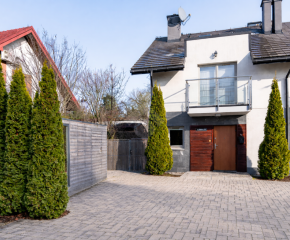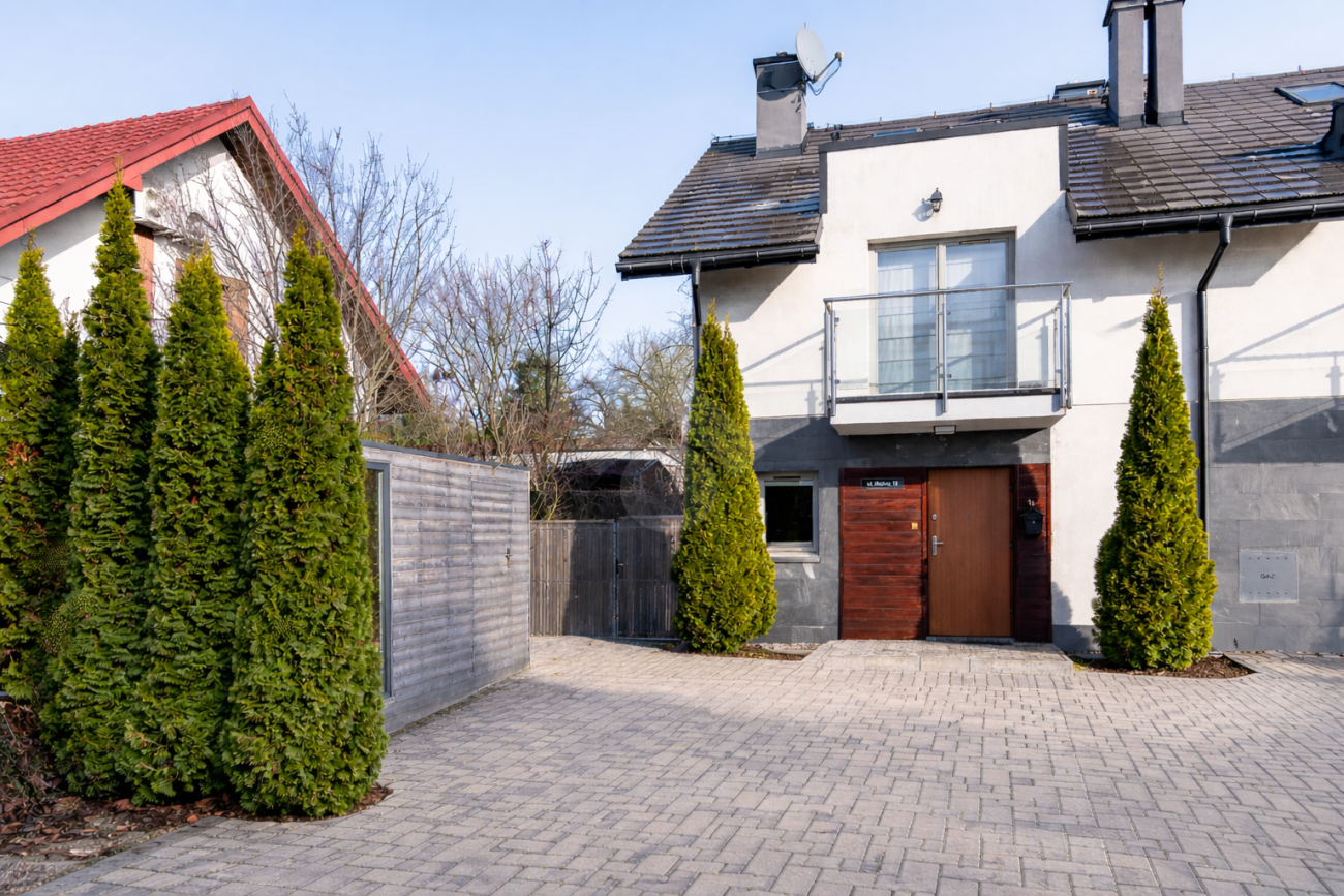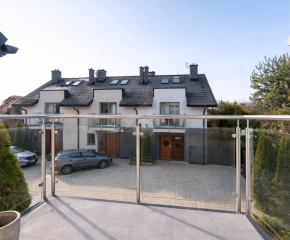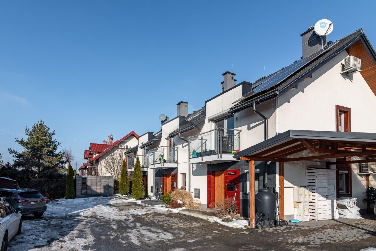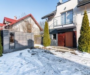 Na terenie działki przypisanej do nieruchomości znajdują się dwa naziemne miejsca postojowe, zagospodarowany ogród oraz domek gospodarczy. Nieruchomość położona jest na zamkniętym osiedlu z bramą automatyczną oraz wspólnym placem zabaw i miejscami parkingowymi dla gości. Największymi zaletami nieruchomości jest zielona, kameralna okolica oraz jej układ i funkcjonalność.