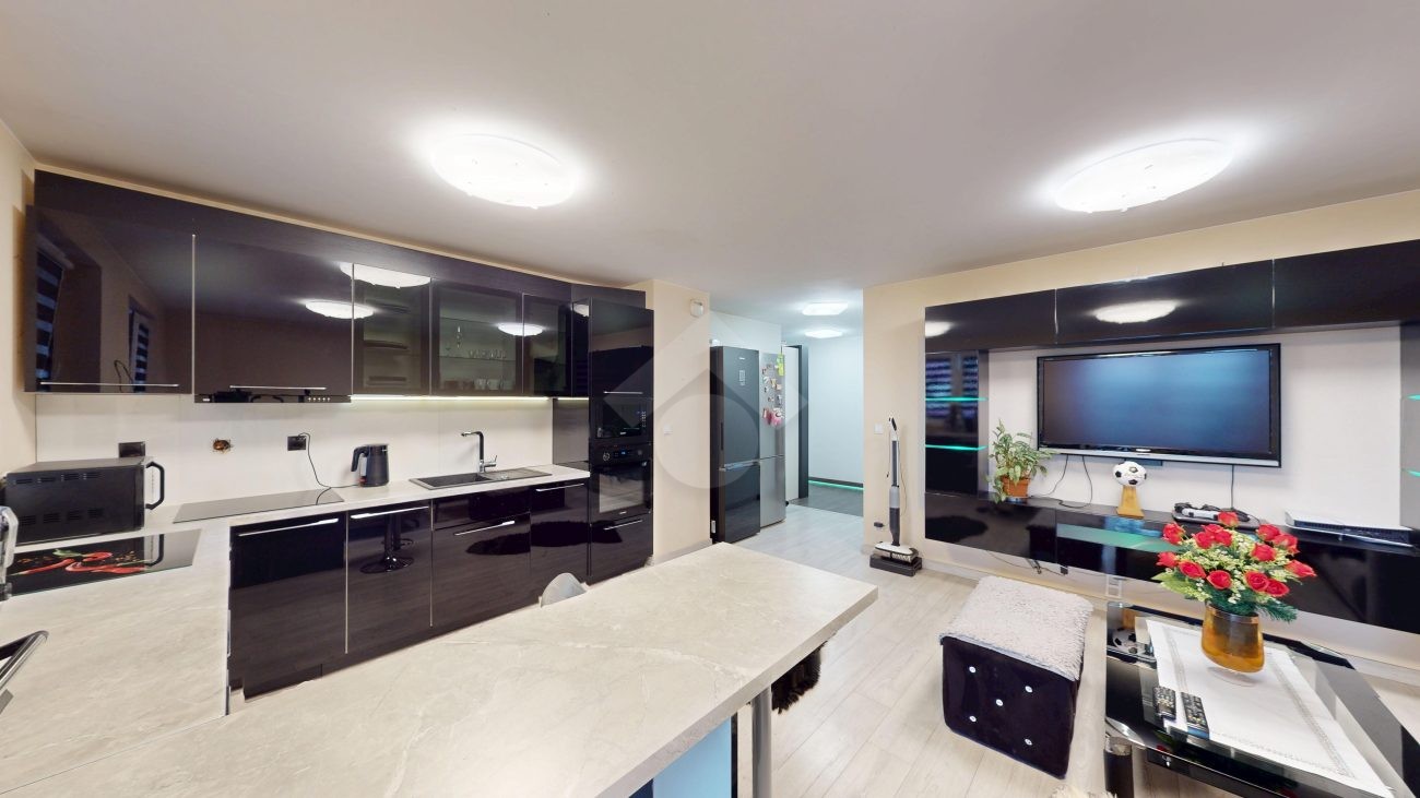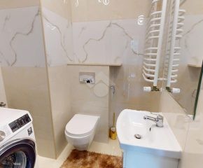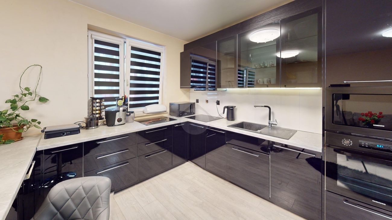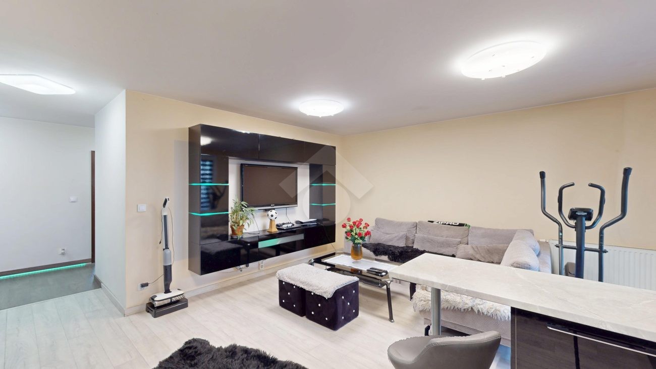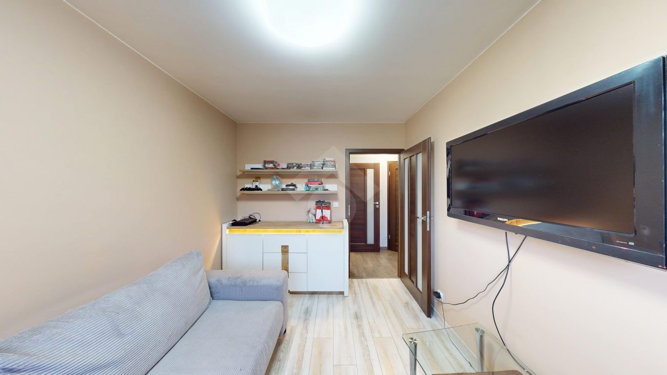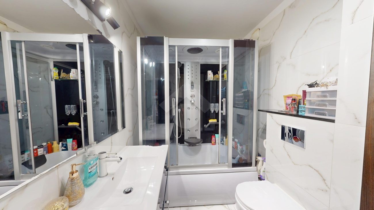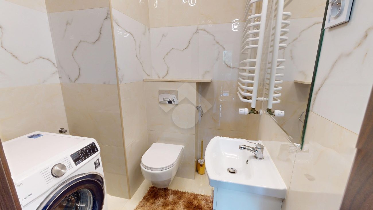 Mieszkanie zostało wykończone w 2020 roku, dzięki czemu jest gotowe do wprowadzenia bez konieczności przeprowadzania gruntownego remontu. Z salonu znajduje się wyjście na przestronny balkon. Strefa dzienna została podzielona na część kuchenną i wypoczynkową. W jednej z łazienek zaprojektowano wnękę na pralkę, pełniącą funkcję praktycznej pralni. Największa sypialnia wyposażona jest w klimatyzację oraz posiada wyjście na balkon. W pierwotnym układzie mieszkania zaplanowano cztery sypialnie – istnieje możliwość powrotu do tego rozwiązania.