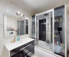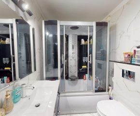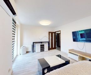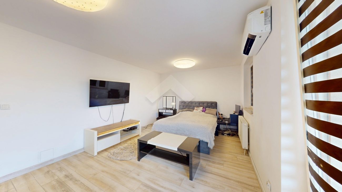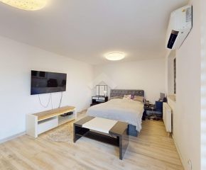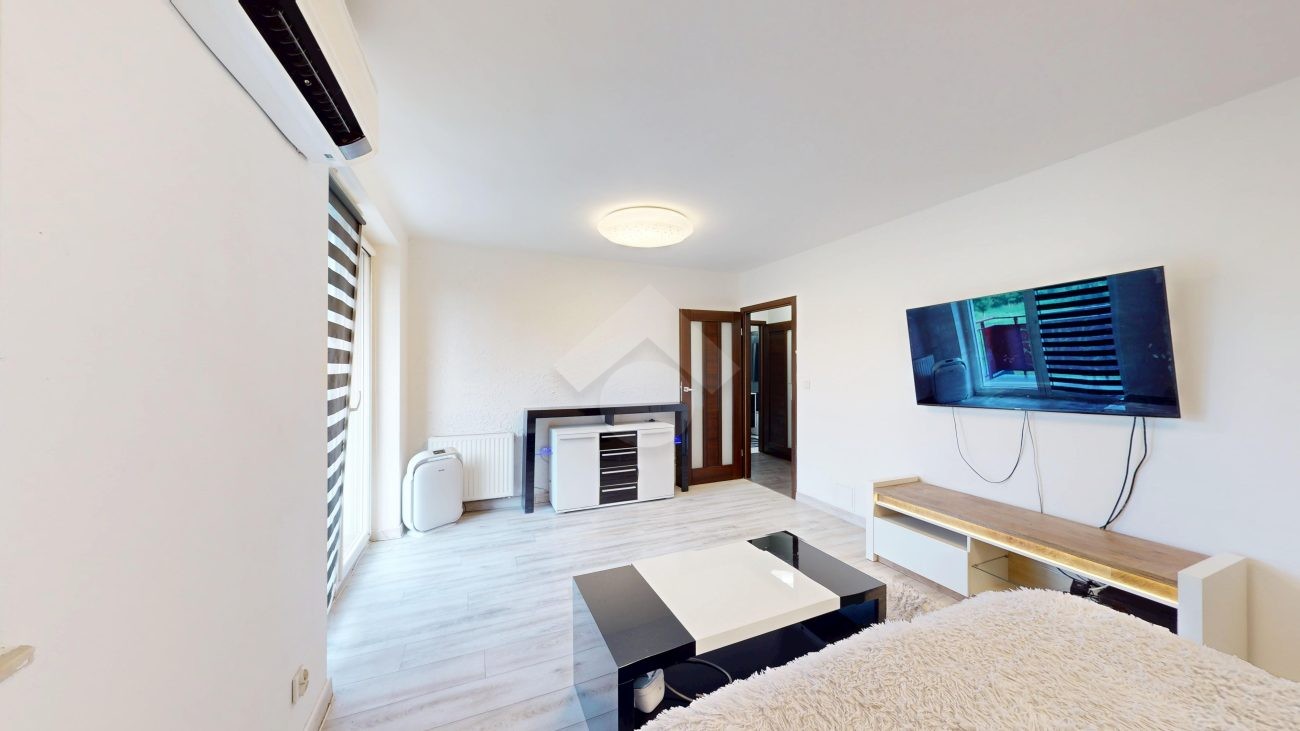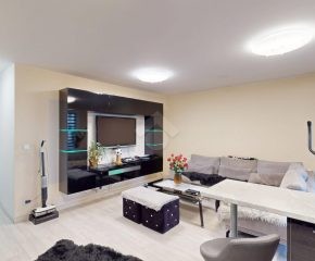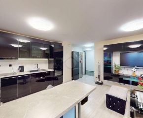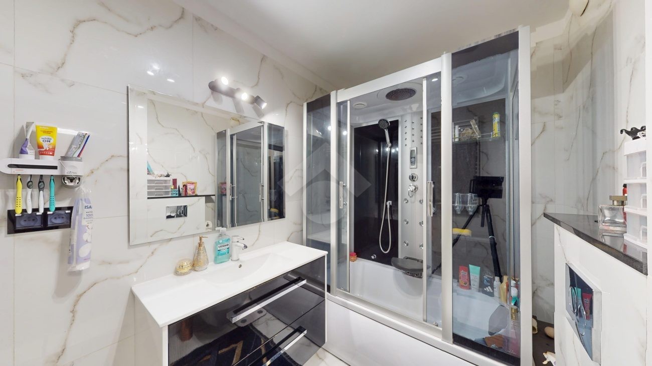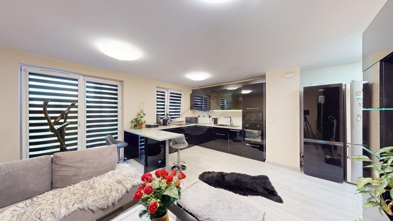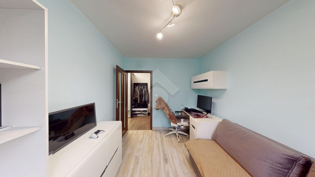 Mieszkanie zostało wykończone w 2020 roku, dzięki czemu jest gotowe do wprowadzenia bez konieczności przeprowadzania gruntownego remontu. Z salonu znajduje się wyjście na przestronny balkon. Strefa dzienna została podzielona na część kuchenną i wypoczynkową. W jednej z łazienek zaprojektowano wnękę na pralkę, pełniącą funkcję praktycznej pralni. Największa sypialnia wyposażona jest w klimatyzację oraz posiada wyjście na balkon. W pierwotnym układzie mieszkania zaplanowano cztery sypialnie – istnieje możliwość powrotu do tego rozwiązania.
