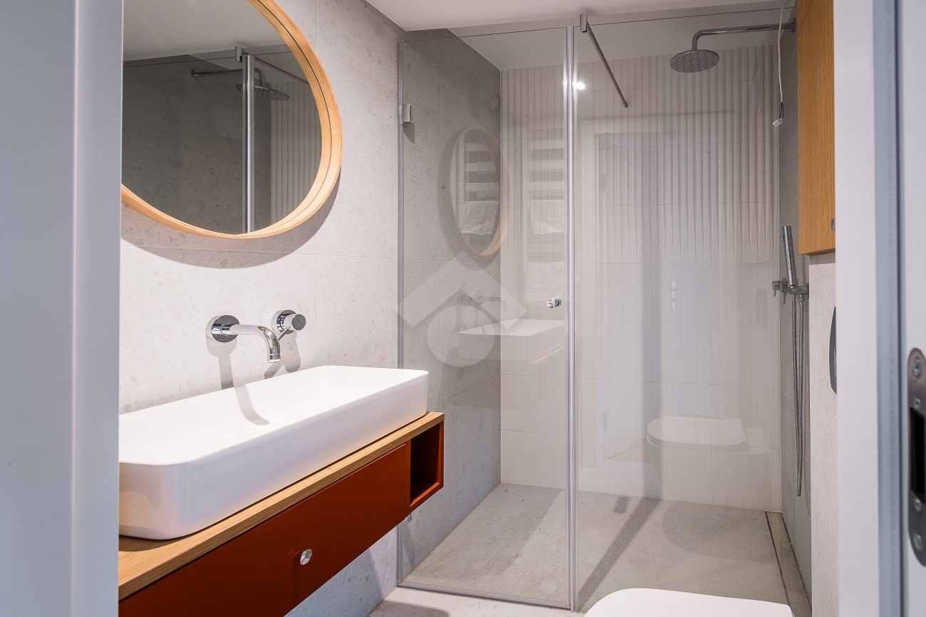 W hallu umieszczono dużą szafę z lustrem oraz wejście do pralni. W sypialni znajduje się komfortowe łóżko, natomiast salon oferuje przestrzeń do własnej aranżacji. Panoramiczne okna w sypialni, kuchni i salonie zapewniają piękny widok na zabytkowe kamienice i doskonałe doświetlenie wnętrz. Łazienka wyposażona jest w prysznic typu walk-in. Lokal ogrzewany jest dwufunkcyjnym piecykiem gazowym.