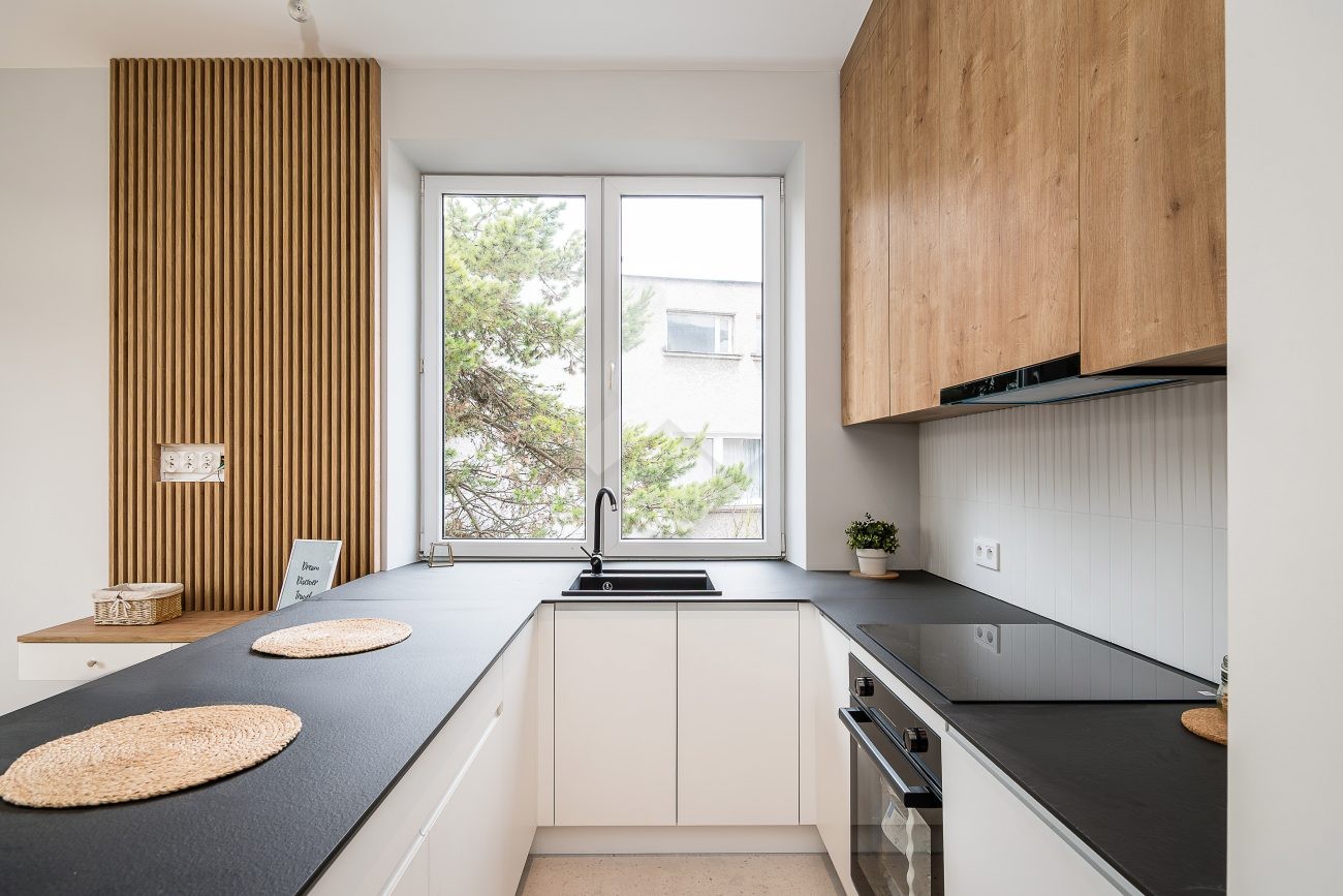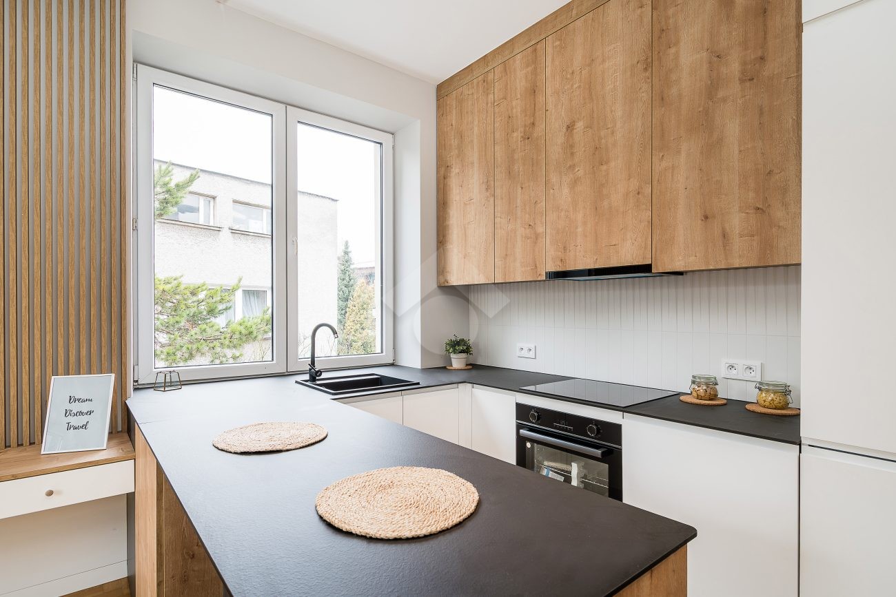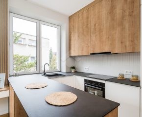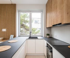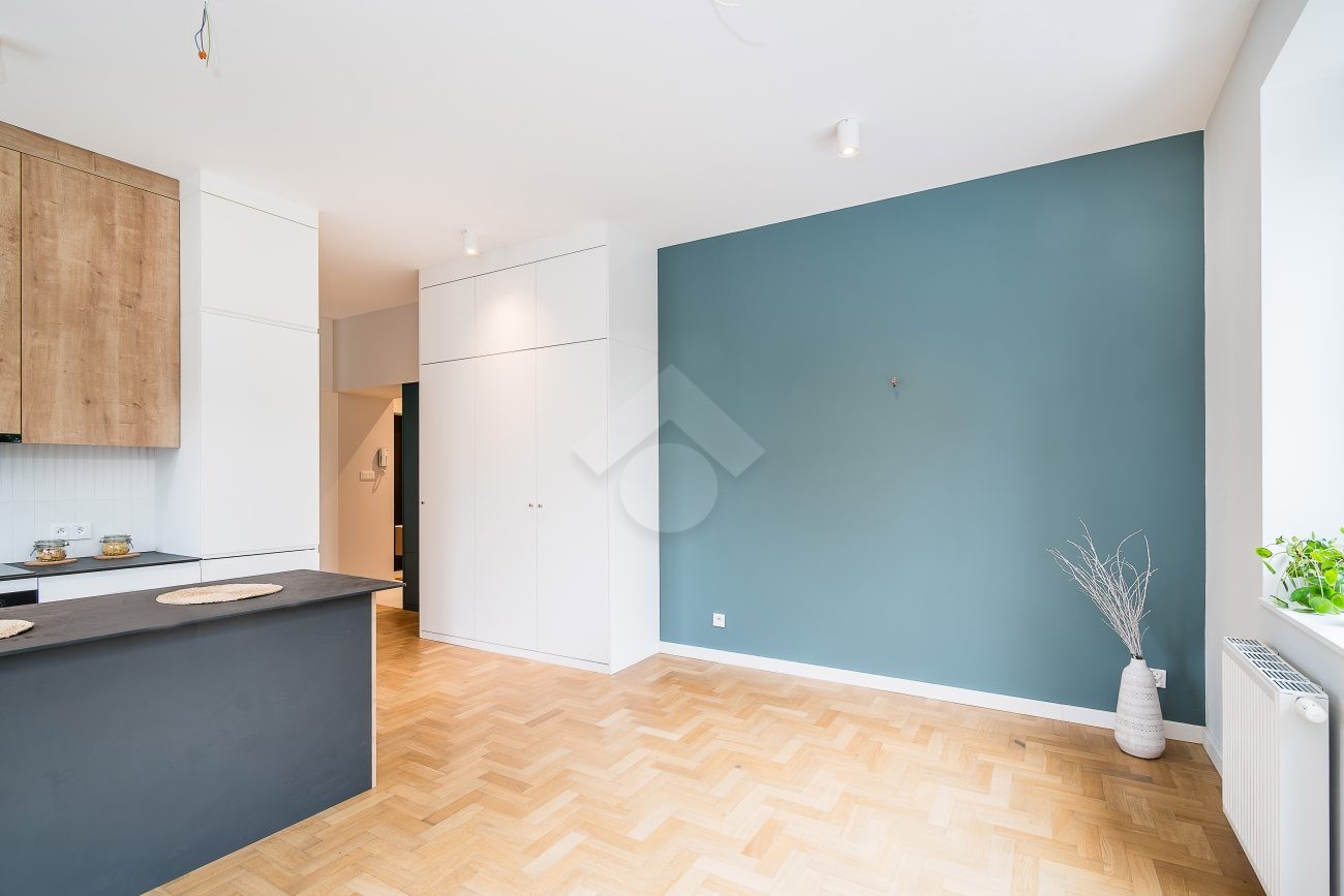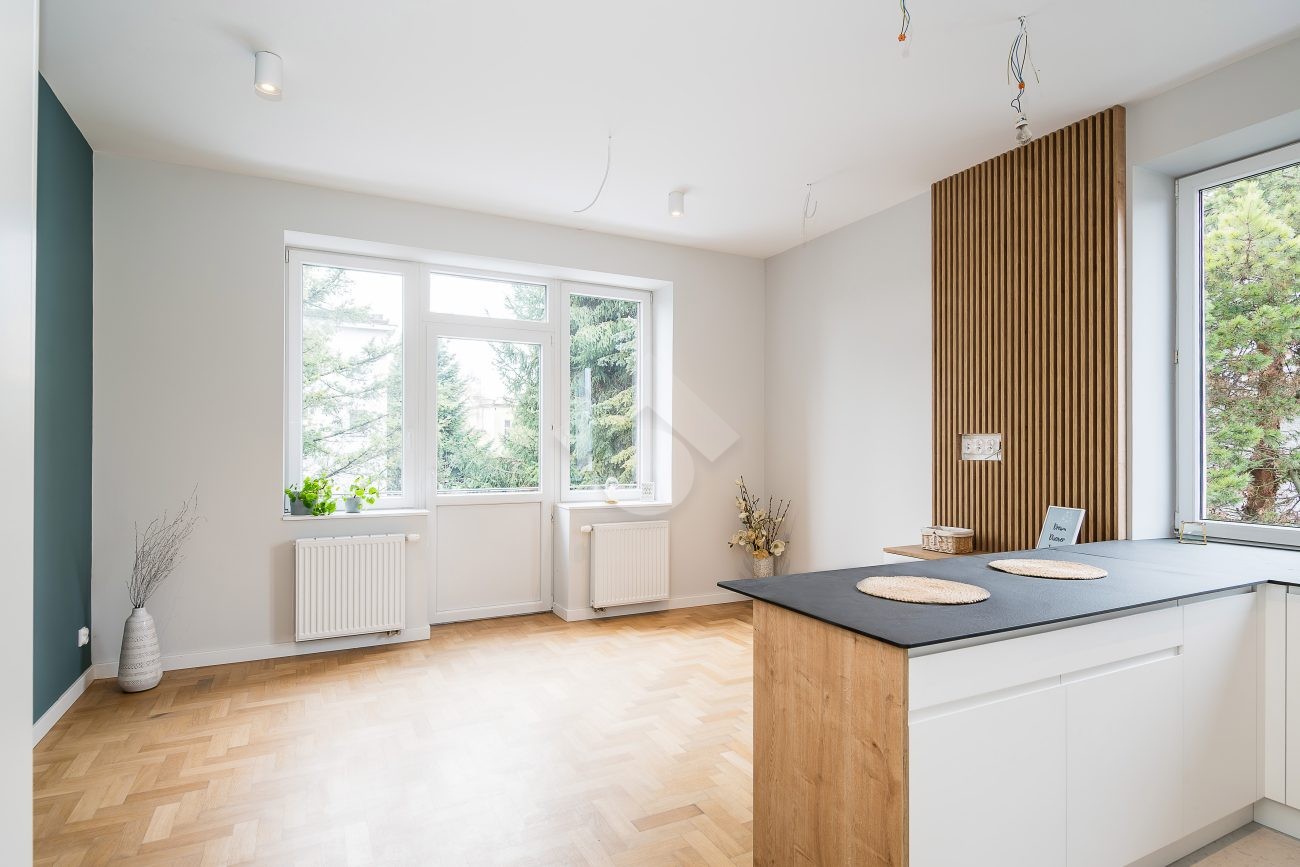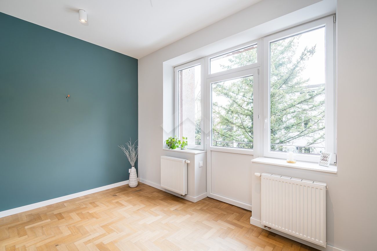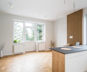 Condition of the premises: Very good, renovated this year. The fitted kitchen was custom-made by a carpenter and is equipped with an induction hob, oven, refrigerator and dishwasher. The rooms have parquet flooring, while the bathroom and hall have tiles. The hall has a large mirror, wardrobe and washing machine, the smaller room has a small bed and desk, and the larger room has a double bed and wardrobe. Bathroom with walk-in shower. The ceiling height of approximately 3 metres makes the property very spacious, and the large number of windows also makes the flat very bright. The premises are heated by a dual-function gas stove, and the tiles in the hall and bathroom have underfloor heating.