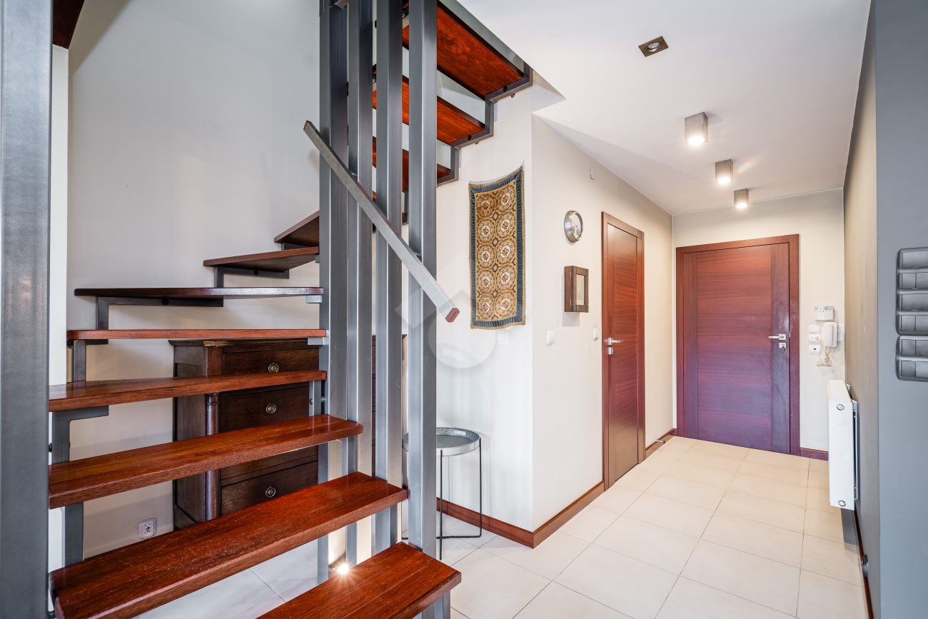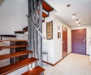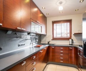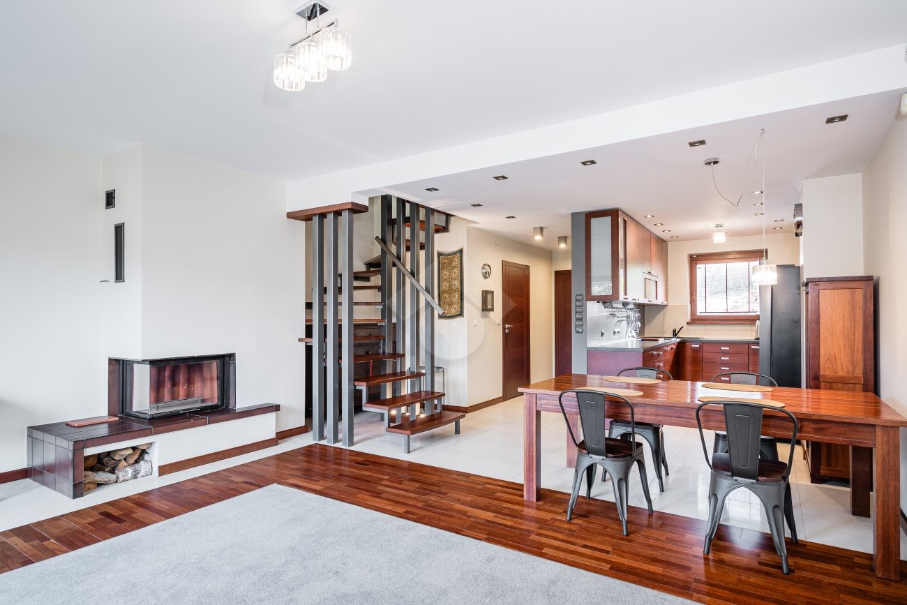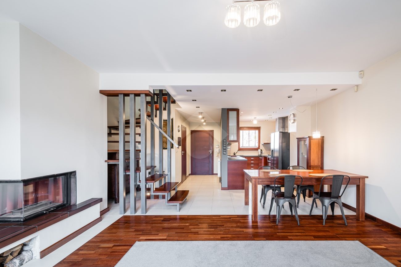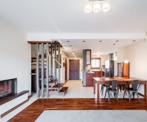 Stan lokalu: Bardzo dobry. Nieruchomość wykończona w wysokim standardzie. Na podłodze w pokojach deska Merbau a w kuchni, łazience oraz hallu płytki gresowe. Na ścianach gładzie. Kuchnia w zabudowie wyposażona w płyta gazowa, piekarnik elektryczny, dużą lodówkę z zamrażarką, zmywarkę oraz okap. W łazience na parterze znajduję się prysznic oraz bidet. W łazience na pierwszym piętrze jest wanna a na ostatnim piętrze WC oraz pralka. W mieszkaniu zainstalowany system alarmowy Solid. Ogrzewanie piecem gazowym 2-funkcyjnym firmy Vaillant.