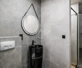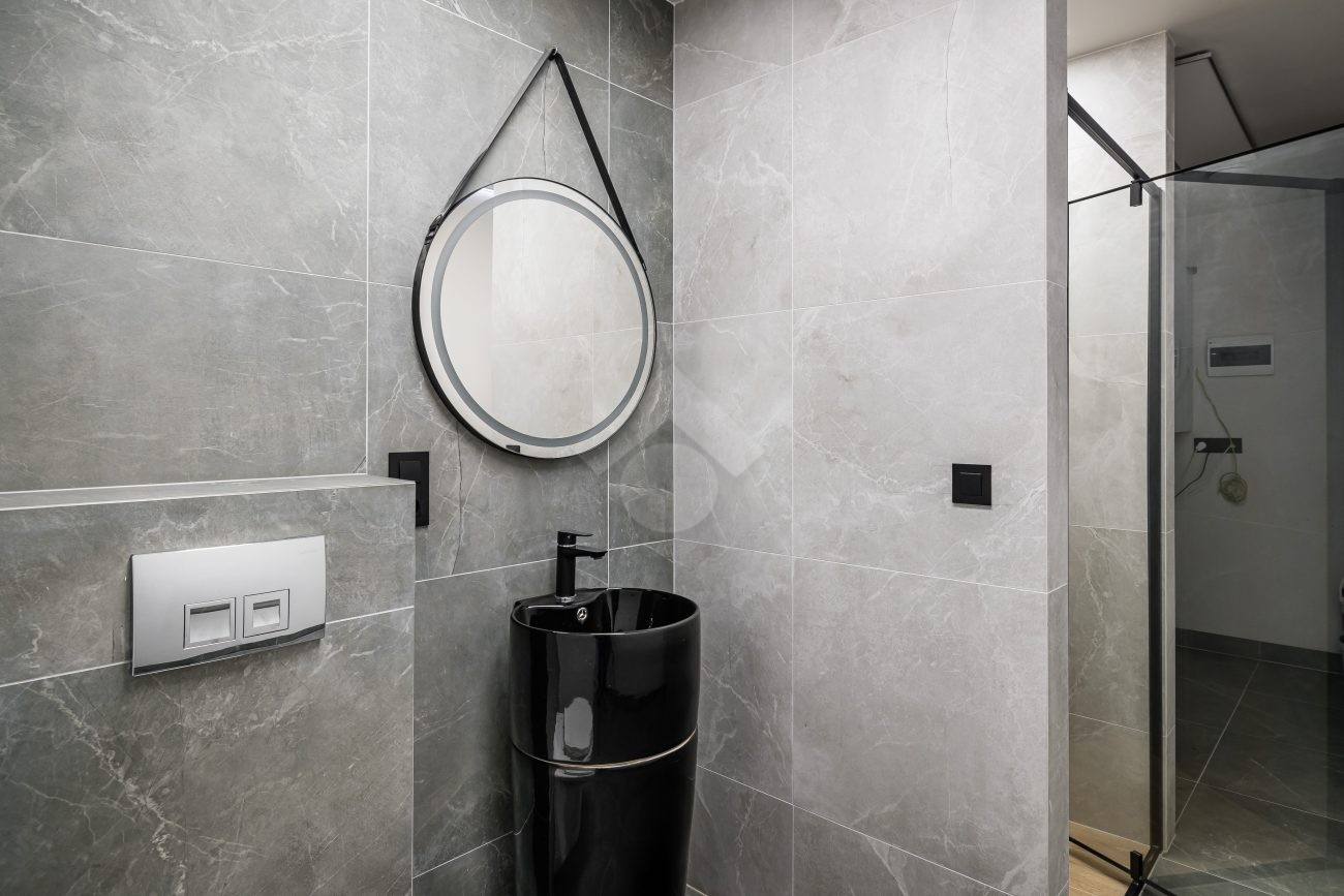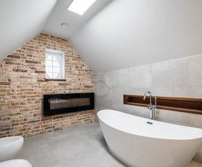 two modern bathrooms – one with a walk-in shower, the other with a bathtub and a built-in electric fireplace,