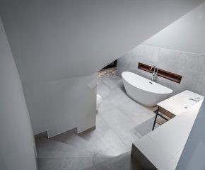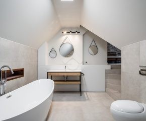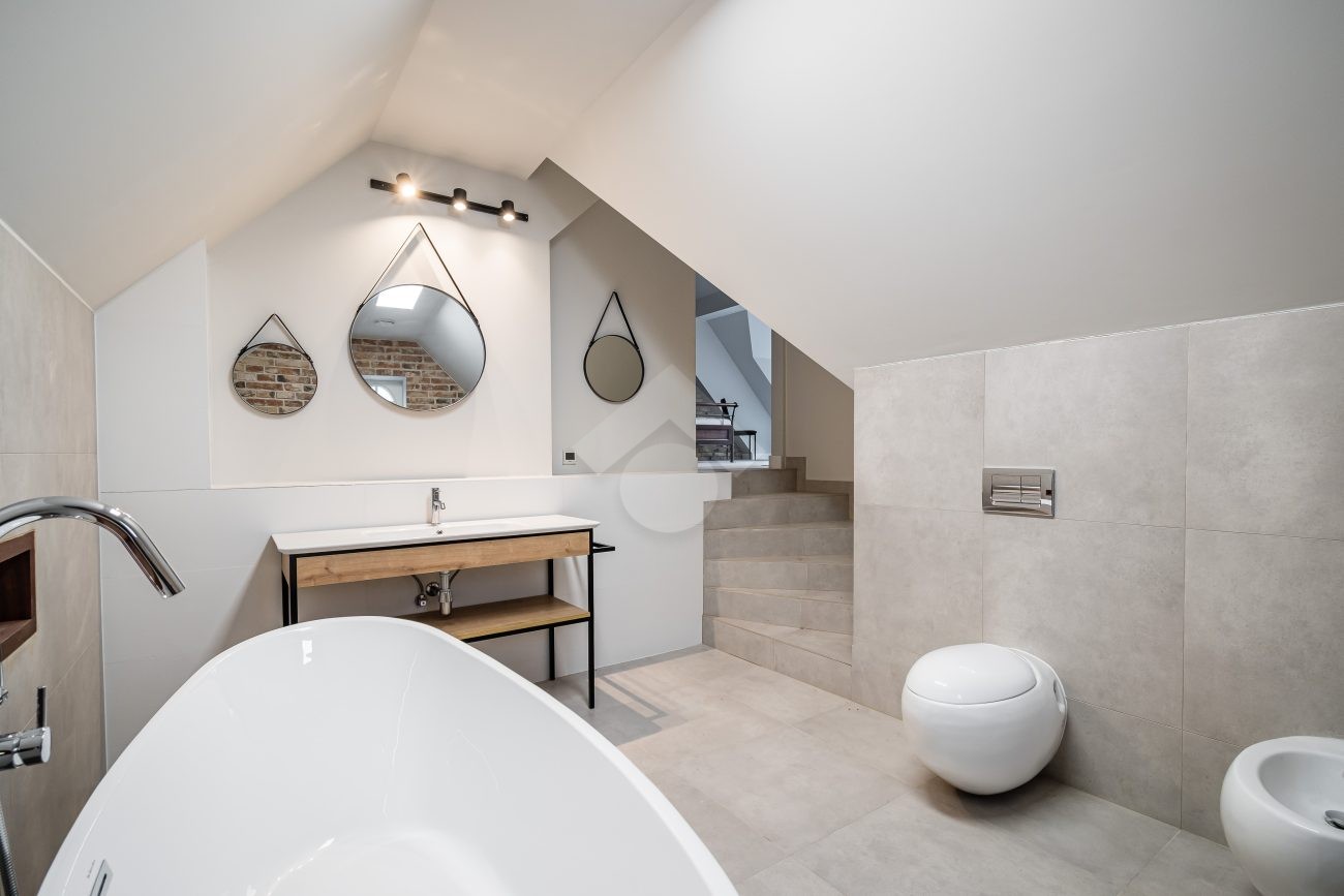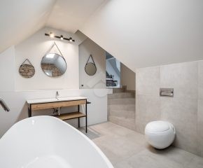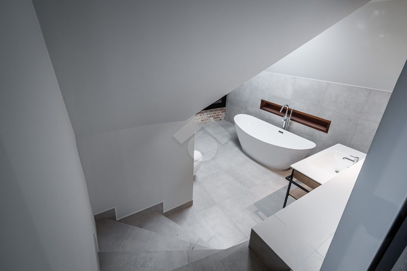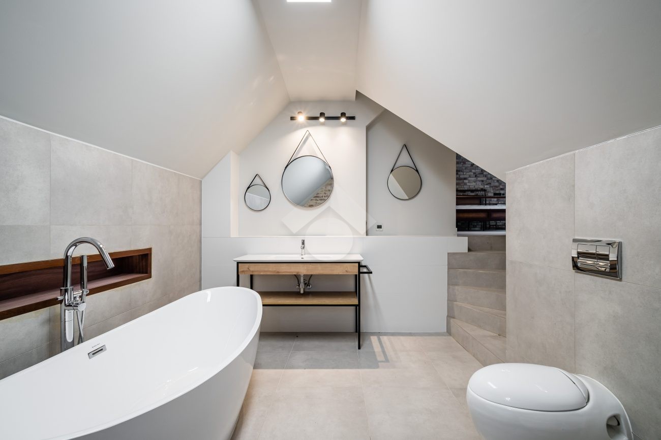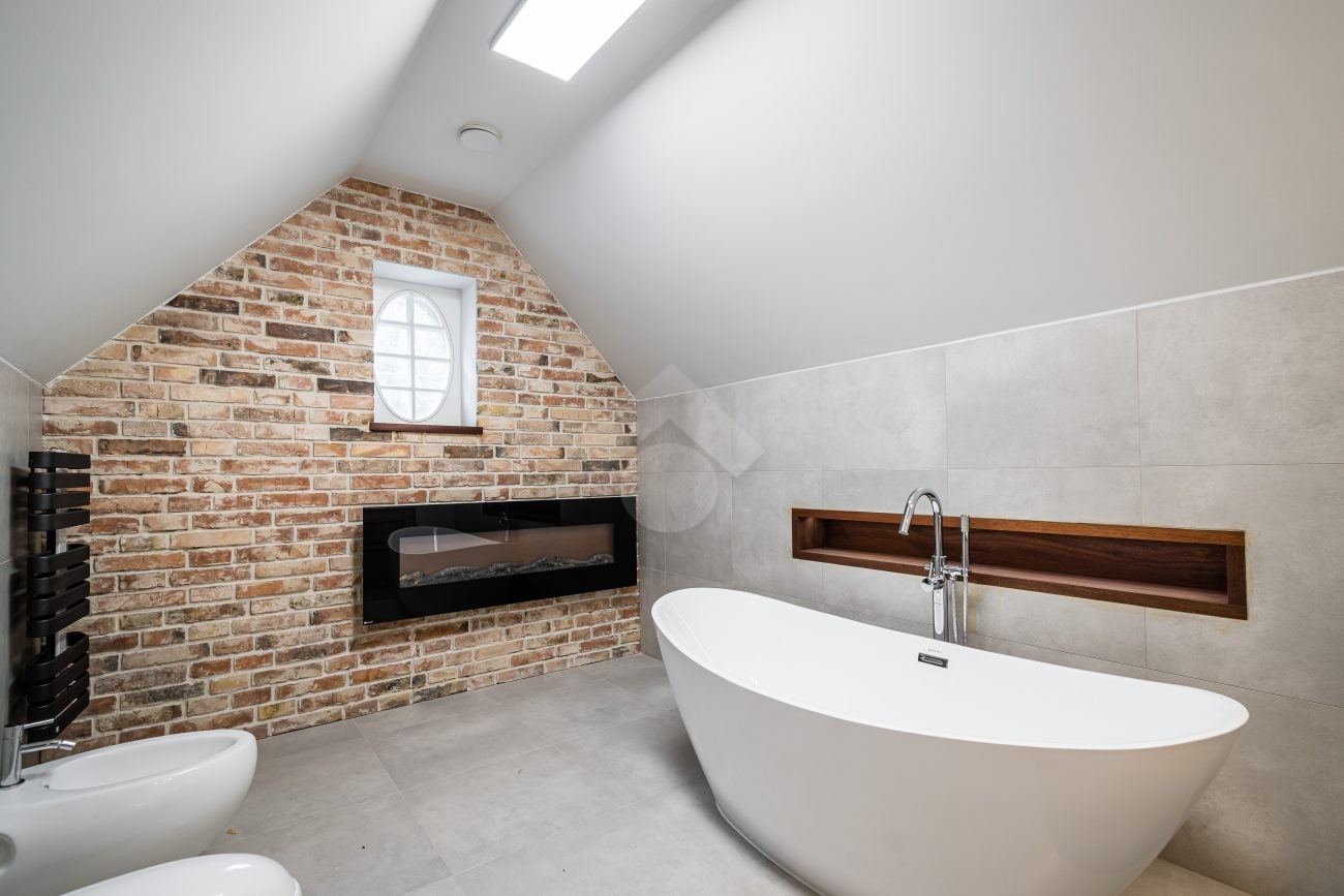 dwie łazienki – jedna z prysznicem typu walk-in, druga z wanną i nastrojowym kominkiem elektrycznym,
