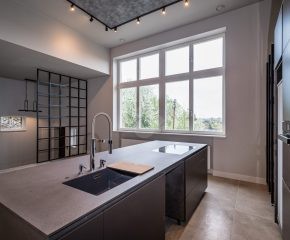 a spacious living room with a fully equipped open kitchen and panoramic window,