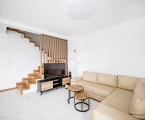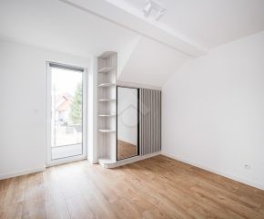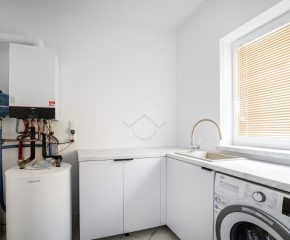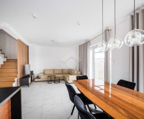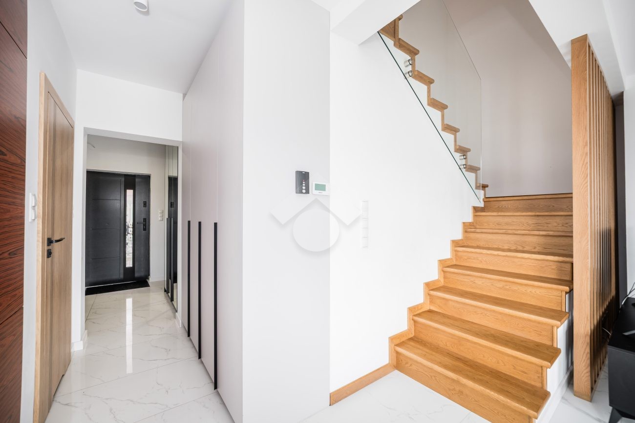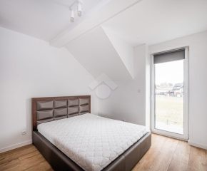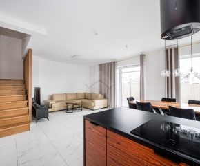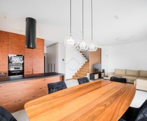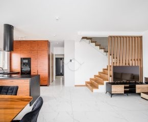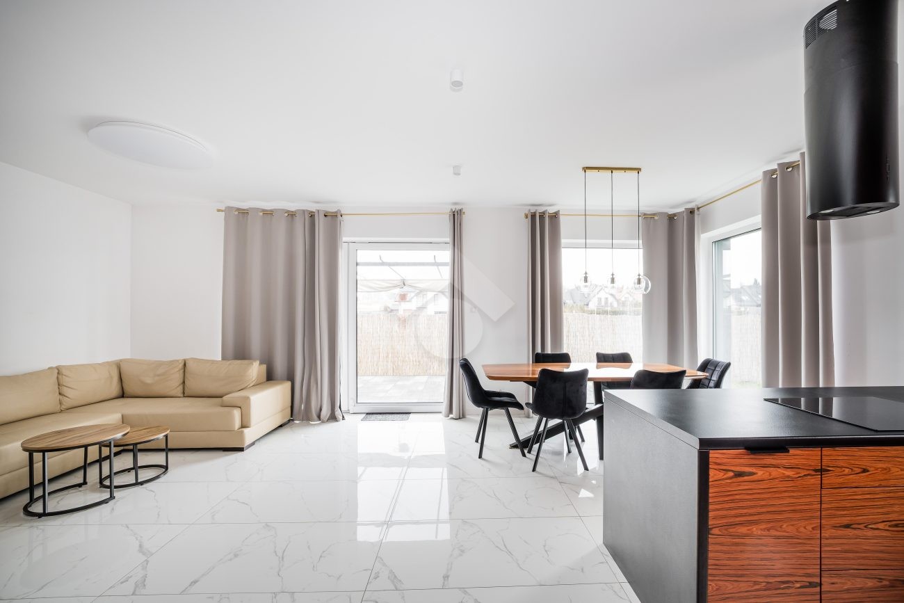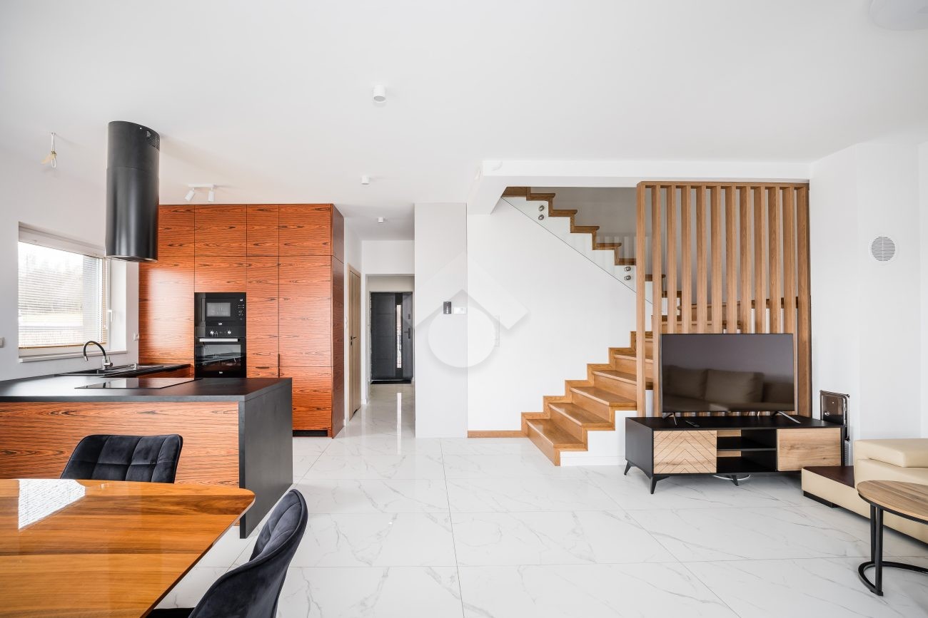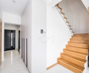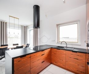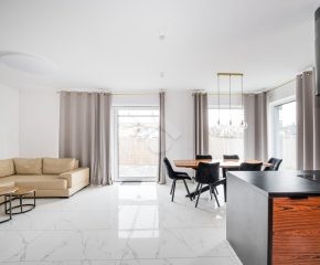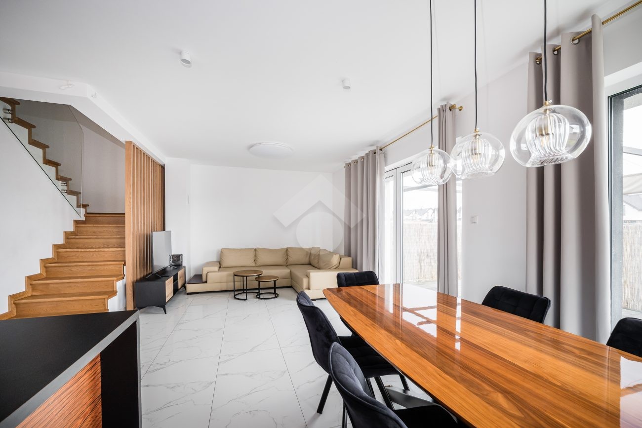 Na parterze znajduje się przestronna część dzienna: salon z wyjściem na taras i ogród, otwarta kuchnia oraz strefa jadalniana, tworzące jasną, otwartą przestrzeń idealną do wspólnego spędzania czasu.