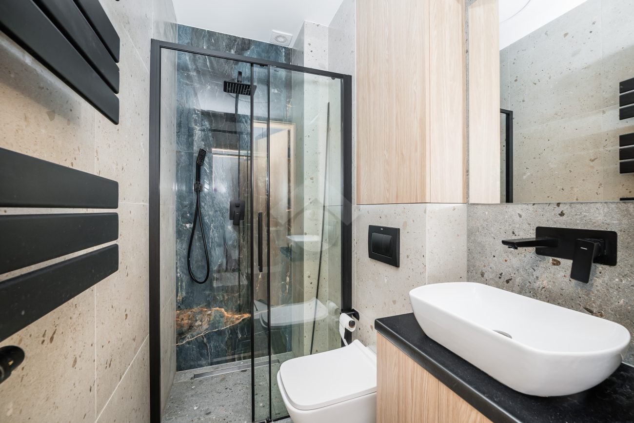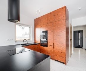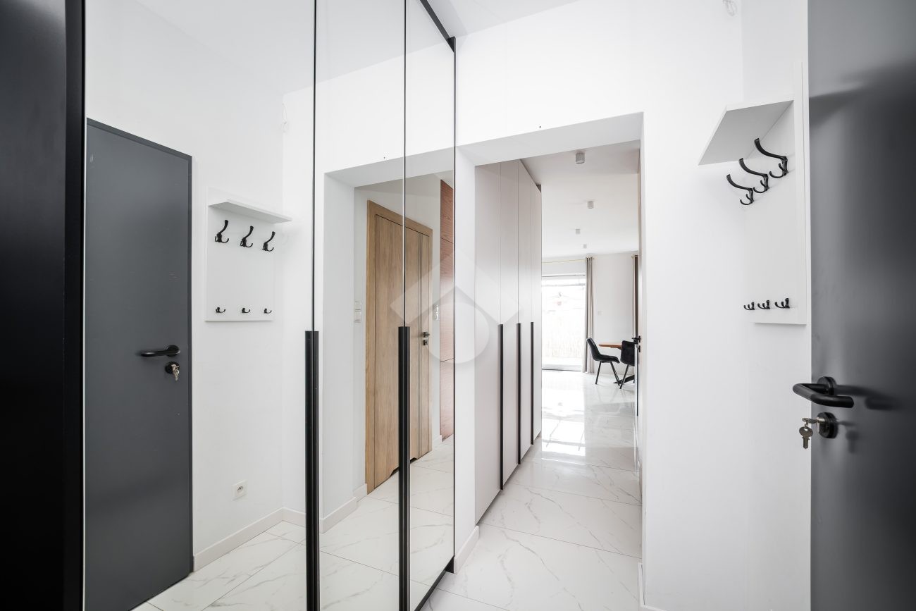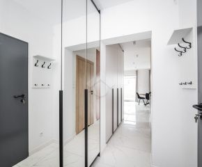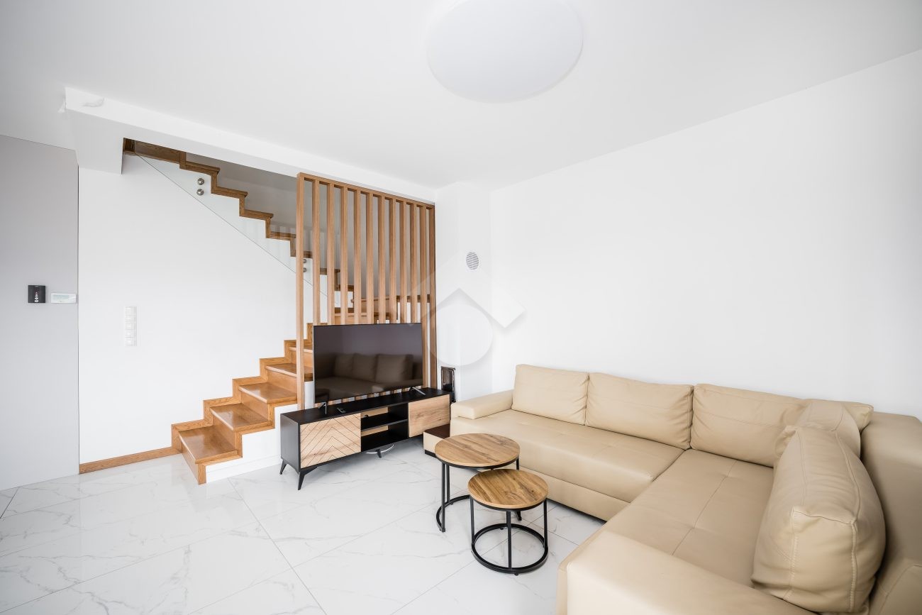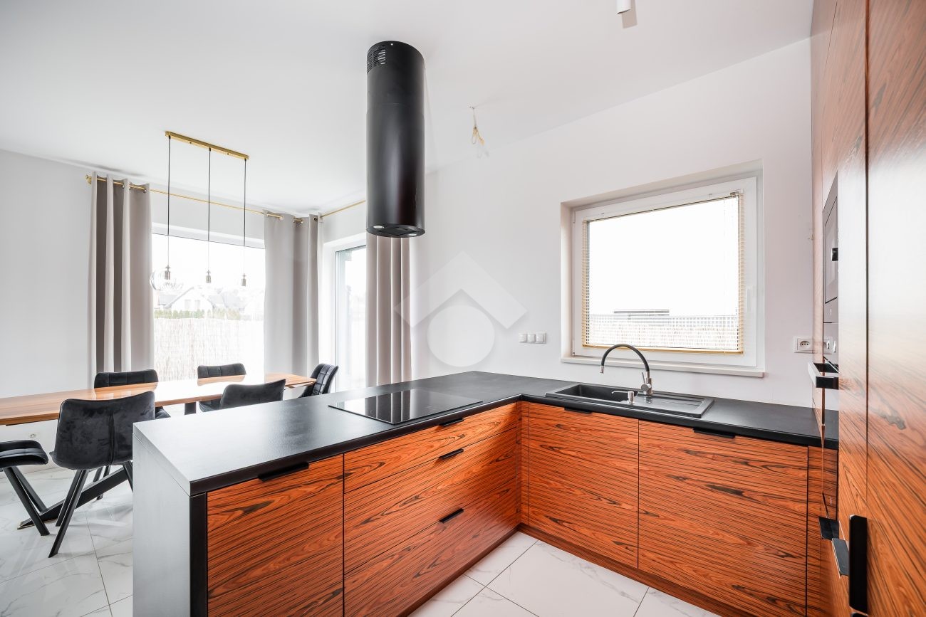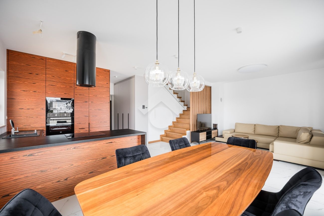 – przestronny salon z aneksem kuchennym o pow. 31,8m² posiadający wyjście na taras oraz wyposażony w meble na wymiar, zabudowaną lodówko-zamrażarkę, płytę indukcyjną, zmywarkę, piekarnik, mikrofalówkę, okap, sofę, TV, duży stół z krzesłami