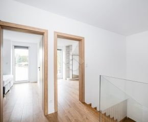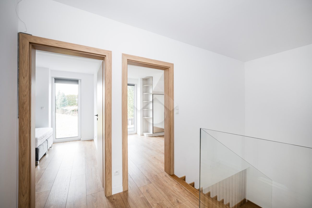 Piętro stanowi strefę prywatną – cztery sypialnie, które mogą pełnić funkcję pokoi dziecięcych, sypialni głównej, gabinetu lub pokoju gościnnego, co daje dużą elastyczność aranżacyjną.