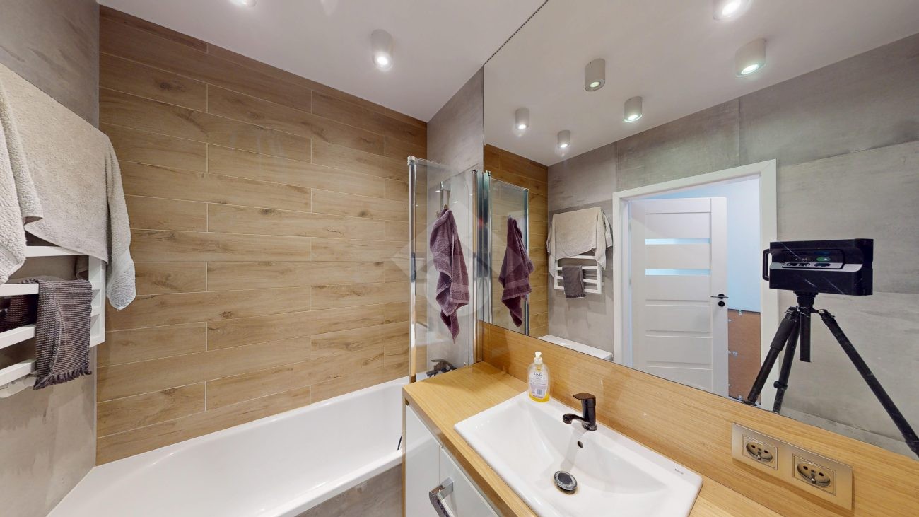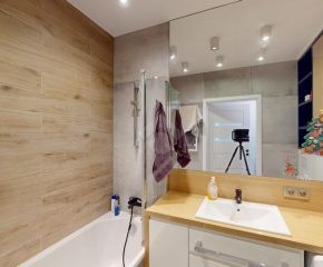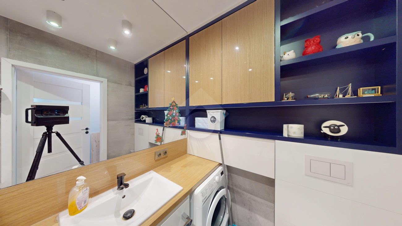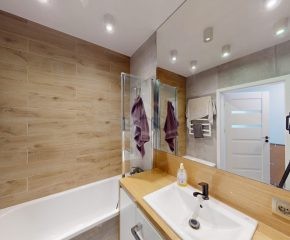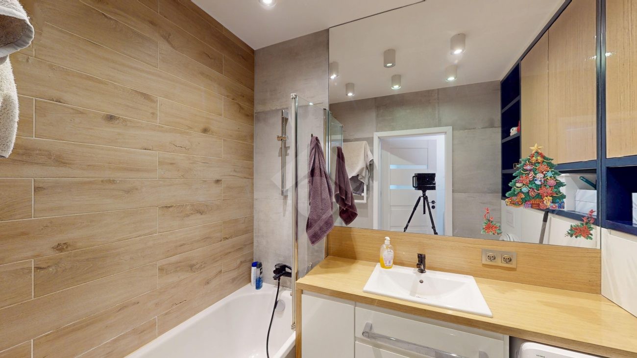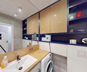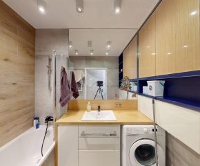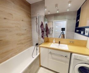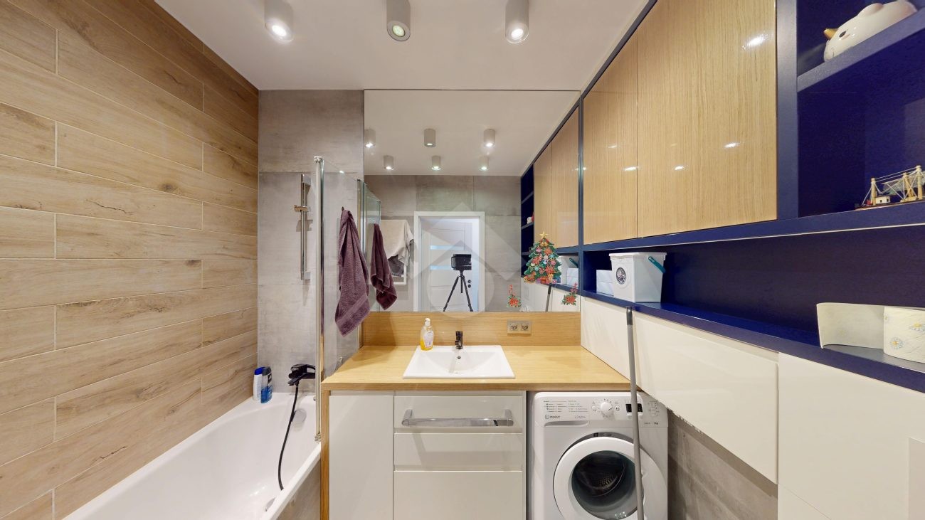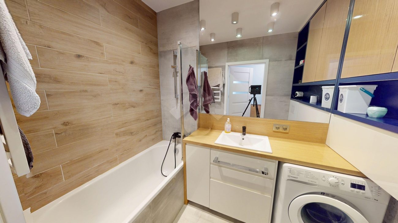 Łazienka wyposażona jest w wannę z funkcją prysznica, pralkę oraz zabudowaną umywalkę z licznymi szafkami. Dodatkowe zabudowane szafki nad toaletką zapewniają dodatkowe miejsce do przechowywania.