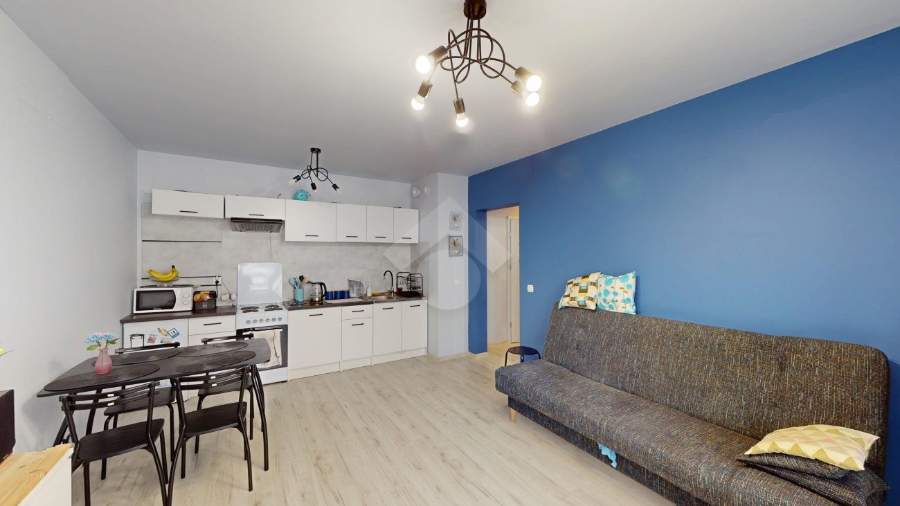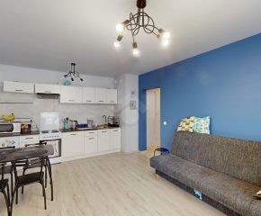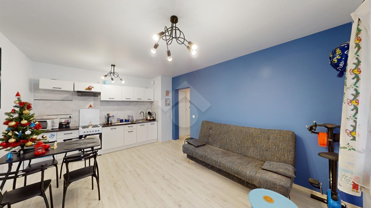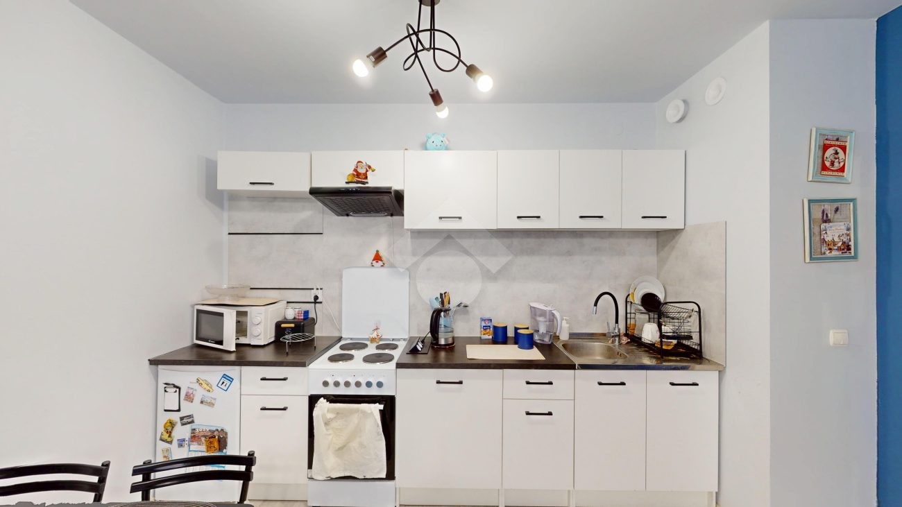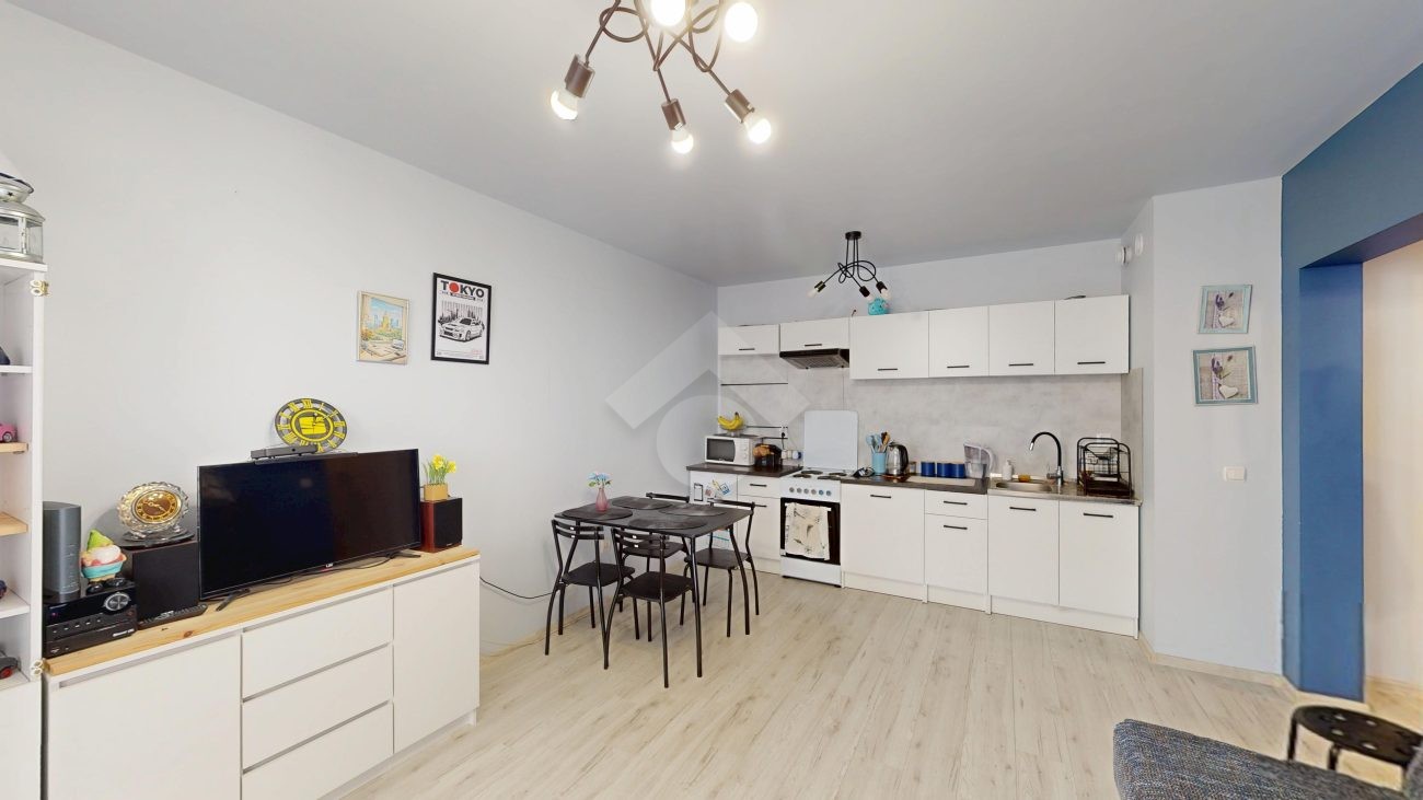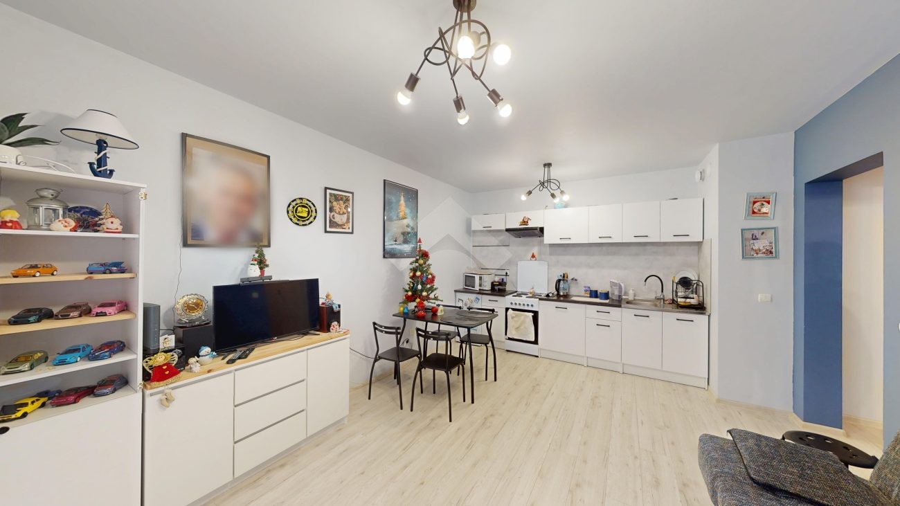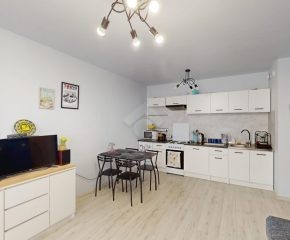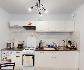 Część wypoczynkowa została wyposażona w wygodną kanapę, szafę oraz komodę. Aneks kuchenny posiada pełne wyposażenie: płytę grzewczą, piekarnik, lodówkę, zlew, okap oraz zmywarkę. W pomieszczeniu znajduje się również stolik z krzesłami, tworzący funkcjonalną strefę jadalnianą.