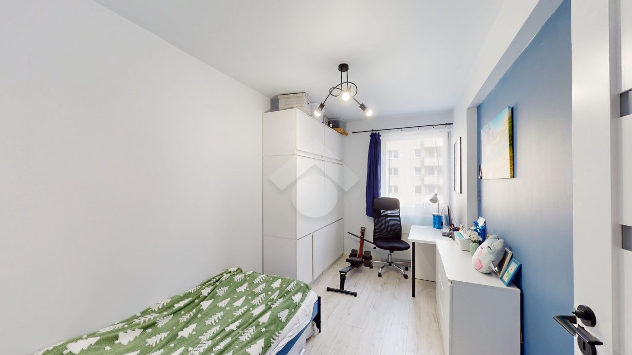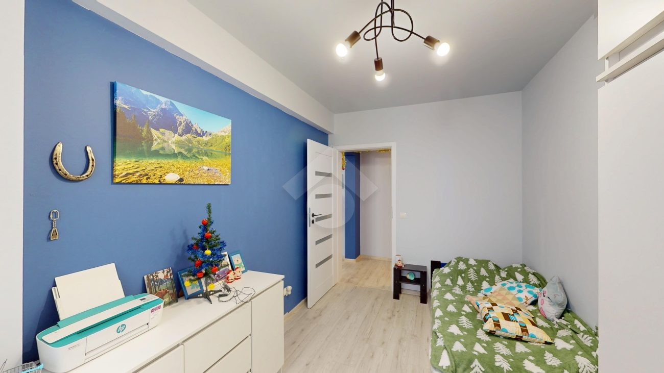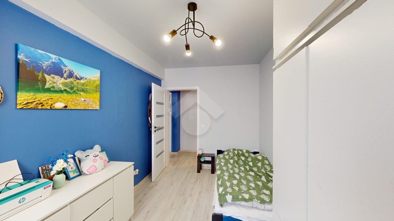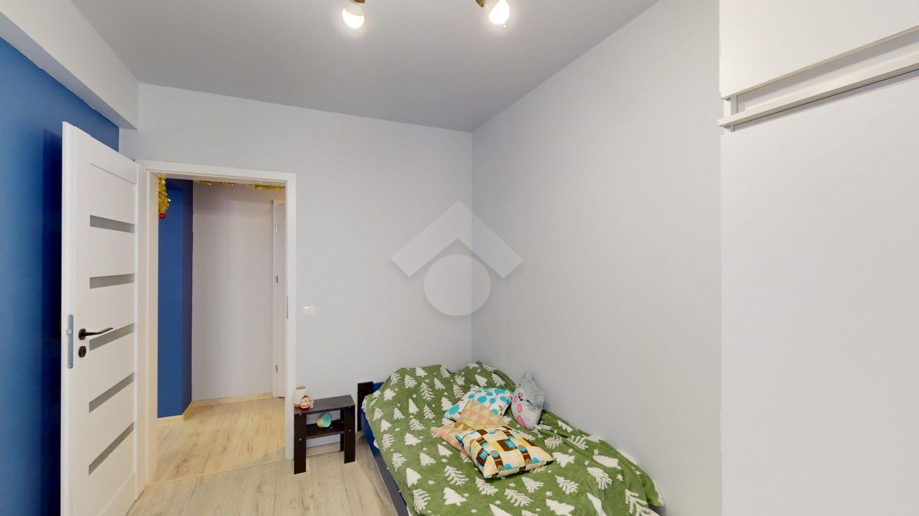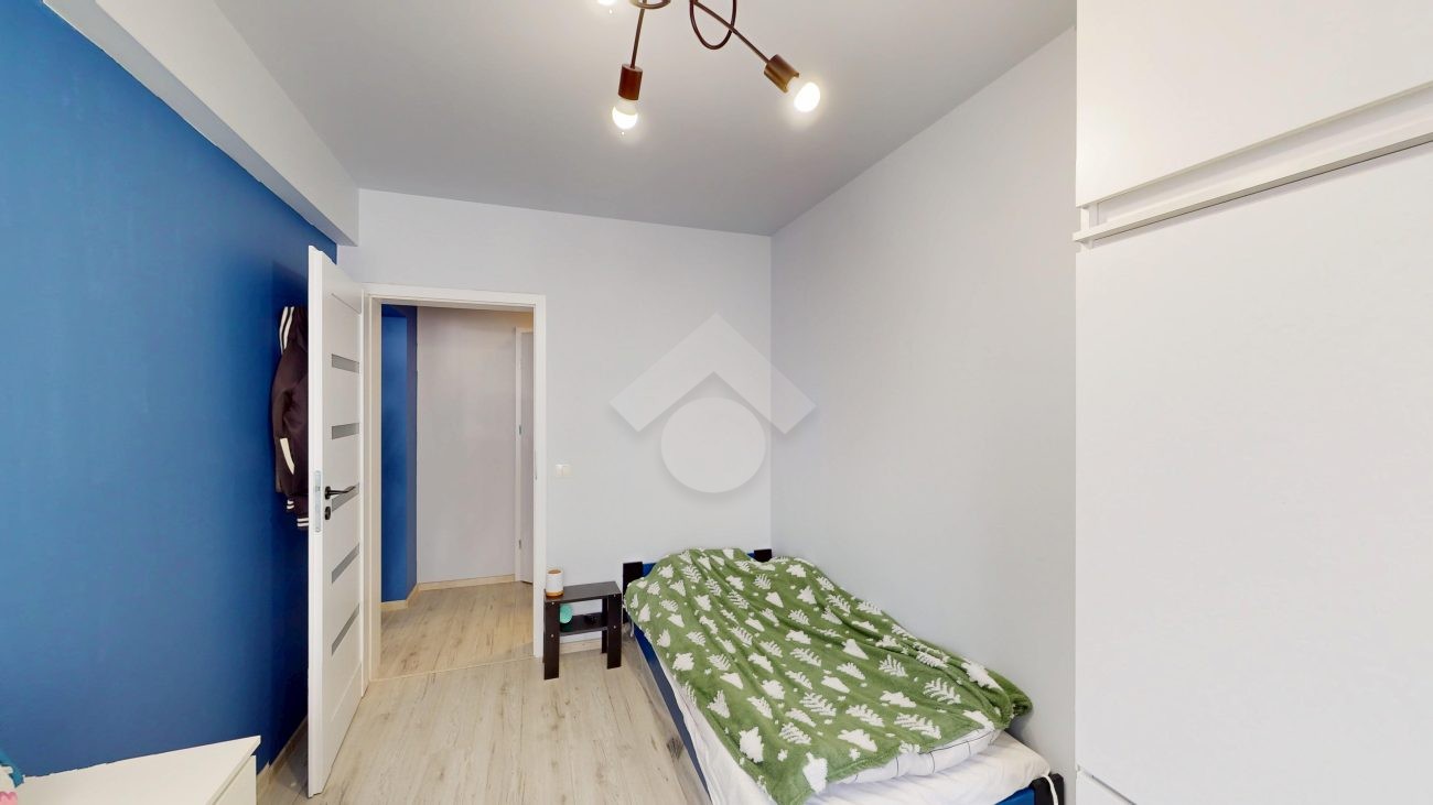 Jasna sypialnia oferuje łóżko, dużą pojemną szafę oraz biurko, co tworzy przytulną i komfortową przestrzeń.