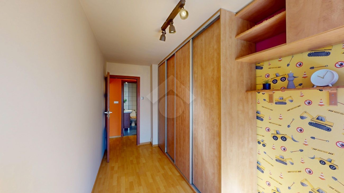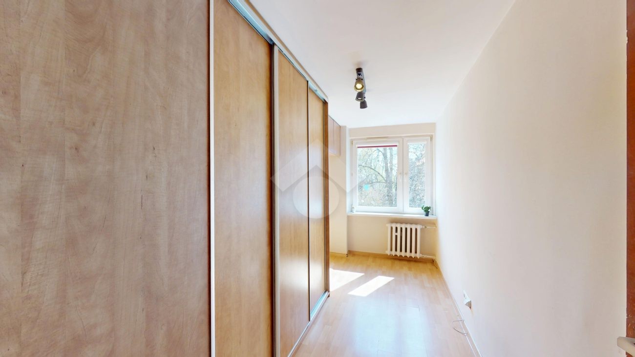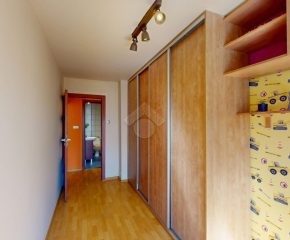 Sypialnia stanowi spokojną przestrzeń do odpoczynku i została wyposażona w dużą, pojemną szafę, ułatwiającą przechowywanie odzieży i innych rzeczy osobistych.