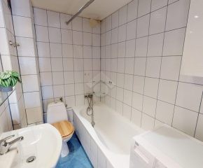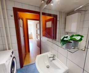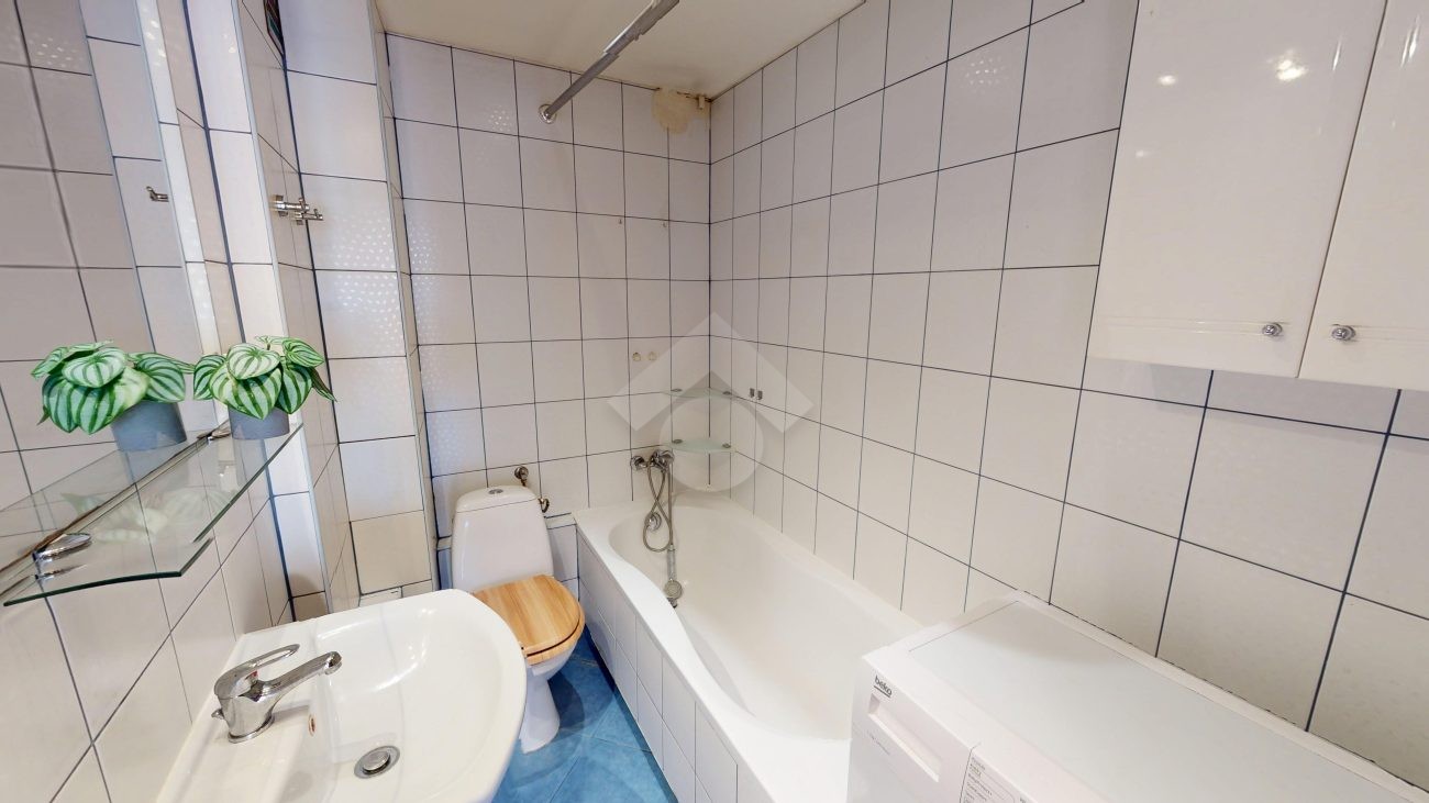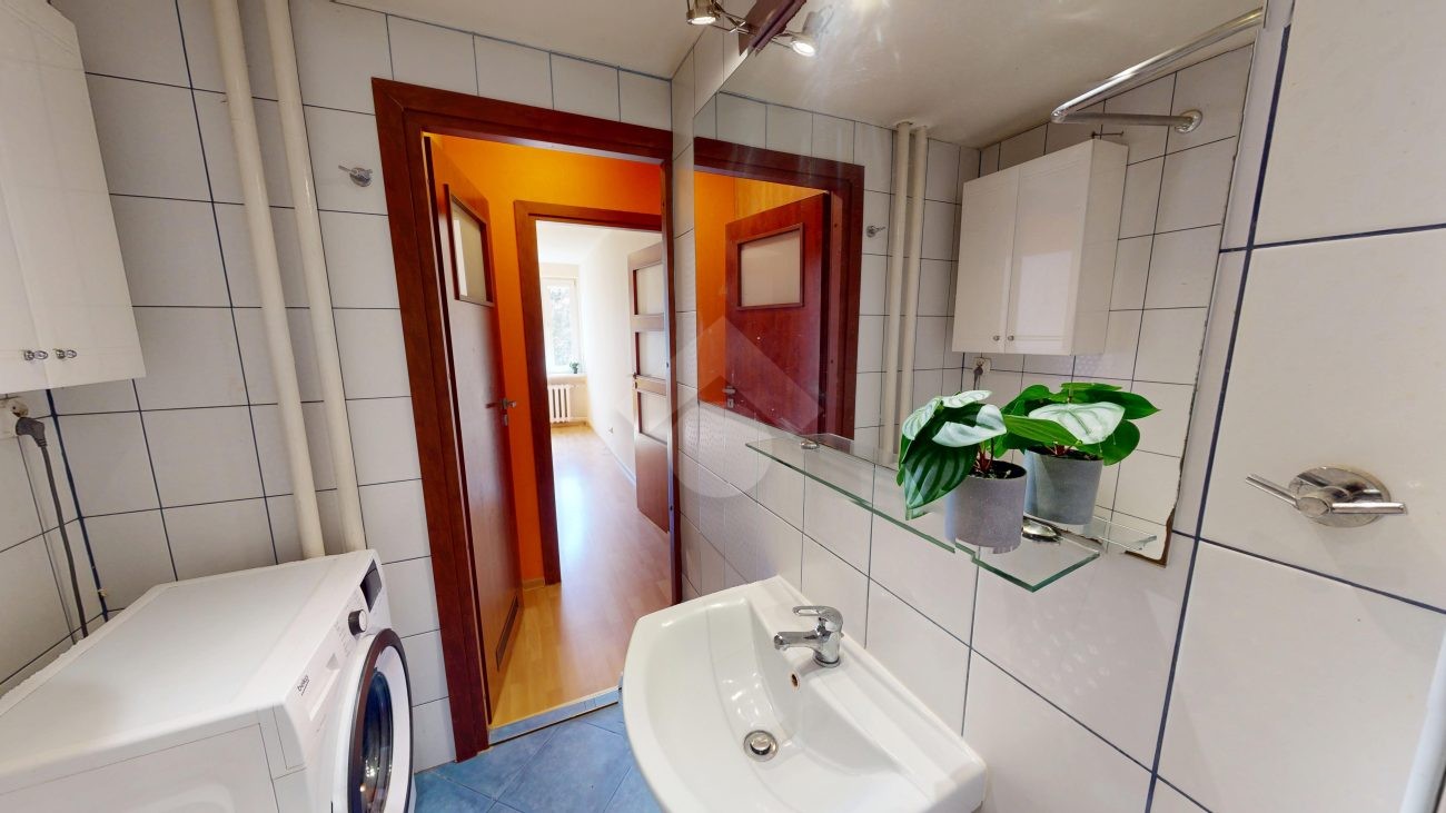 W łazience znajduje się wanna, umywalka oraz pralka, co zapewnia wygodę codziennego użytkowania.