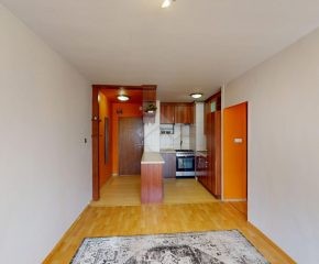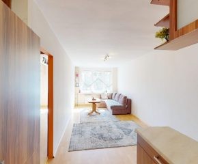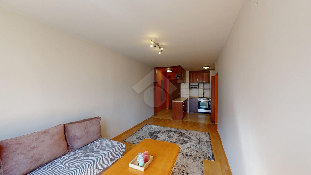 W przestronnym salonie znajduje się wygodna, rozkładana kanapa – idealna zarówno do codziennego wypoczynku, jak i przyjmowania gości – oraz stół umożliwiający komfortowe spożywanie posiłków lub pracę.