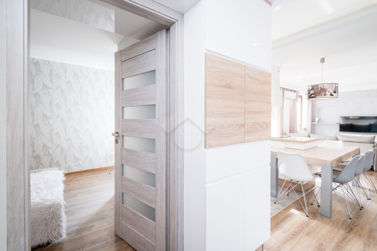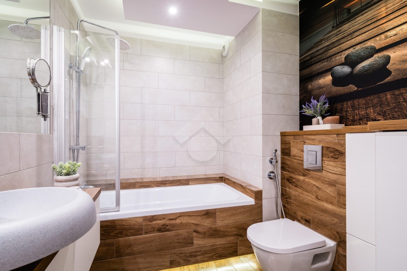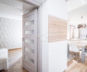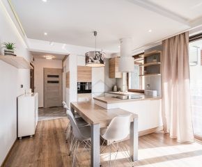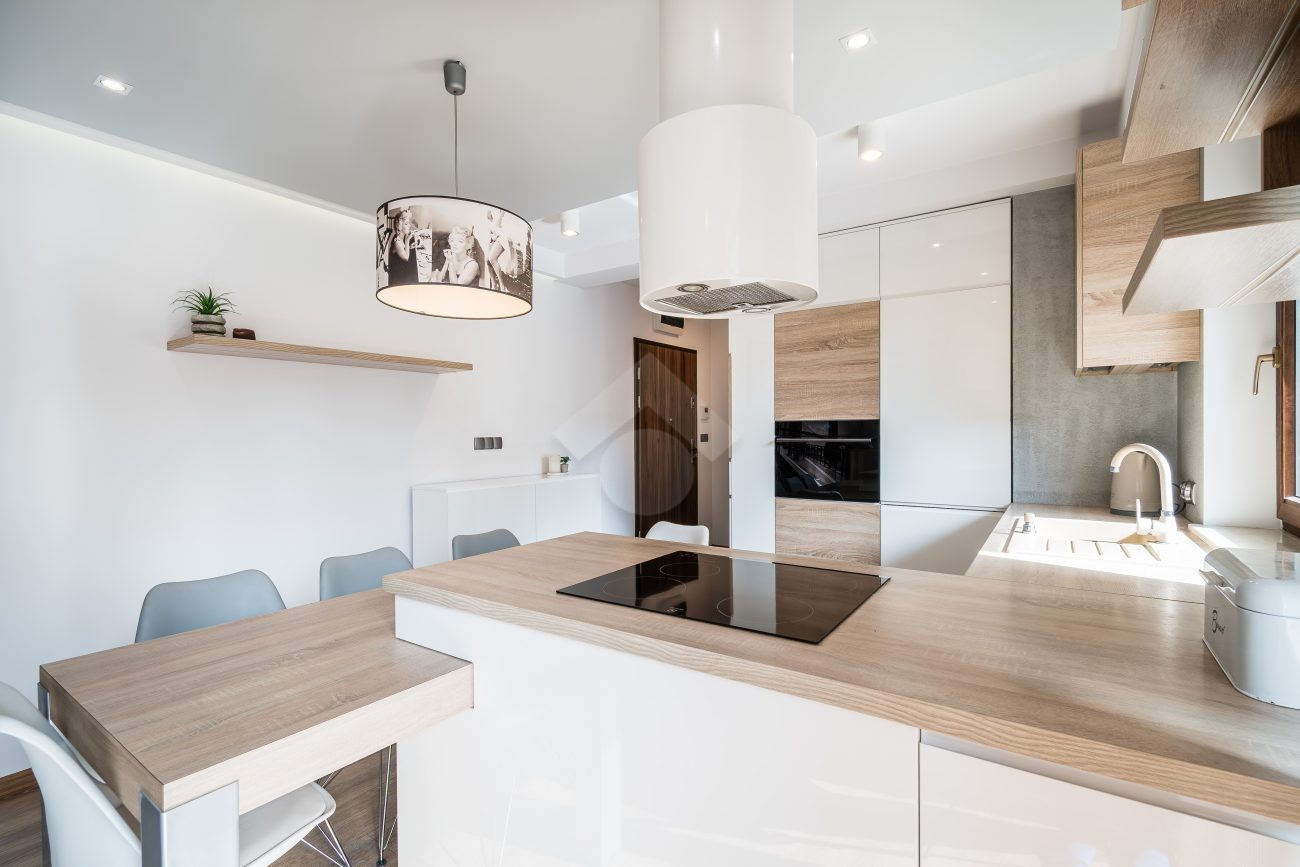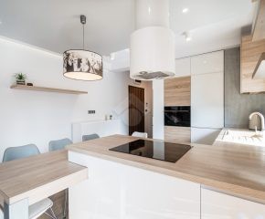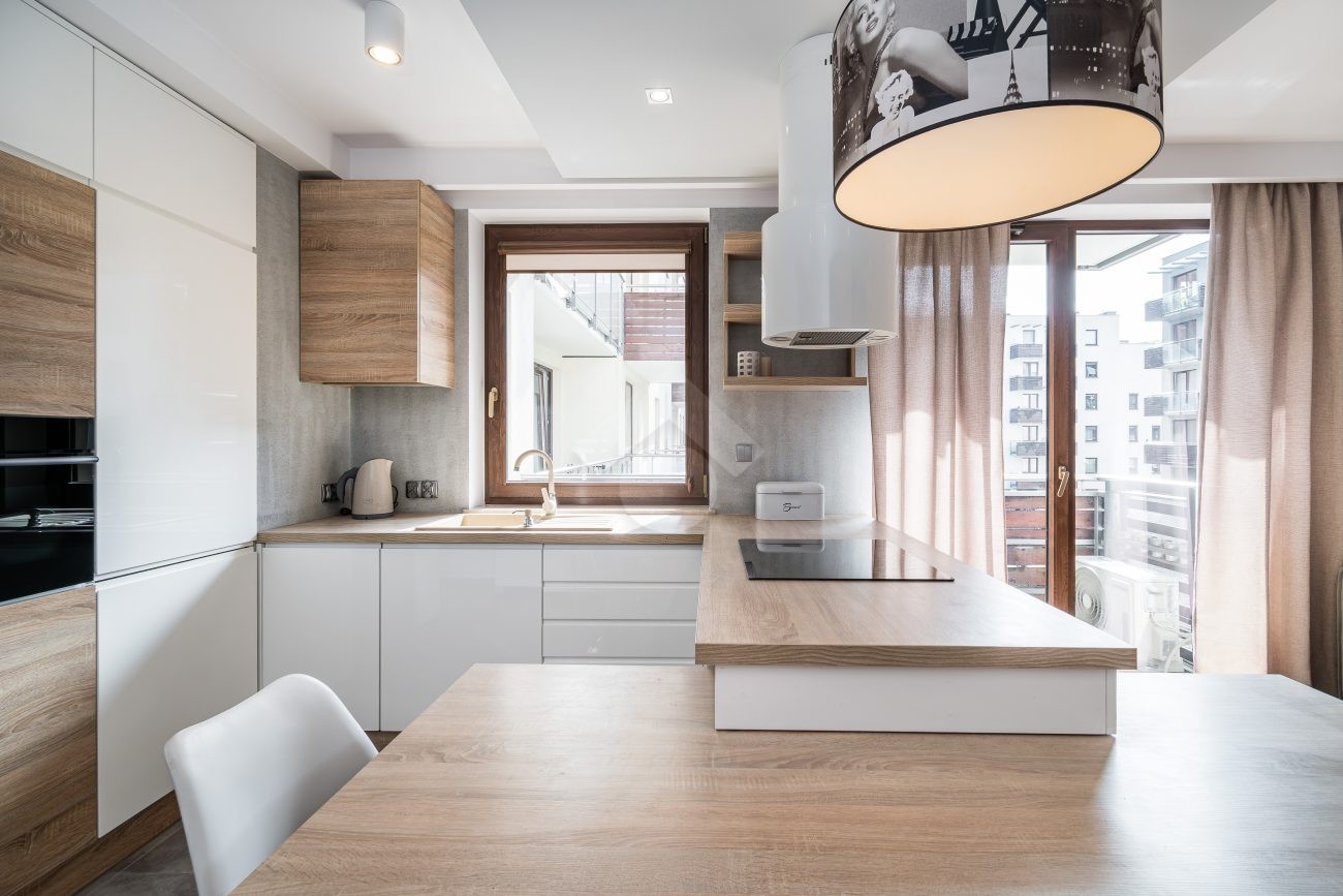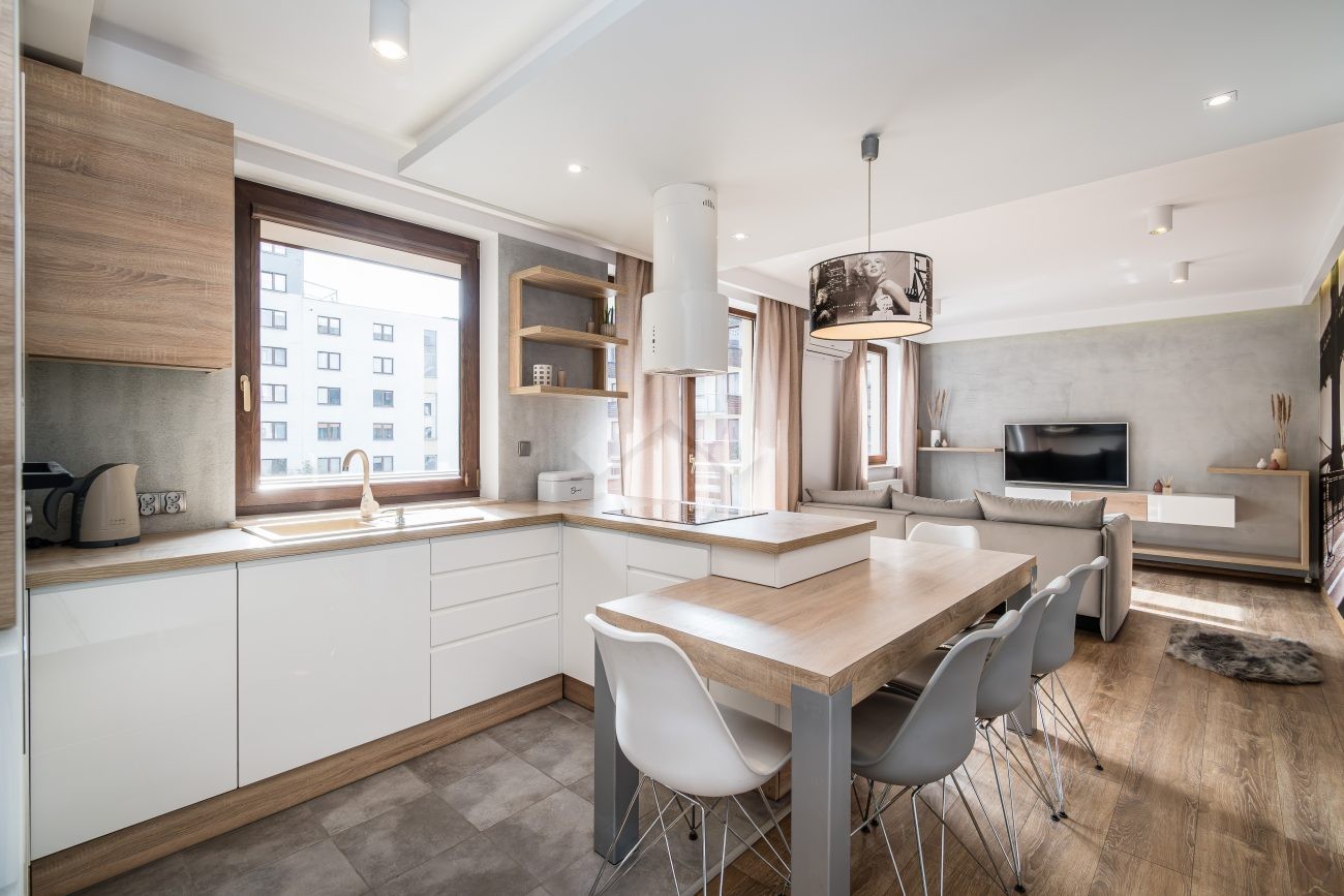 Wysoki standard – w kuchni zabudowa kuchenna na wymiar wyposażona w podstawowe sprzęty AGD (lodówka, zmywarka, płyta indukcyjna, piekarnik). W łazience znajduje się wanna, umywalka, pralka oraz WC.