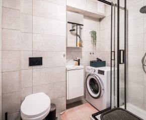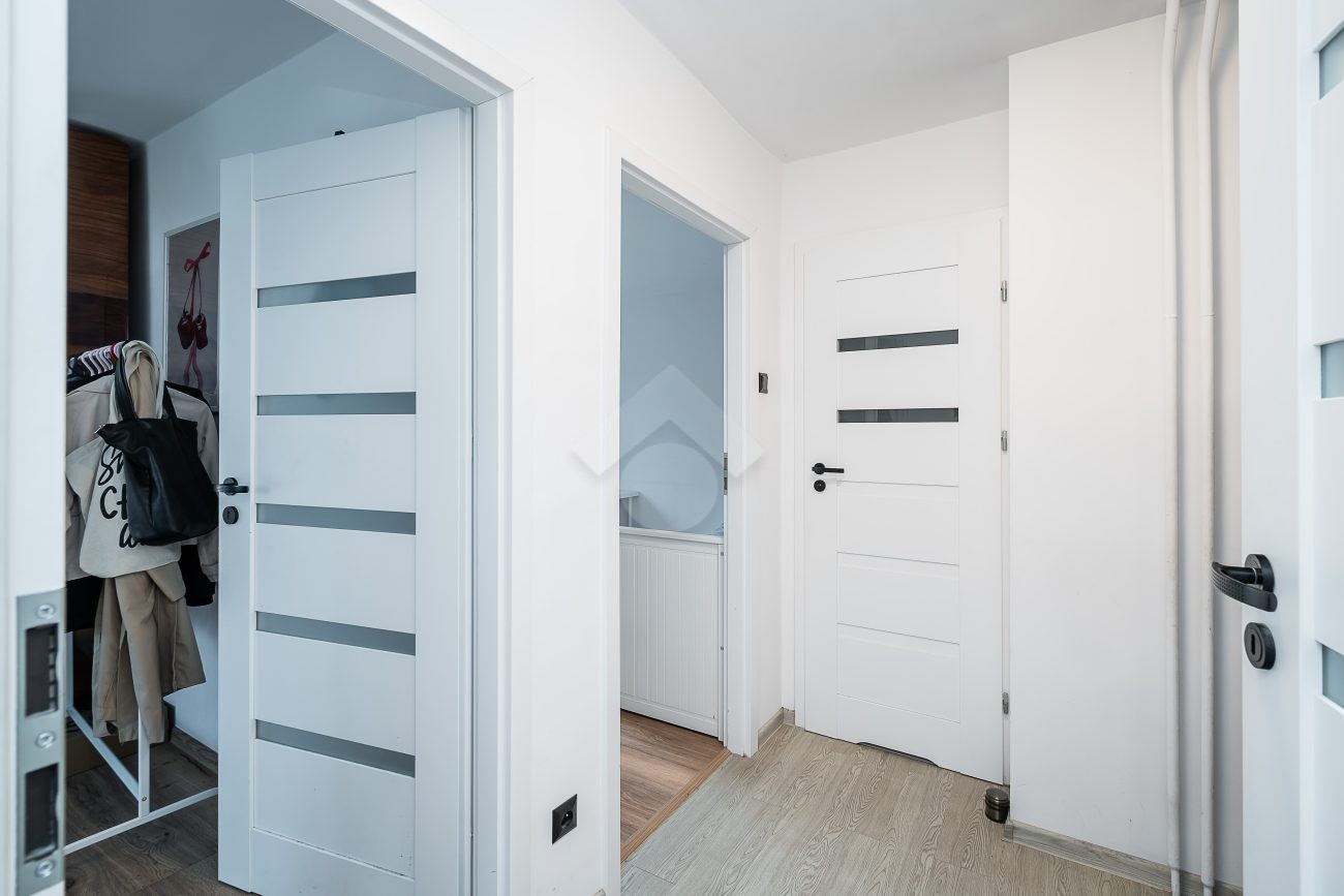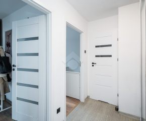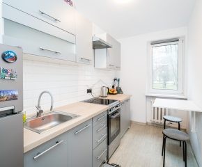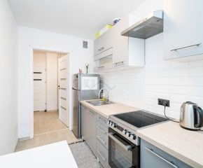 Condition of the apartment: After a full renovation. The rooms have panel flooring, the kitchen and hallway have vinyl panels, and the bathroom is tiled. The bathroom includes a washing machine and a shower. The kitchen is fully equipped with built-in furniture, a fridge with freezer, an electric hob, and an oven. The apartment has central heating from the municipal network. The unit has a dual exposure—north and east.