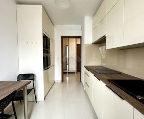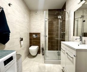 Bardzo dobry – mieszkanie jest w pełni urządzone. W kuchni znajduje się zabudowa kuchenna oraz urządzenia potrzebne do codziennego użytku (płyta indukcyjna, piekarnik, zmywarka oraz lodówka). W łazience znajduje się prysznic, umywalka, pralka oraz WC.