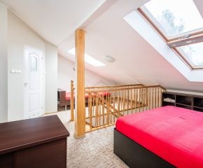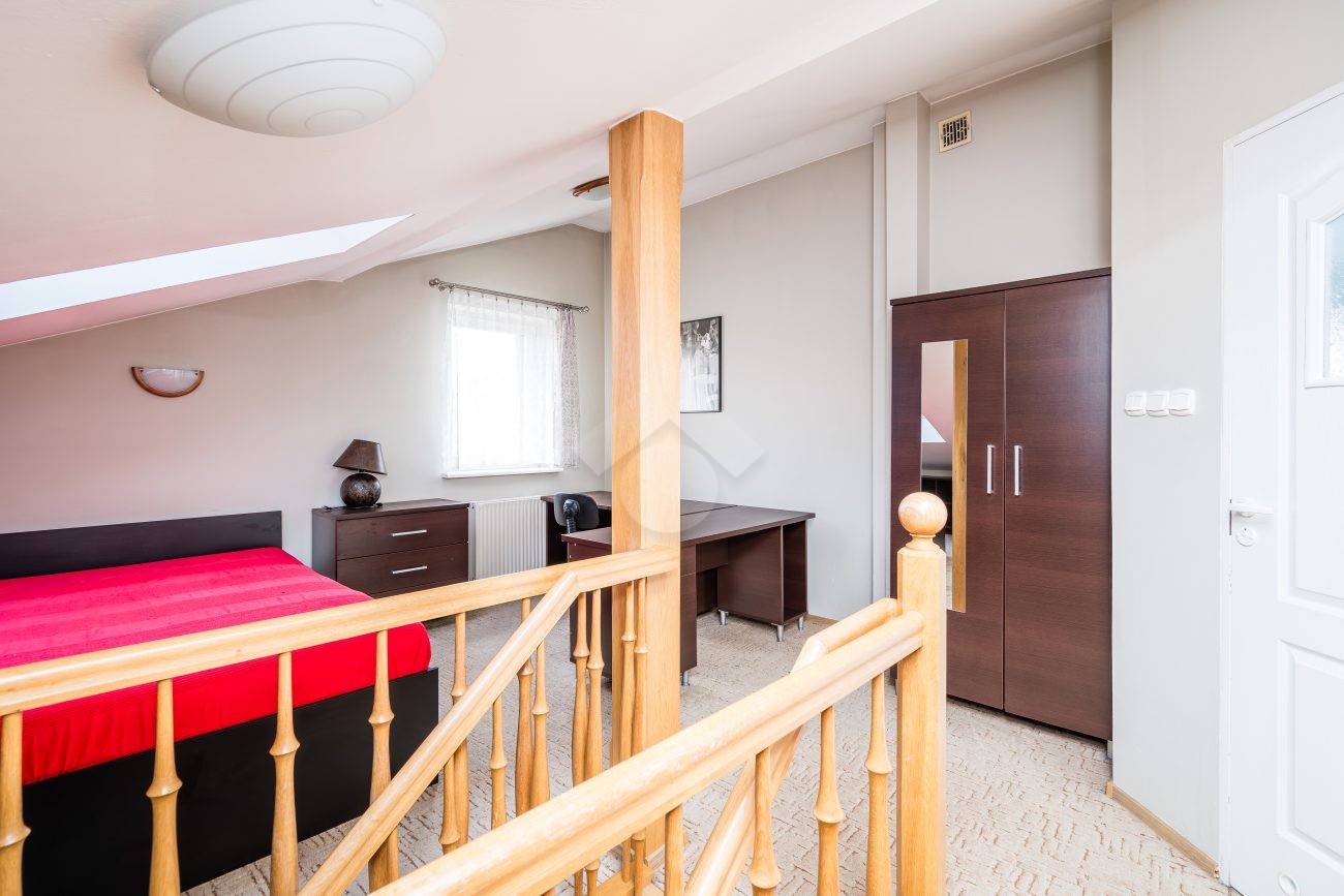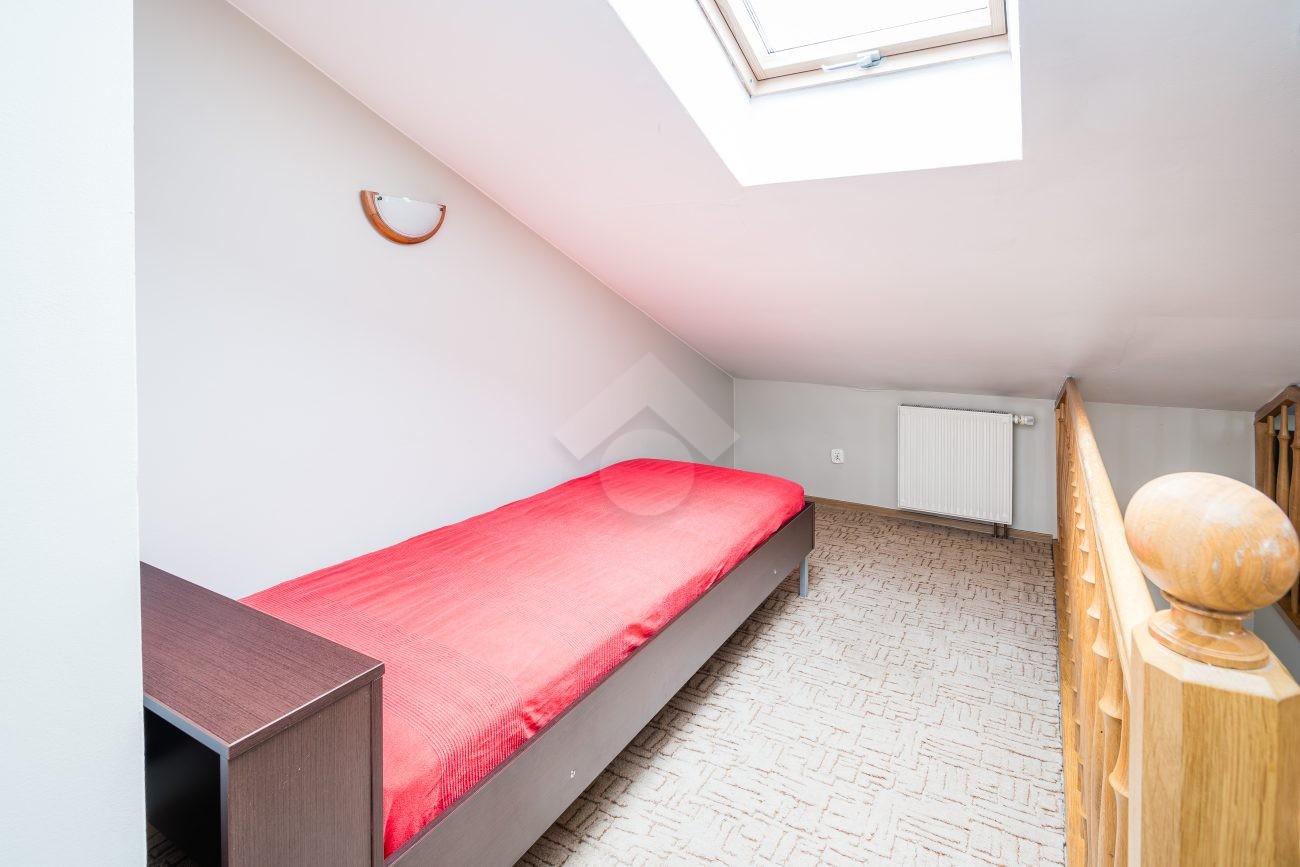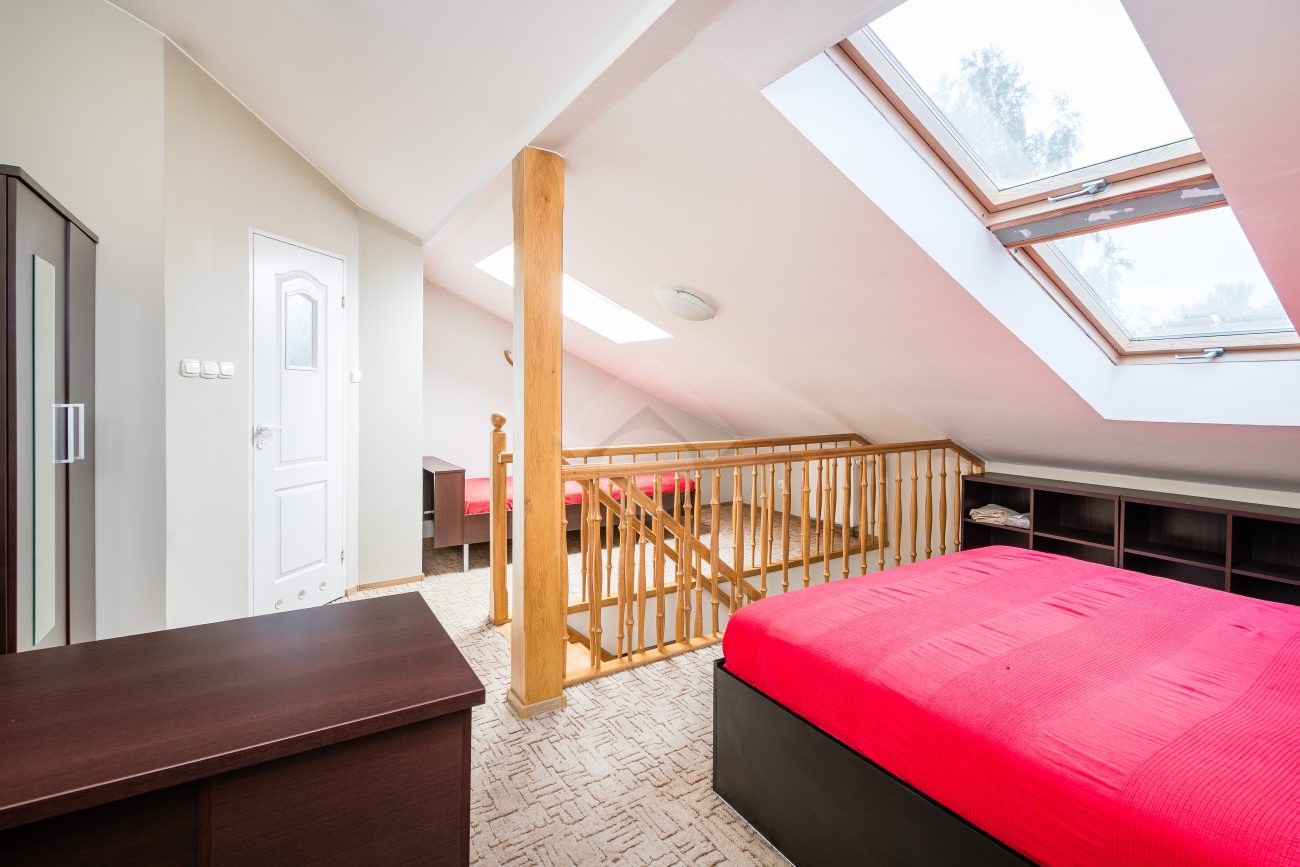 I PIĘTRO: przestronny salon z aneksem kuchennym, łazienka z WC oraz przedpokój.