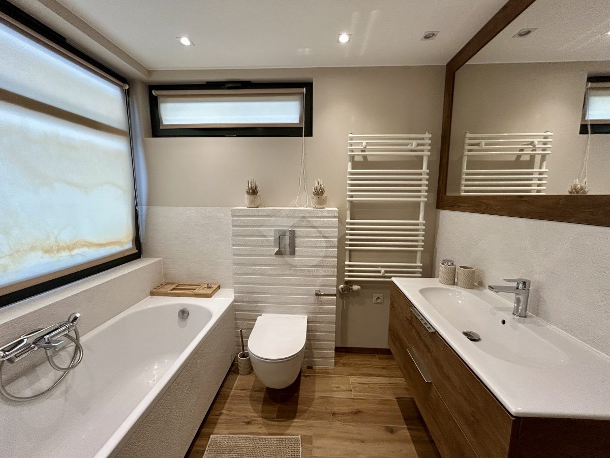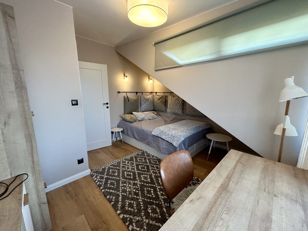 Dwupoziomowy układ zapewnia komfortowy podział na strefę dzienną i prywatną oraz wysoki standard codziennego użytkowania.