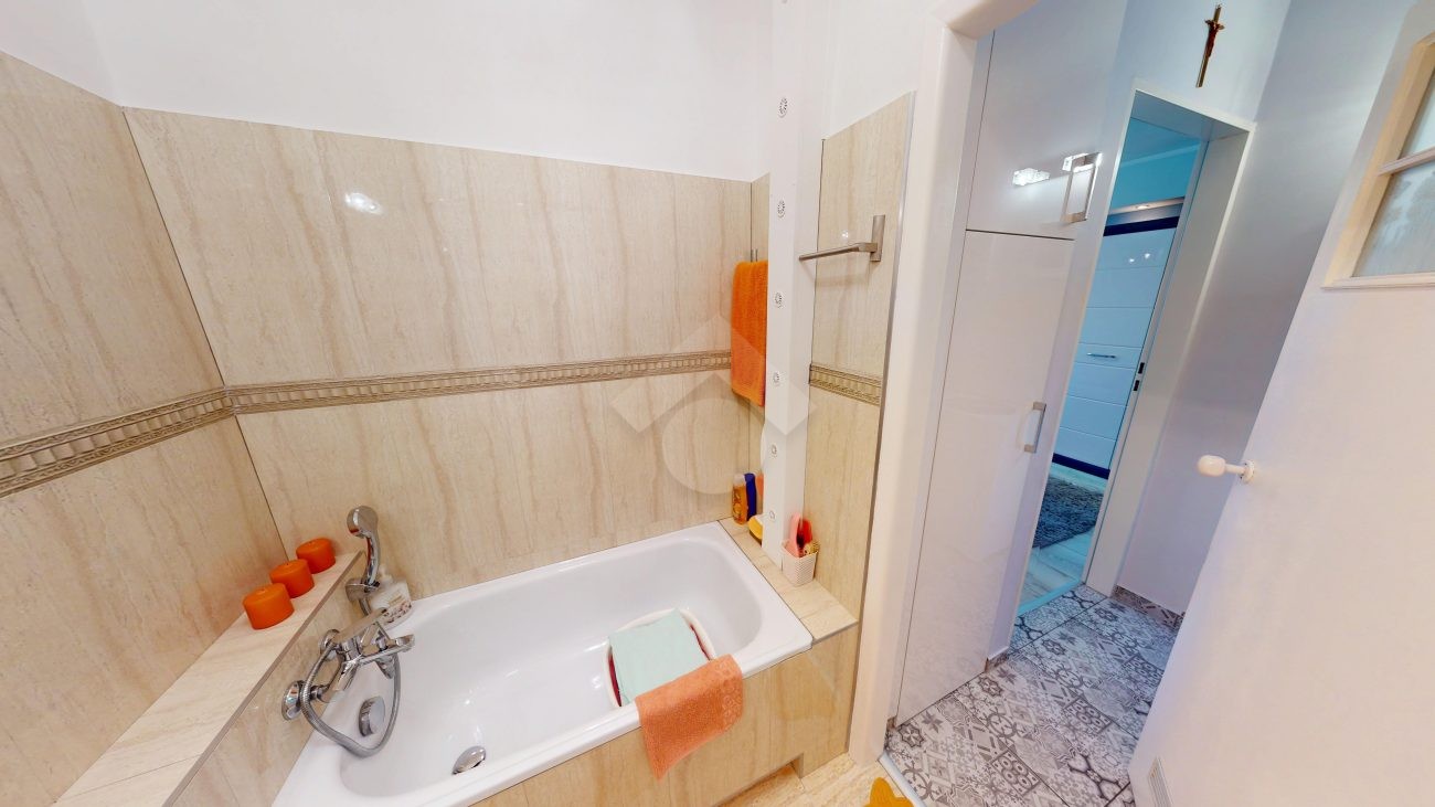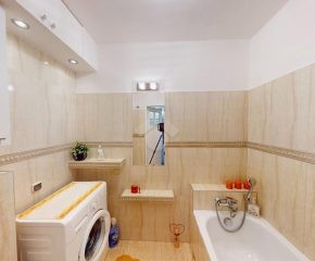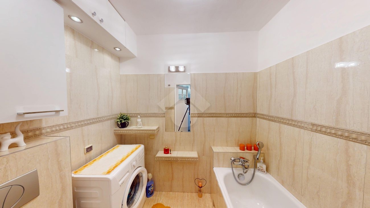 Łazienka wyposażona jest w wannę oraz pralkę.