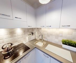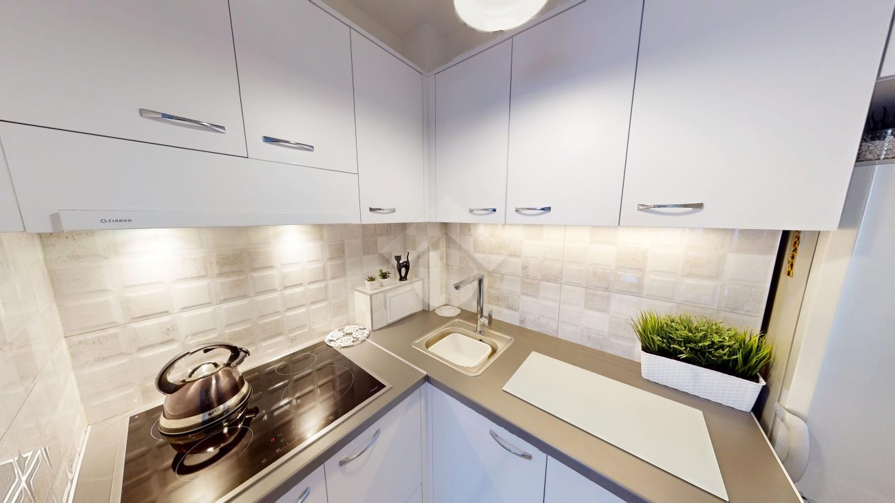 Kompaktowa, osobna kuchnia zawiera białą zabudowę oraz niezbędne sprzęty AGD, takie jak kuchenka indukcyjna, zlew i zmywarkę.