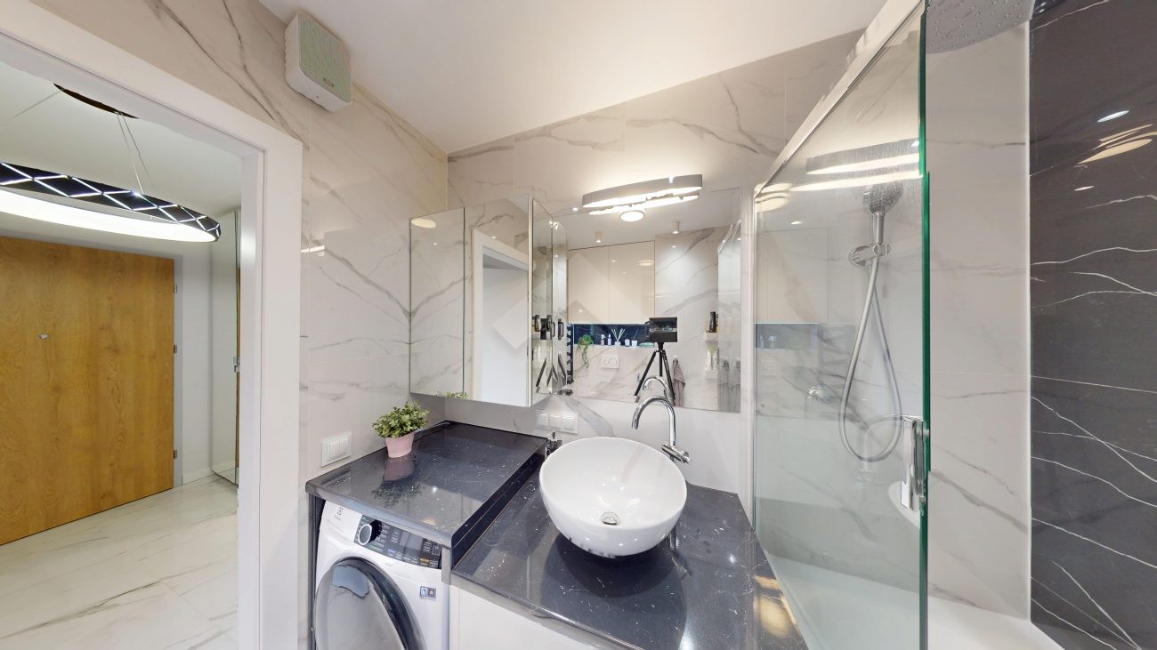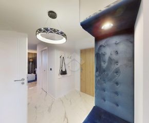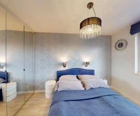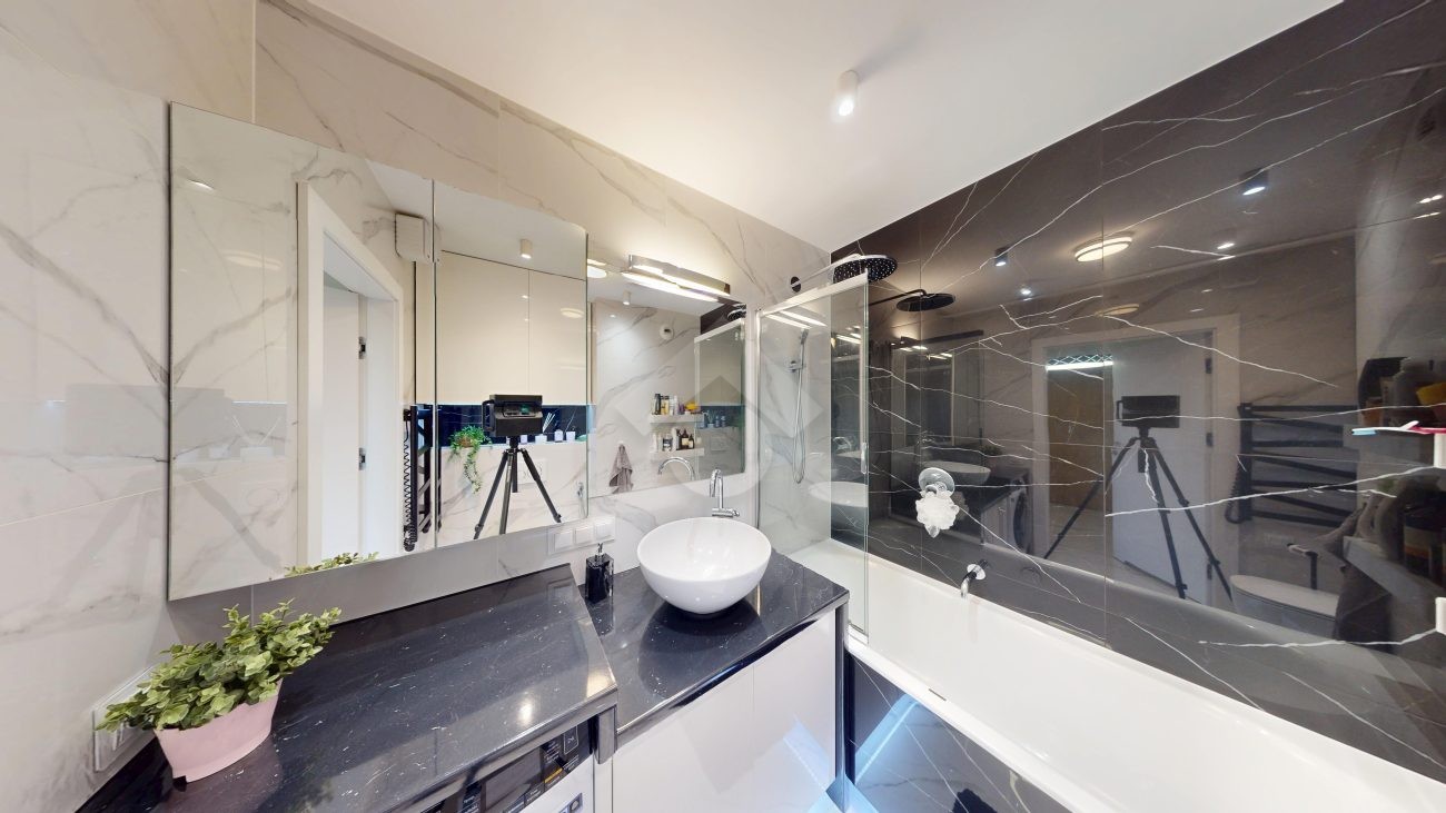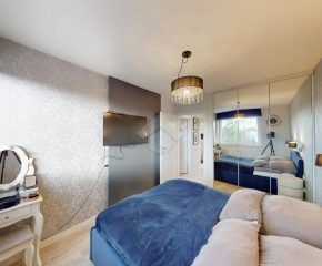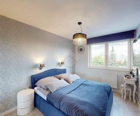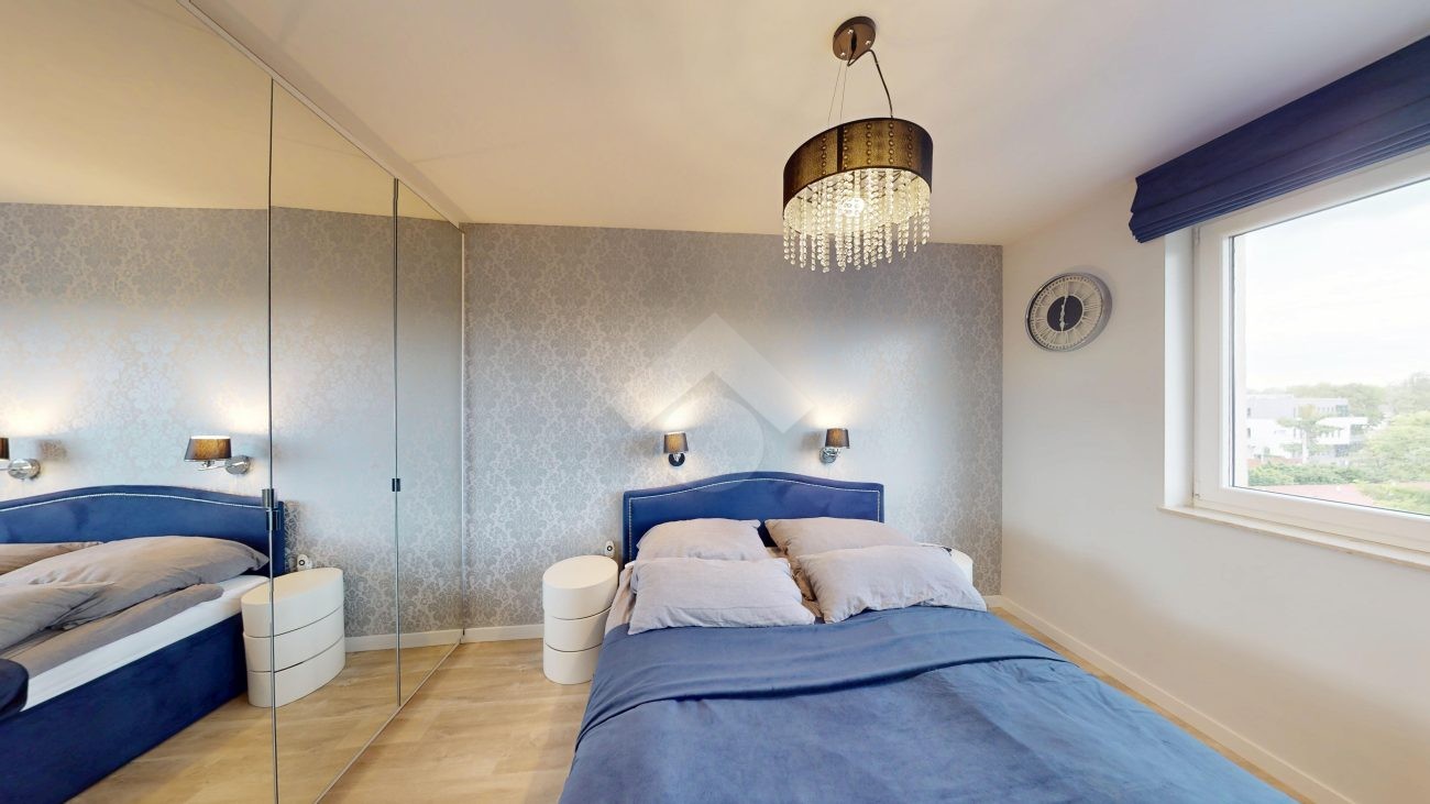 Łazienka utrzymana jest w nowoczesnym stylu, z marmurowymi płytkami i szklaną kabiną prysznicową. Obie sypialnie kontynuują motyw kolorystyczny mieszkania, z designerskimi meblami i subtelnym oświetleniem, które nadają wnętrzom elegancji i przytulności. W jednej z sypialni znajduje się wygodne łóżko z eleganckim zagłówkiem, które zapewnia komfortowy wypoczynek i dodaje wnętrzu przytulnego charakteru.