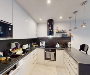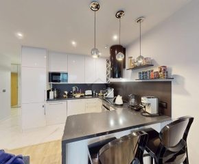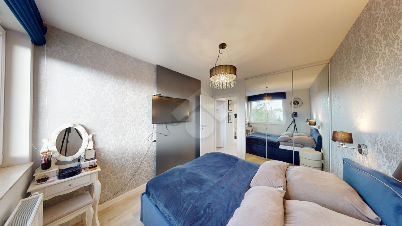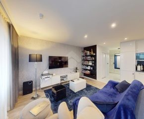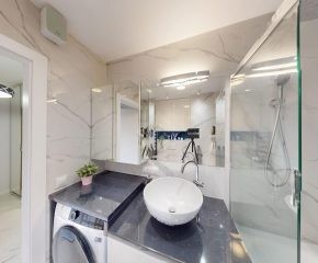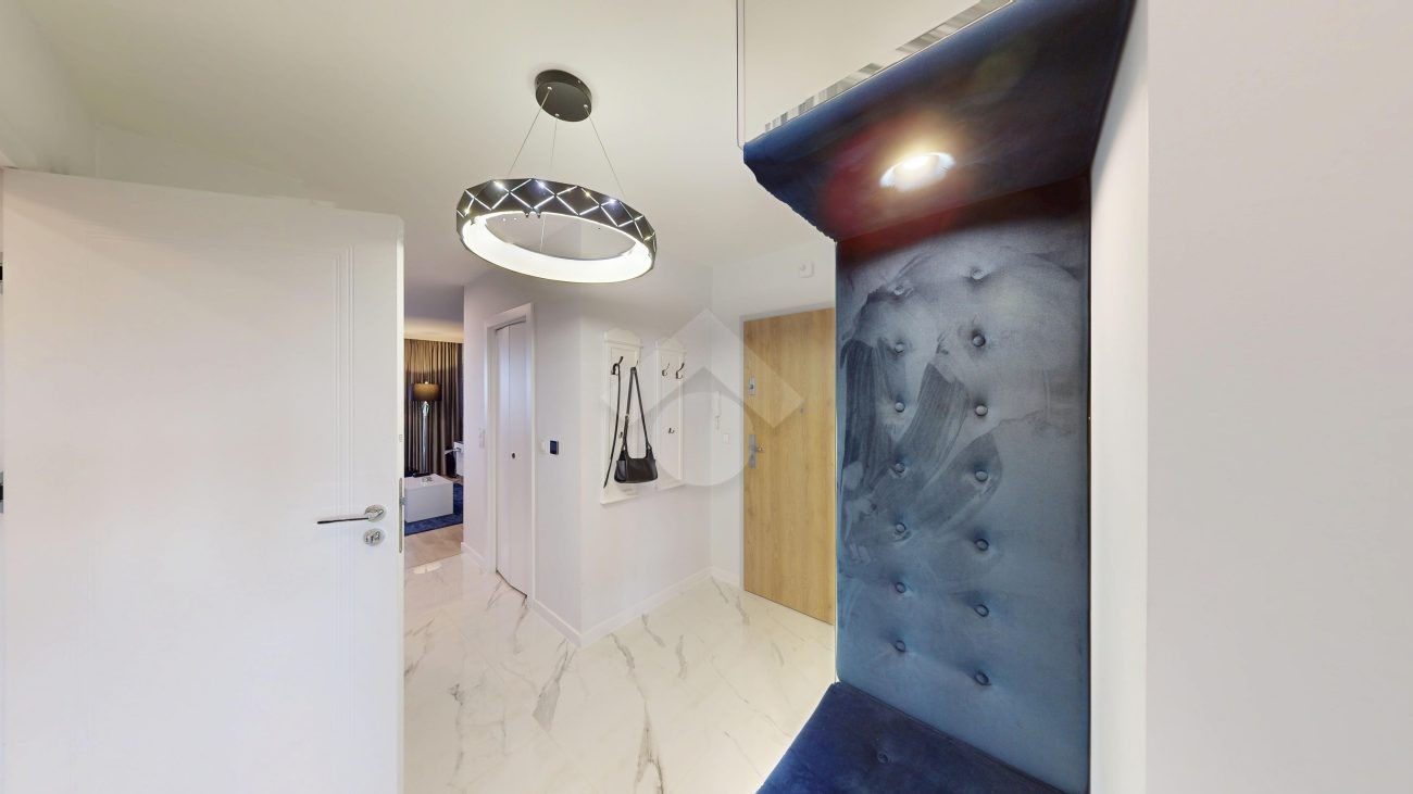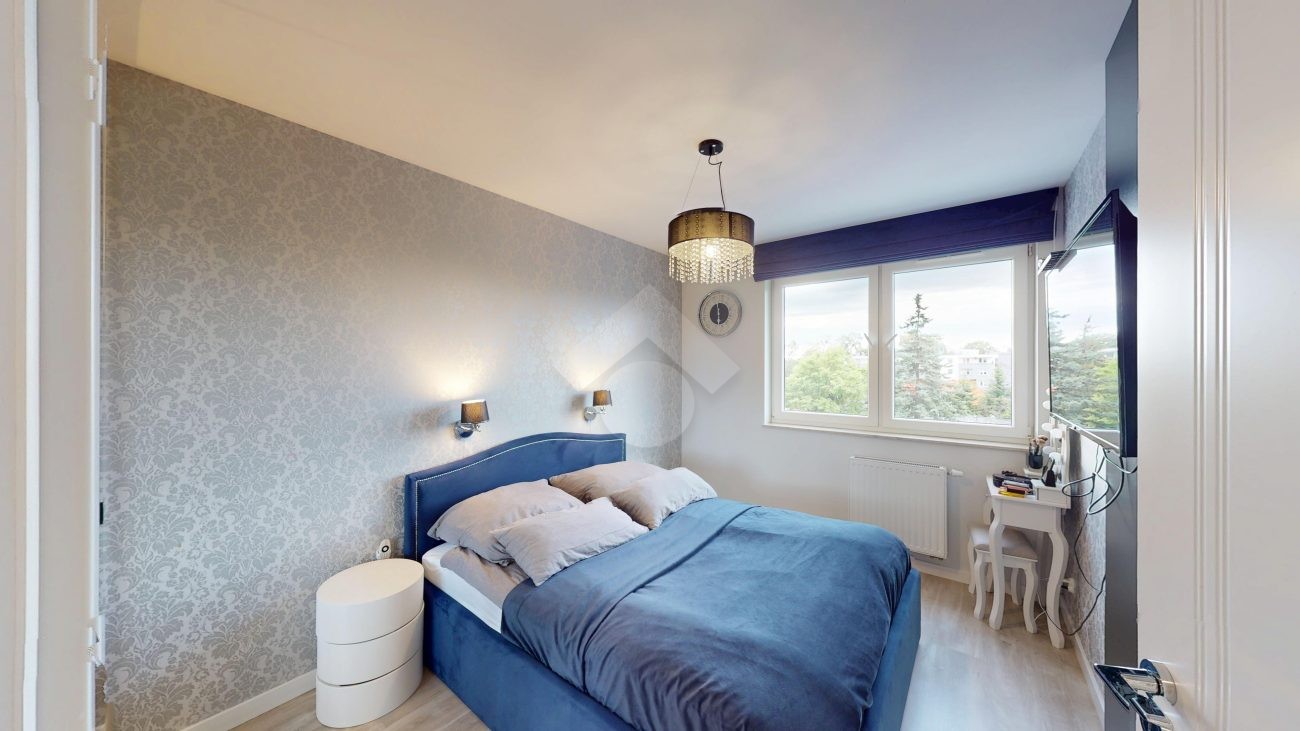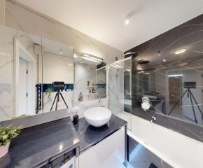 Łazienka utrzymana jest w nowoczesnym stylu, z marmurowymi płytkami i szklaną kabiną prysznicową. Obie sypialnie kontynuują motyw kolorystyczny mieszkania, z designerskimi meblami i subtelnym oświetleniem, które nadają wnętrzom elegancji i przytulności. W jednej z sypialni znajduje się wygodne łóżko z eleganckim zagłówkiem, które zapewnia komfortowy wypoczynek i dodaje wnętrzu przytulnego charakteru.