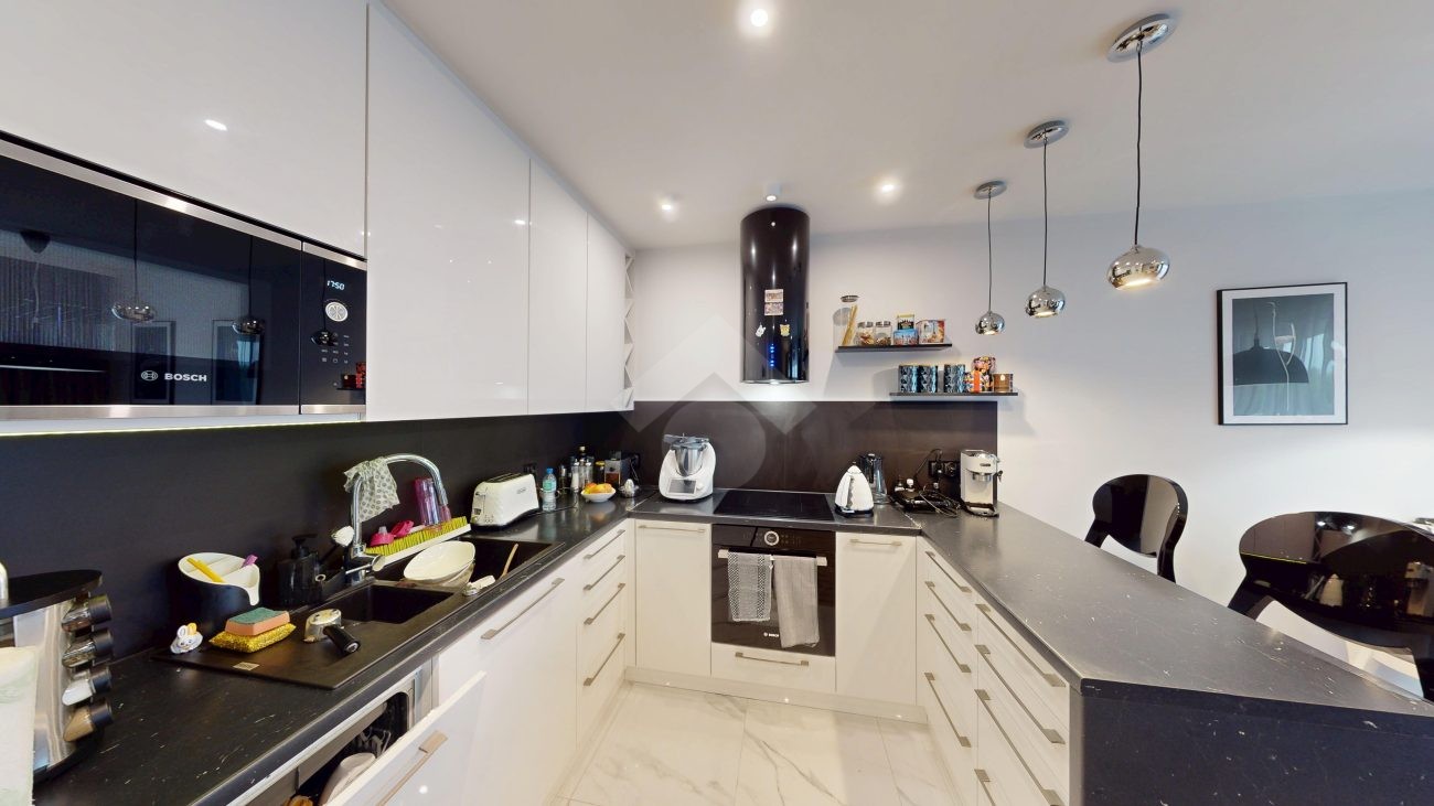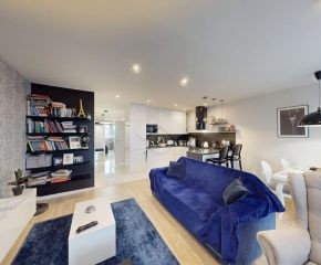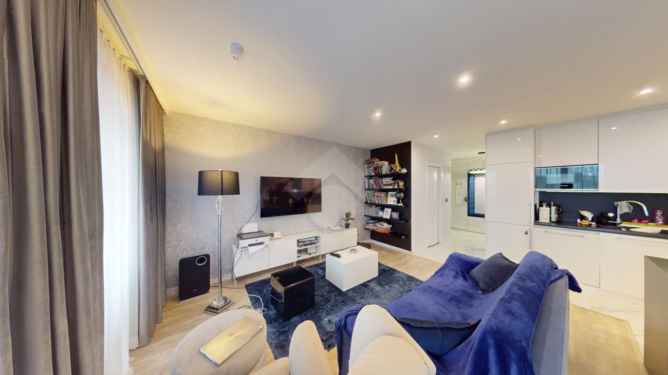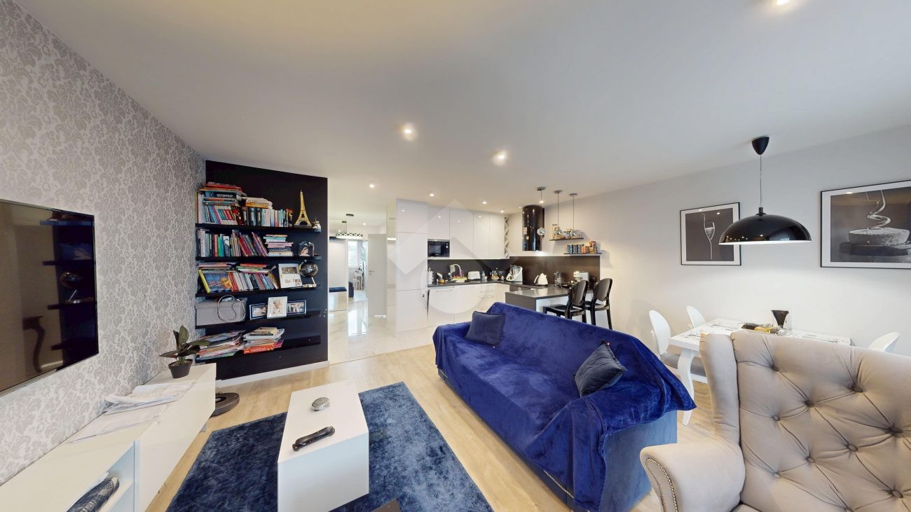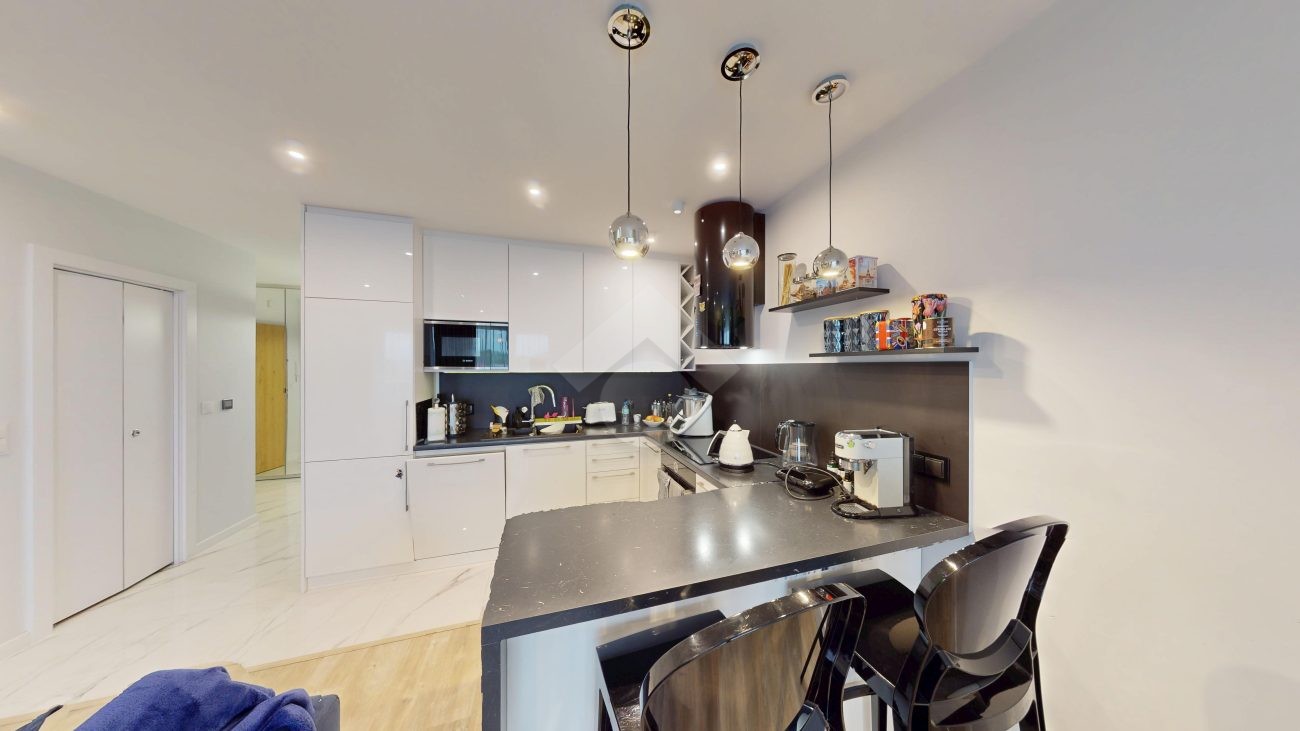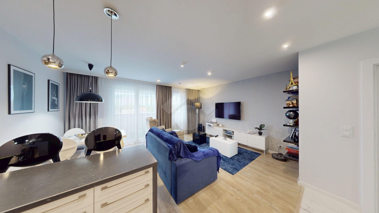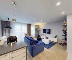 Mamy przyjemność zaprezentować Państwu przestronne mieszkanie położone w nowo zrealizowanej inwestycji Osiedle Symbioza, zlokalizowane na trzecim piętrze budynku oddanego do użytkowania w roku 2020 przy ulicy Sołtysowskiej. Apartament o powierzchni 63,6 m² został zaprojektowany z myślą o maksymalnym wykorzystaniu przestrzeni. Otwarta strefa dzienna łączy salon z kuchnią, której biała zabudowa i ciemne blaty harmonijnie współgrają z granatową sofą, tworząc elegancką i funkcjonalną przestrzeń.