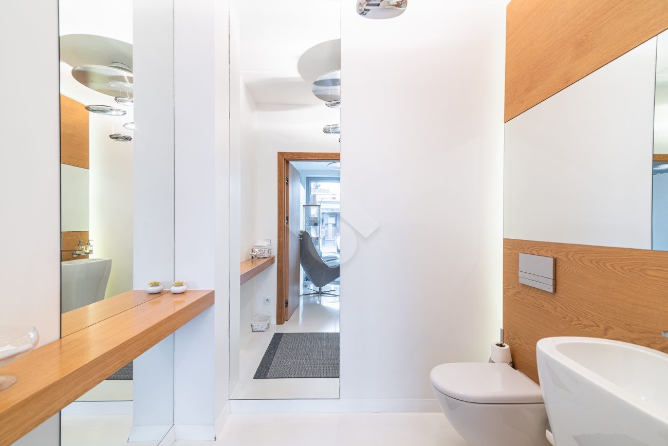 Lokal wyposażony jest w klimatyzację, wentylację, rekuperację oraz system nagłośnieniowy. Posadzka z żywicy epoksydowej, która charakteryzuje się dużą trwałością i odpornością na wilgoć, z atestem medycznym/sanitarnym. Na zewnątrz rolety antywłamaniowe, wewnątrz czujki alarmowe. Każde z pomieszczeń wyposażone jest w kamery.