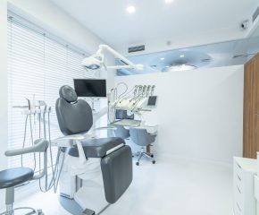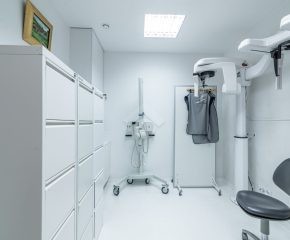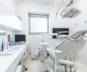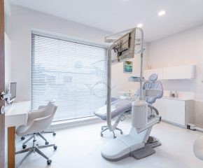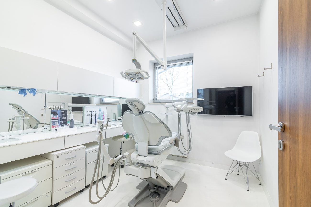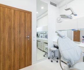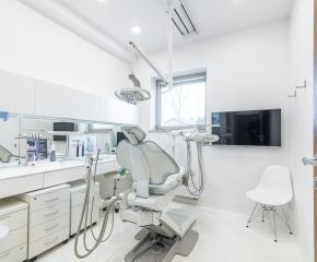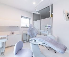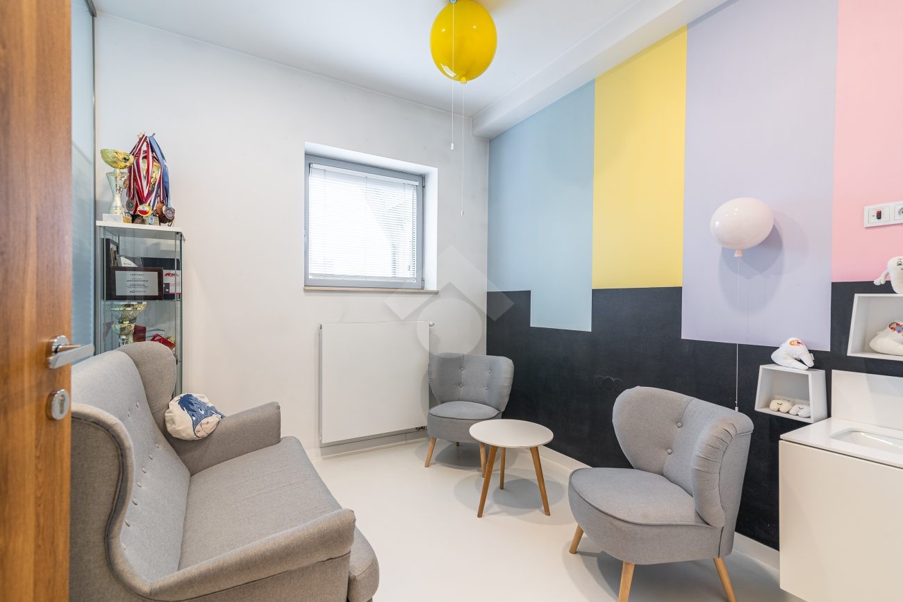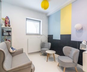 Jedna ze ścian gabinetu jest przeszklona z zamontowaną roletą, co umożliwia rodzicom oglądanie zabiegów ich dzieci.