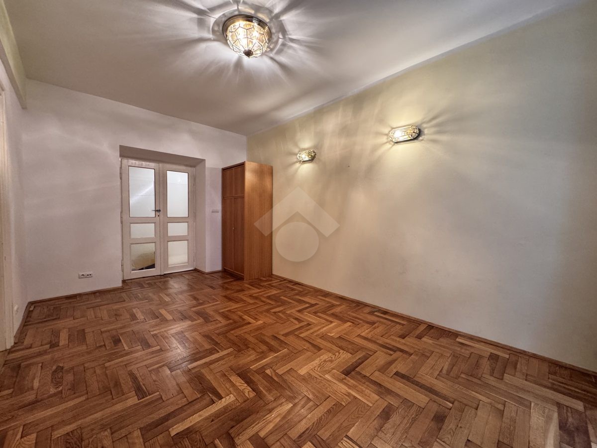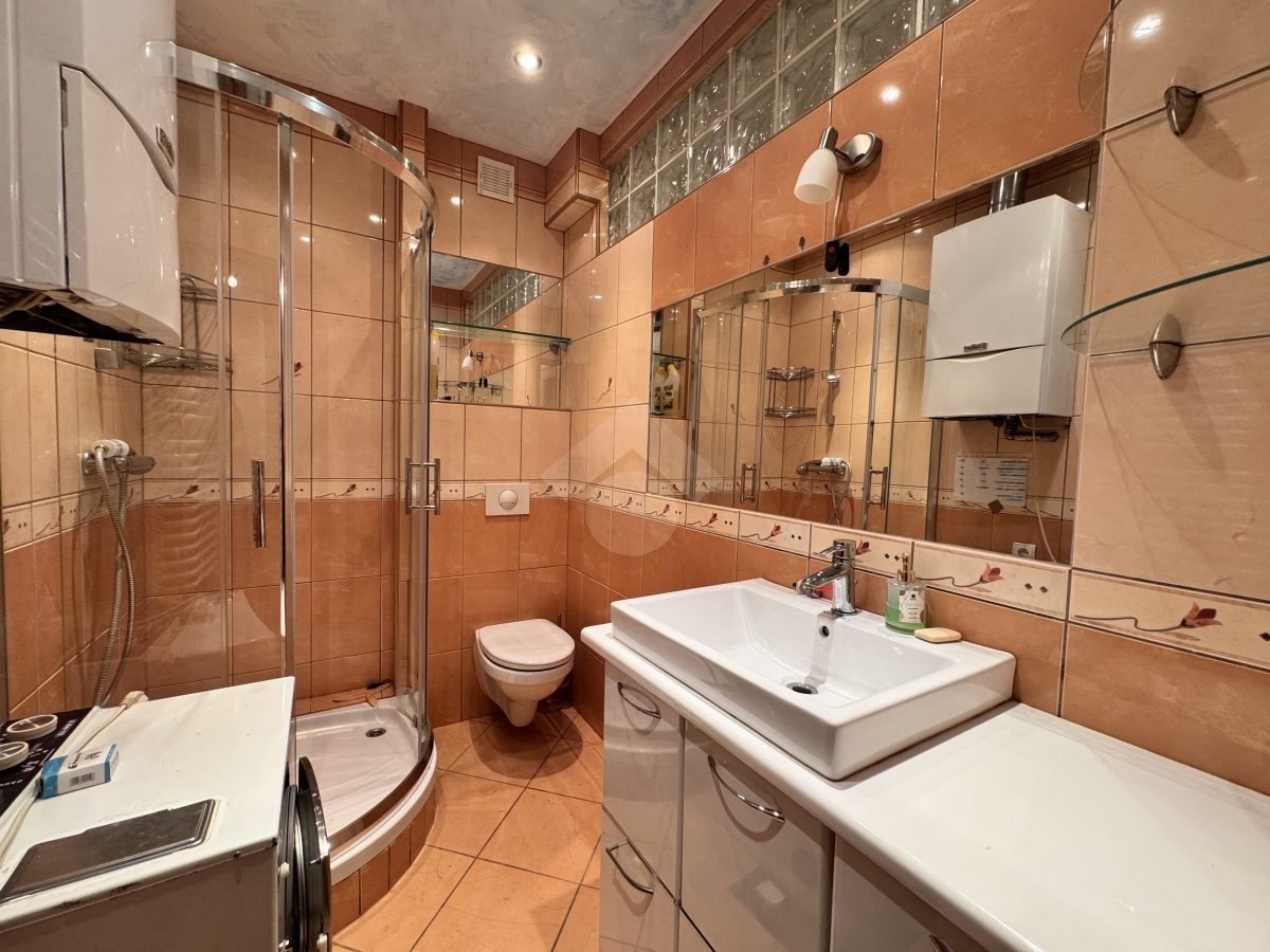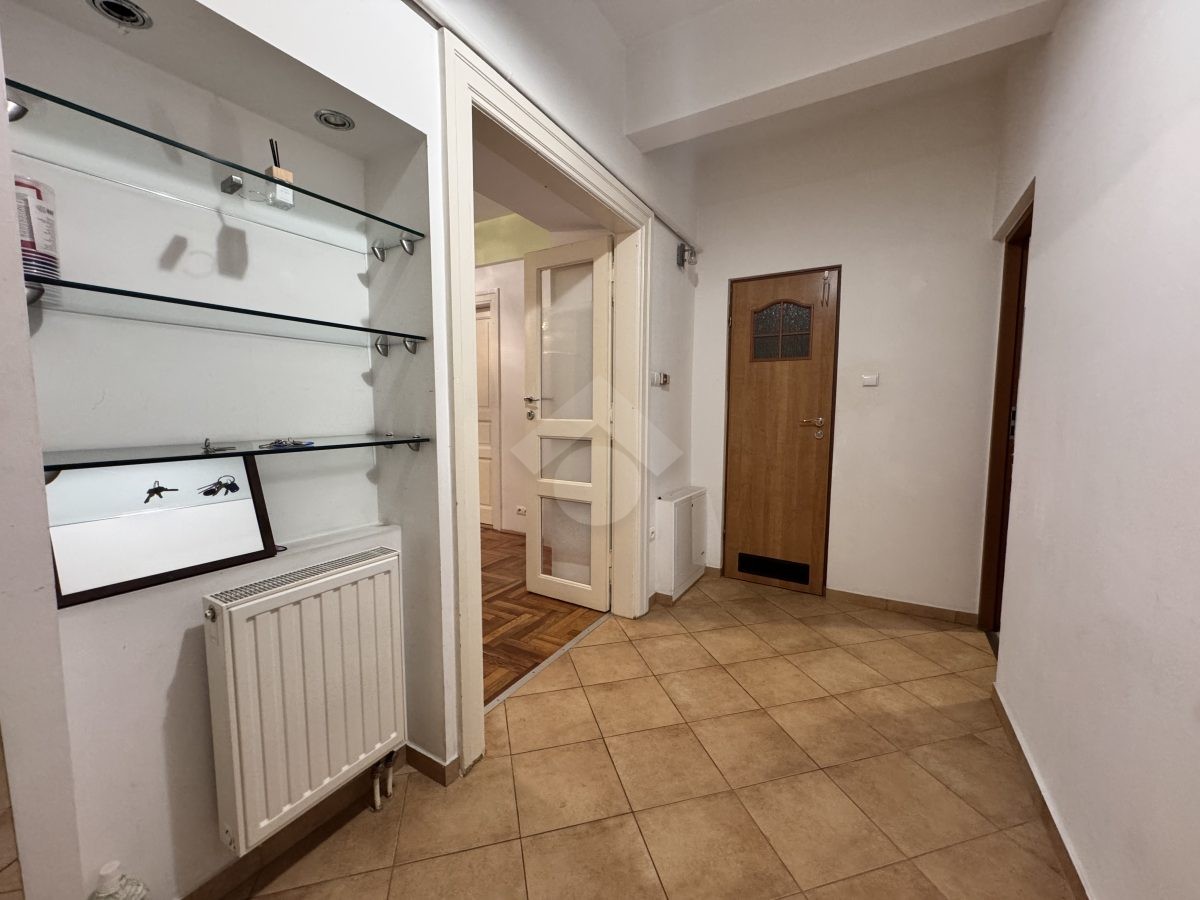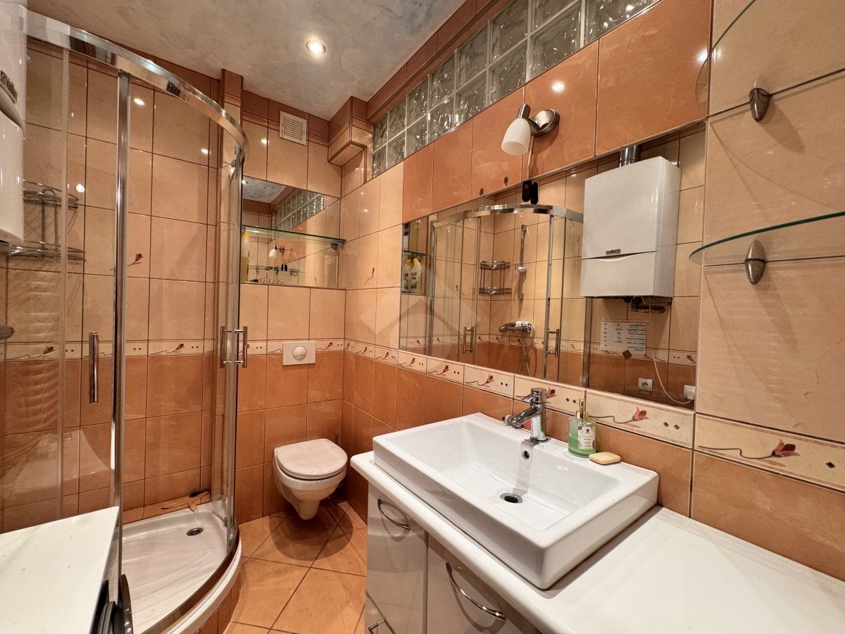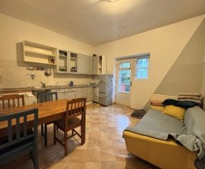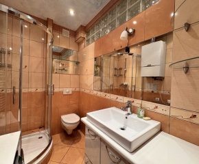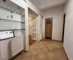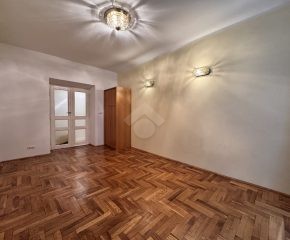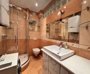 Mieszkanie w stanie dobrym – zachowana oryginalna stolarka drzwiowa oraz parkiet. W łazience znajduje się prysznic, umywalka oraz pralka i WC. W kuchni zabudowa meblowa wraz ze sprzętami AGD, w tym lodówka, płyta elektryczna, piekarnik, dodatkowo stół z czterema krzesłami oraz sofa.