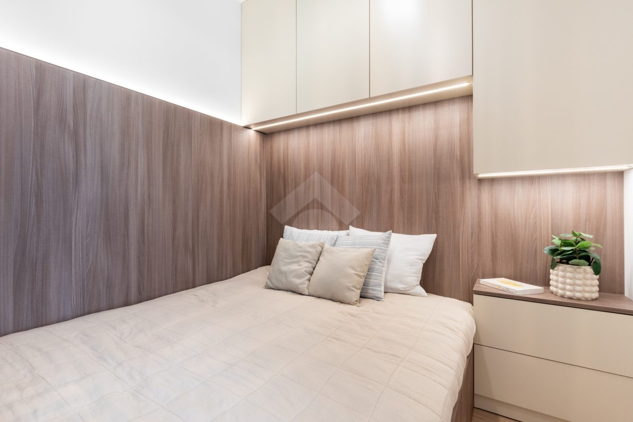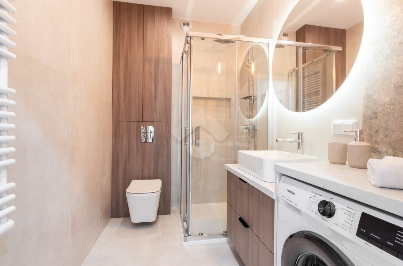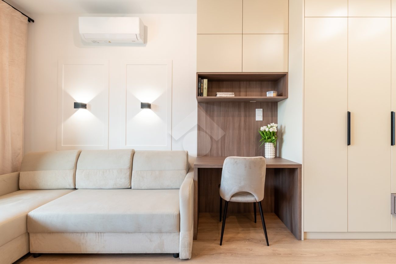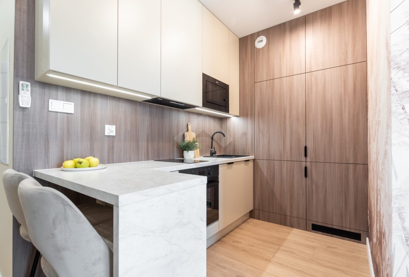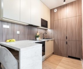 Bardzo dobry – w części aneksu kuchennego zabudowa kuchenna na wymiar wyposażona w podstawowe sprzęty AGD (zmywarka, piekarnik, płyta indukcyjna, lodówka). W łazience znajduje się prysznic, umywalka, pralka oraz WC. W mieszkaniu zamontowana została klimatyzacja.