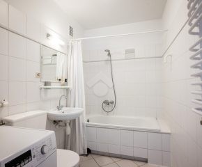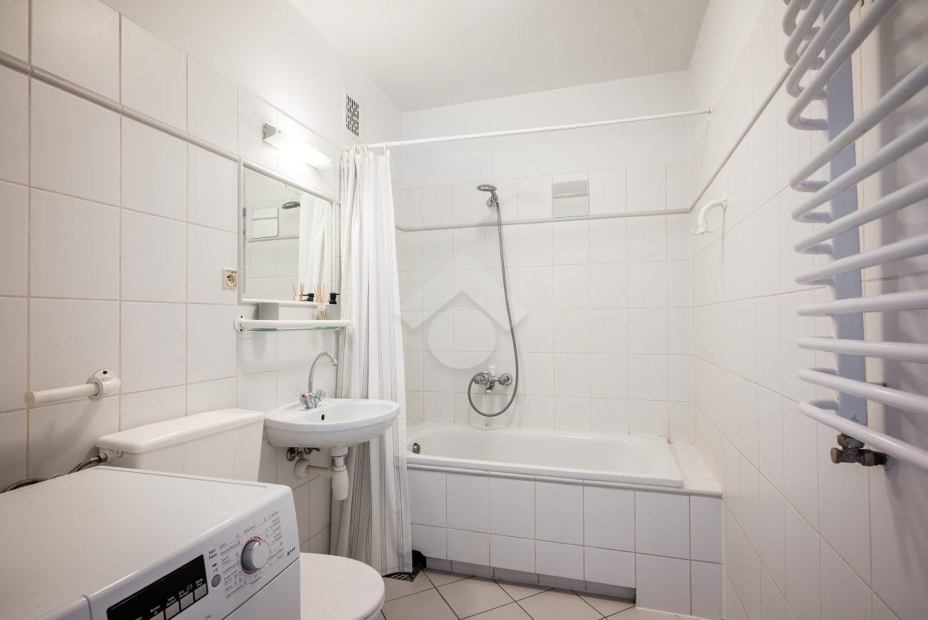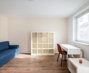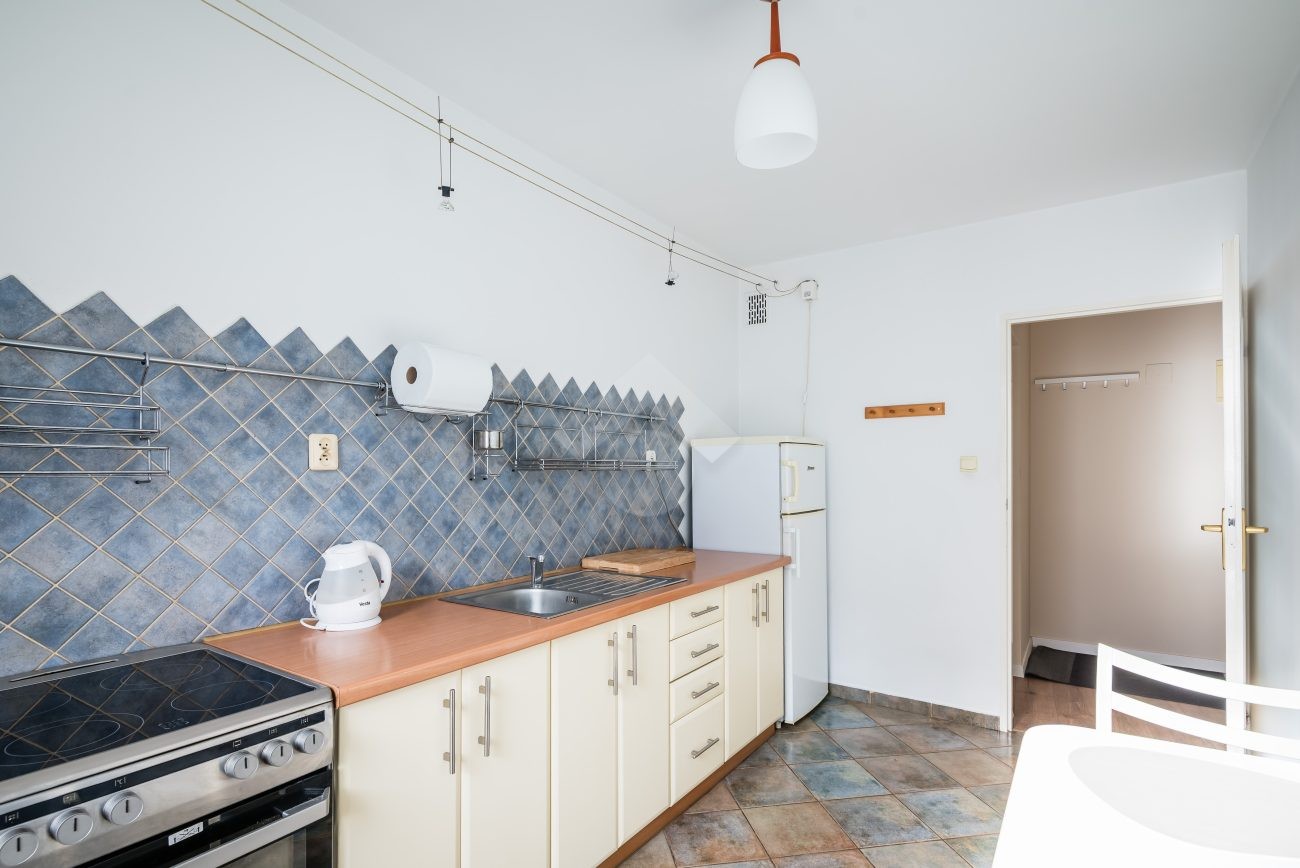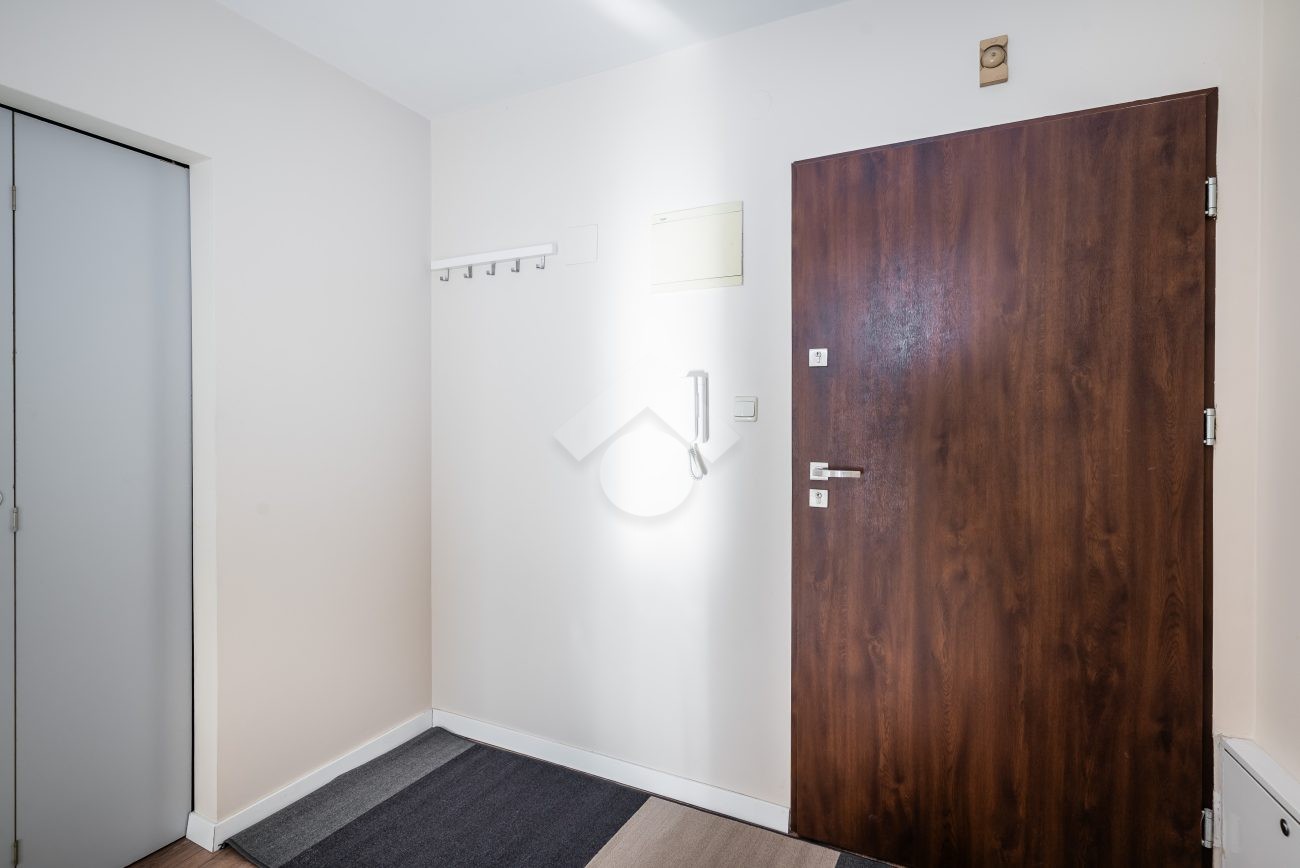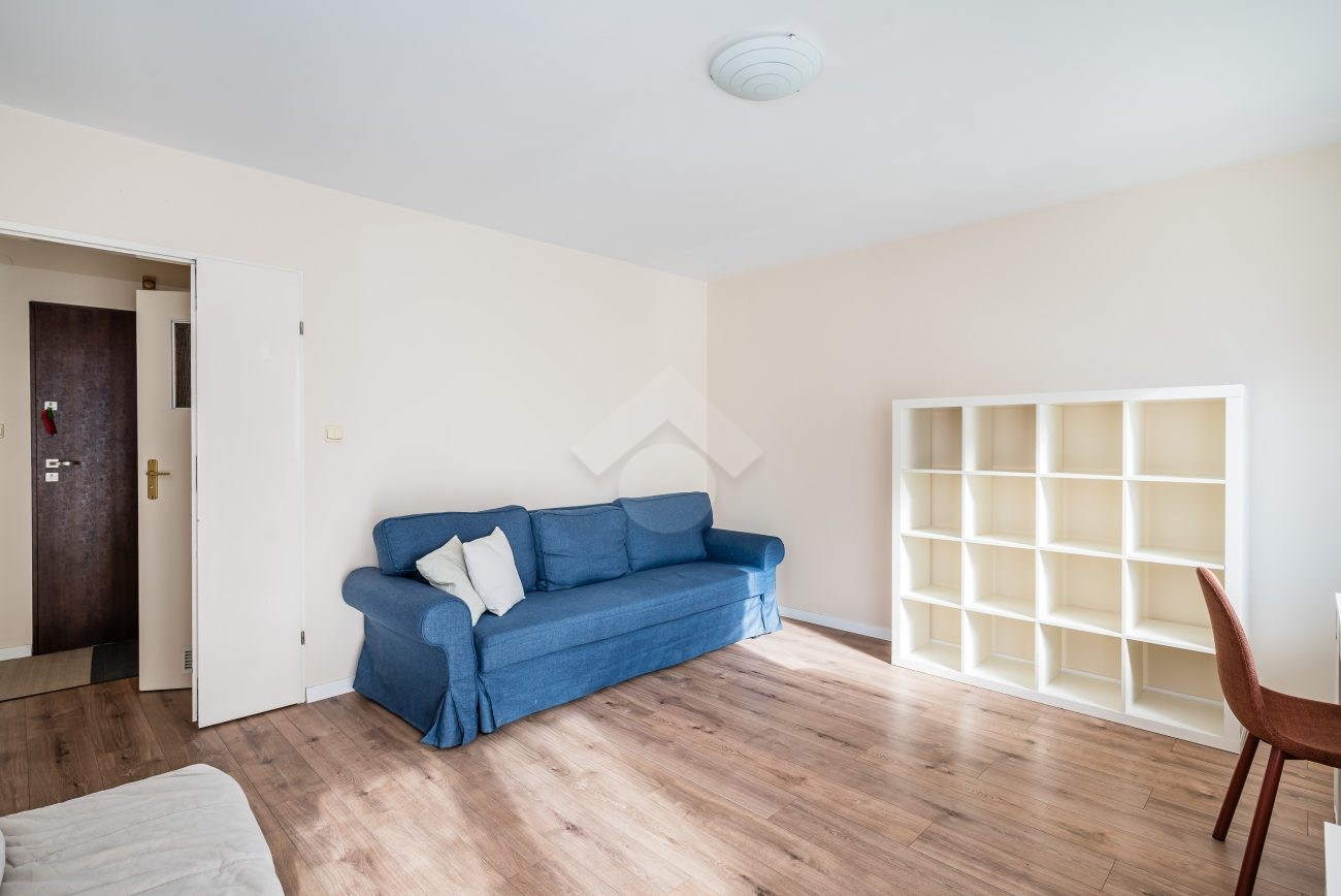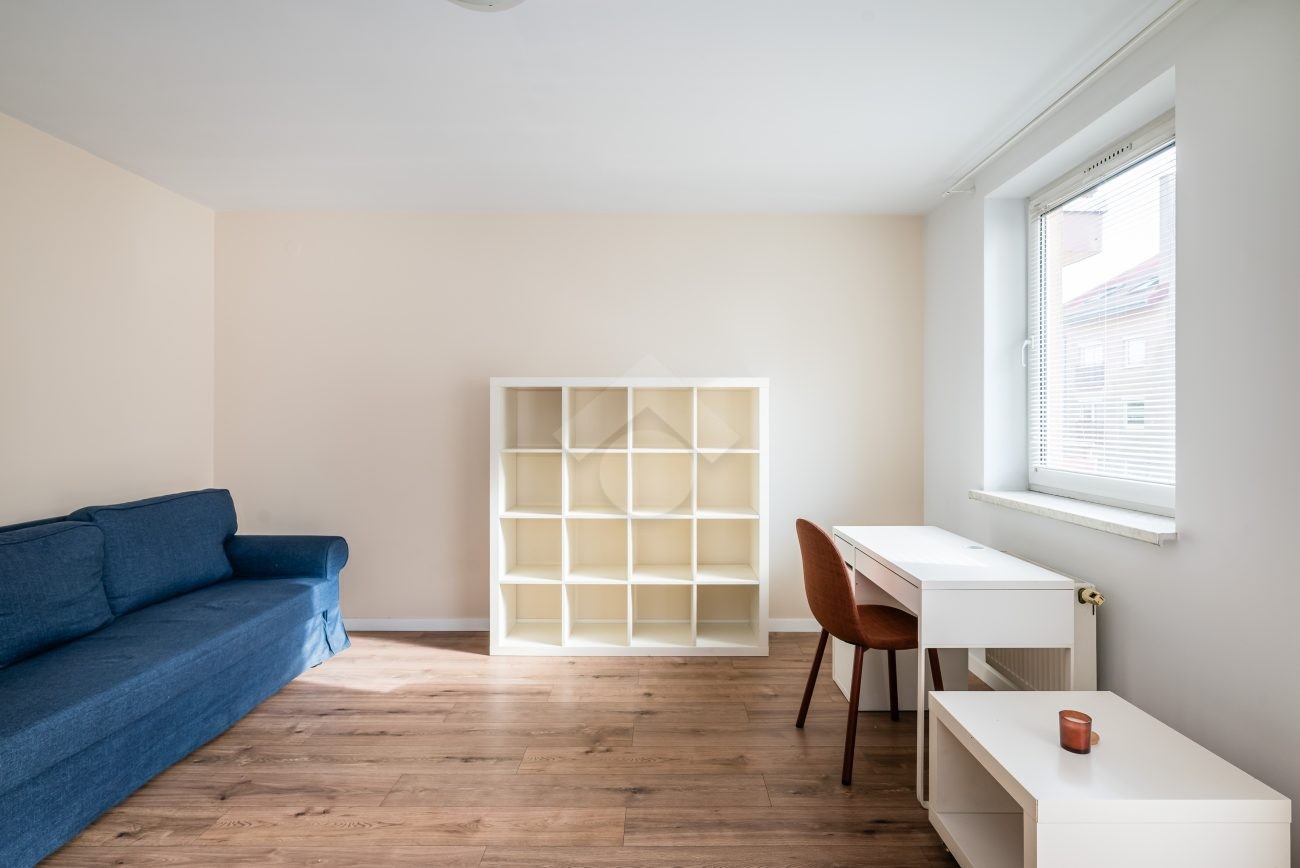 Ready to move in. The kitchen is equipped with a fridge, electric stove, oven, and a table with two chairs. The living room features a fold-out sofa bed, a desk with a chair, a TV stand, and a shelving unit. The bathroom includes a washing machine and a bathtub. Laminate flooring in the room and hallway; tiles in the kitchen and bathroom. The apartment and water are heated from the municipal heating network (MPEC). The property has southern exposure.