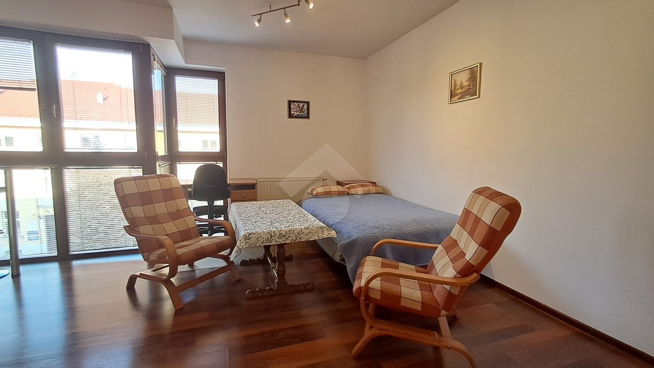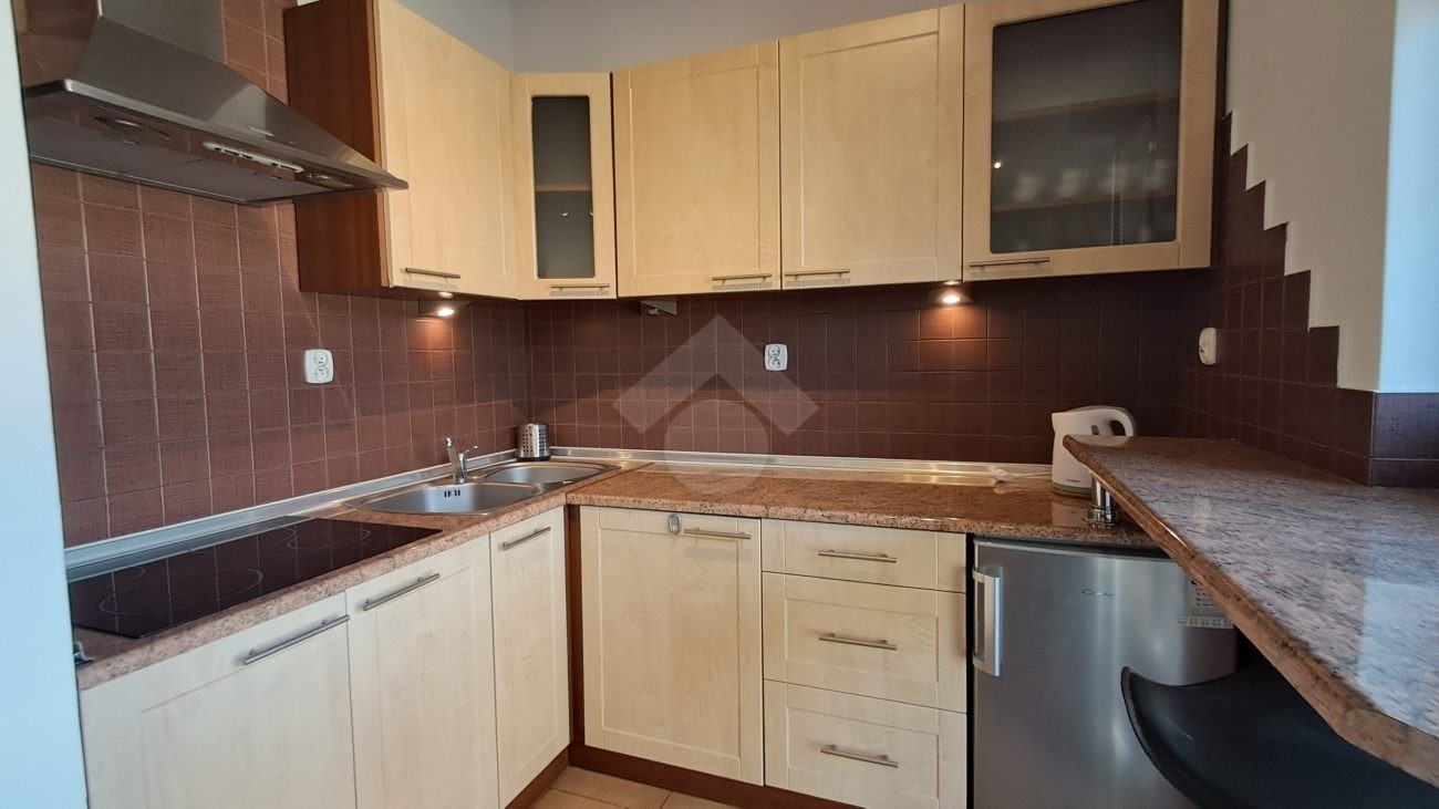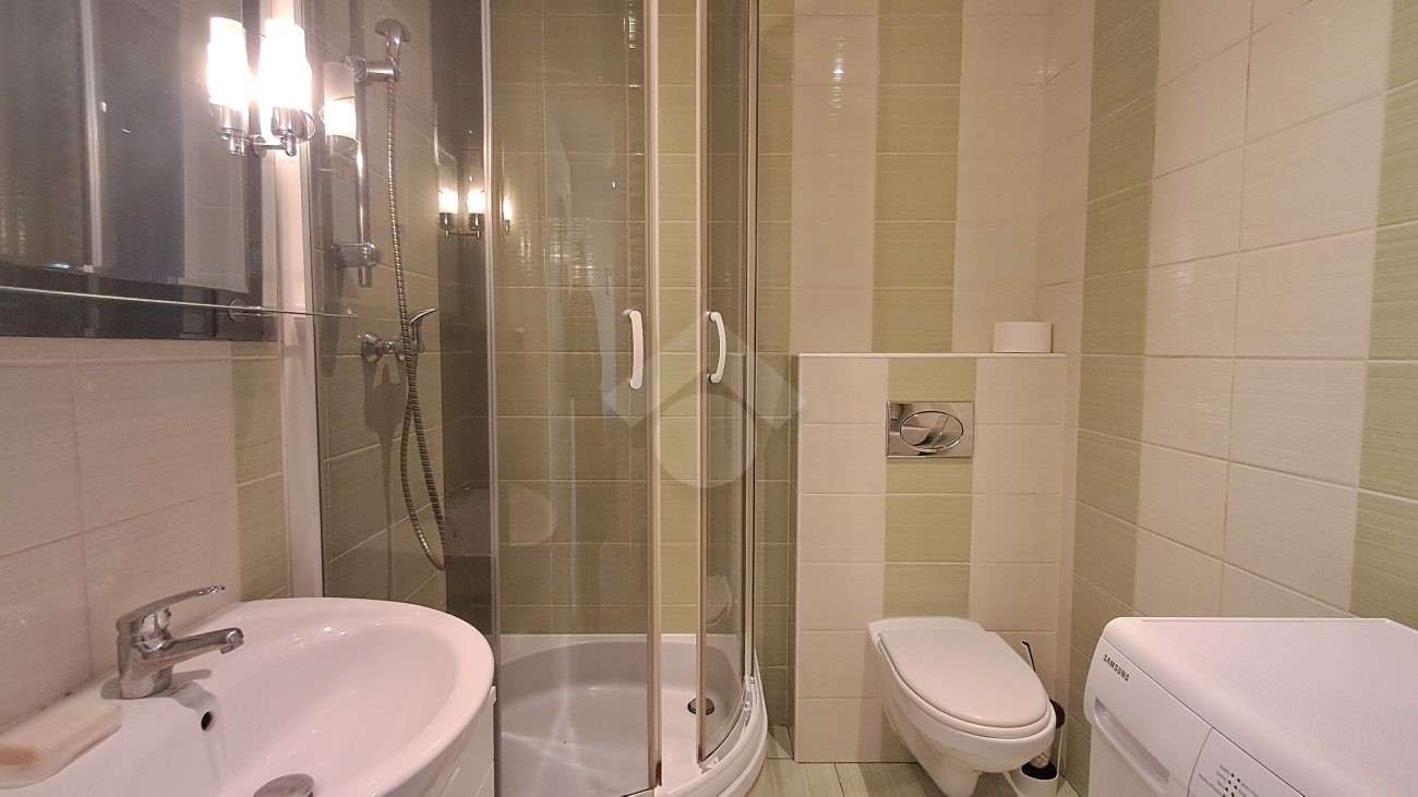 Nieruchomość jest w bardzo dobrym stanie. W pokoju znajduje się łóżko, stół oraz fotele i komoda, kuchnia w zabudowie na wymiar, wraz ze sprzętami AGD. W łazience znajduje się prysznic, umywalka, pralka oraz WC.