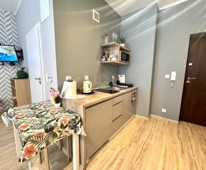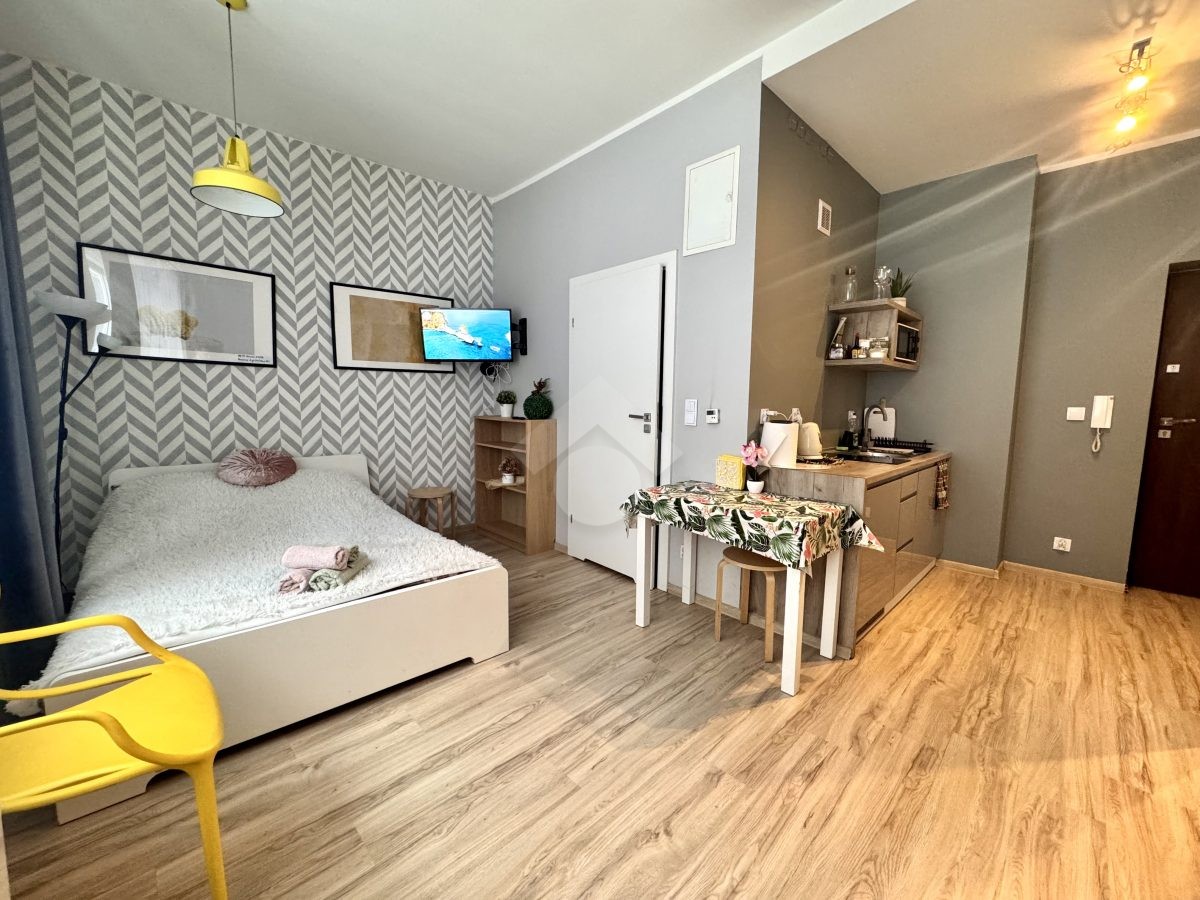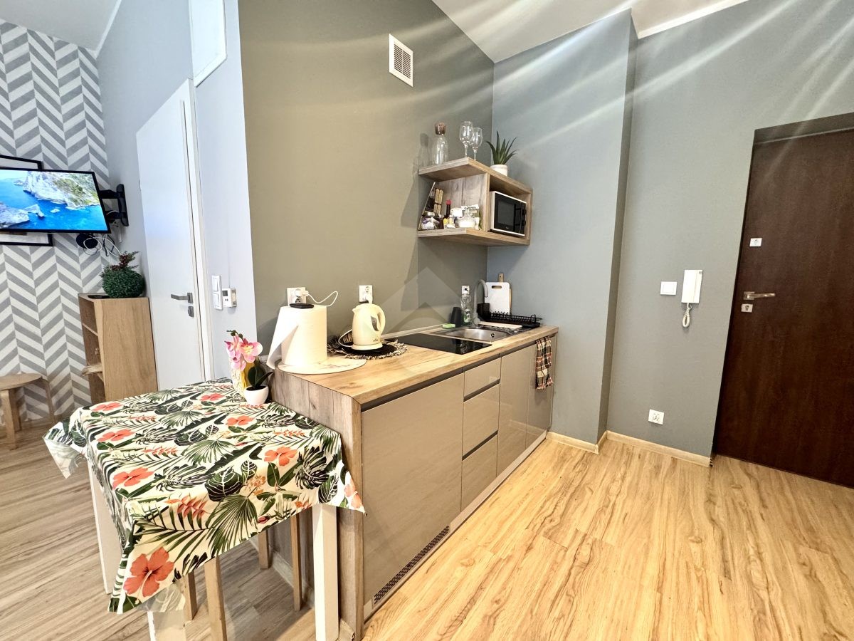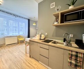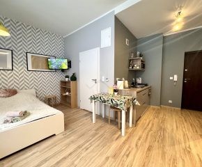 Mieszkanie w stanie bardzo dobrym. Na podłogach w przedpokoju i pokoju panele, aneks kuchenny wyposażony został w sprzety AGD m. in. płytę elektryczną, mikrofalówkę czy lodówkę. W pokoju znajduje się duża szafa z lustrem, łózko oraz sofa. Łazienka została wyposażona w prysznic, umywalkę oraz WC.